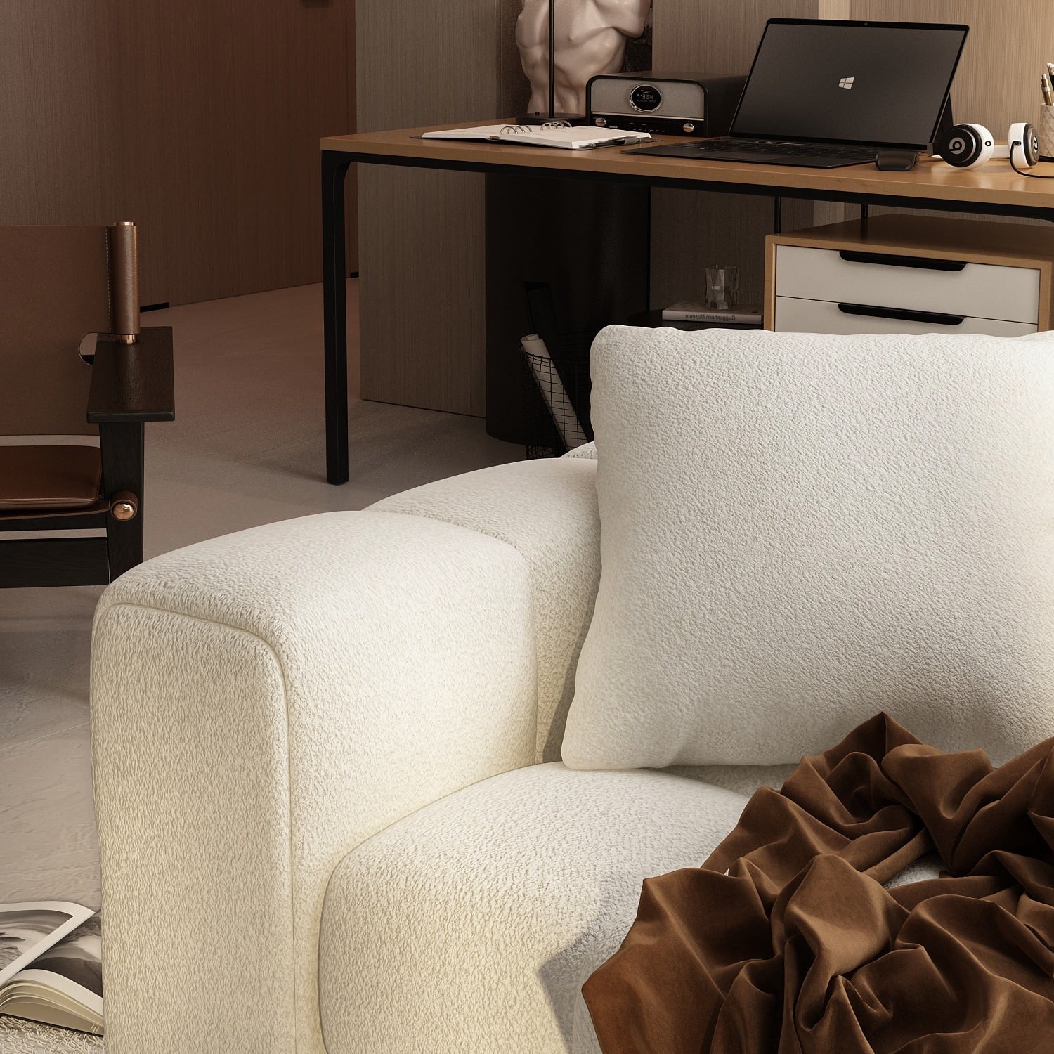 Canapé Teddy en velours blanc avec cadre en bois de 100,8 W pour 4 personnes