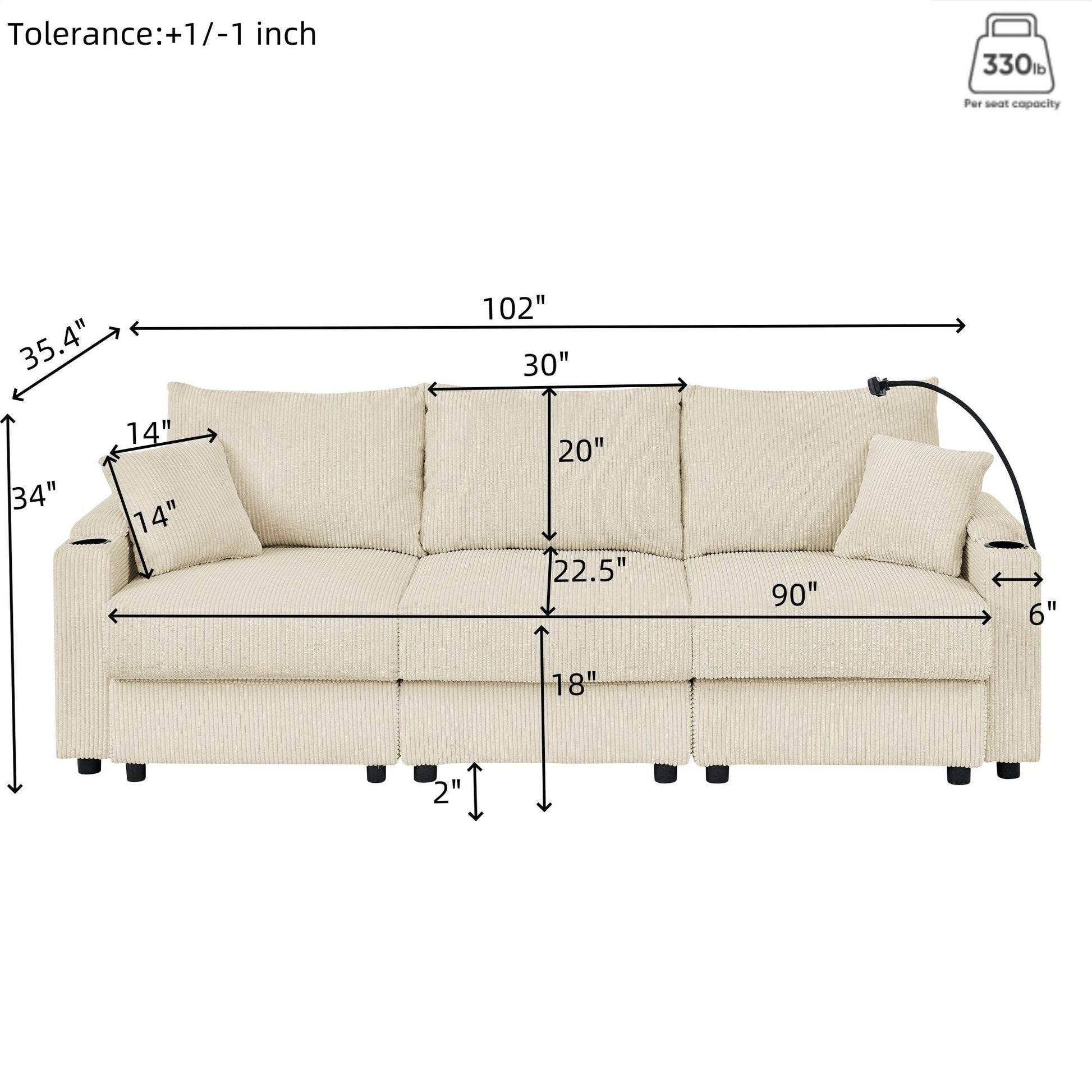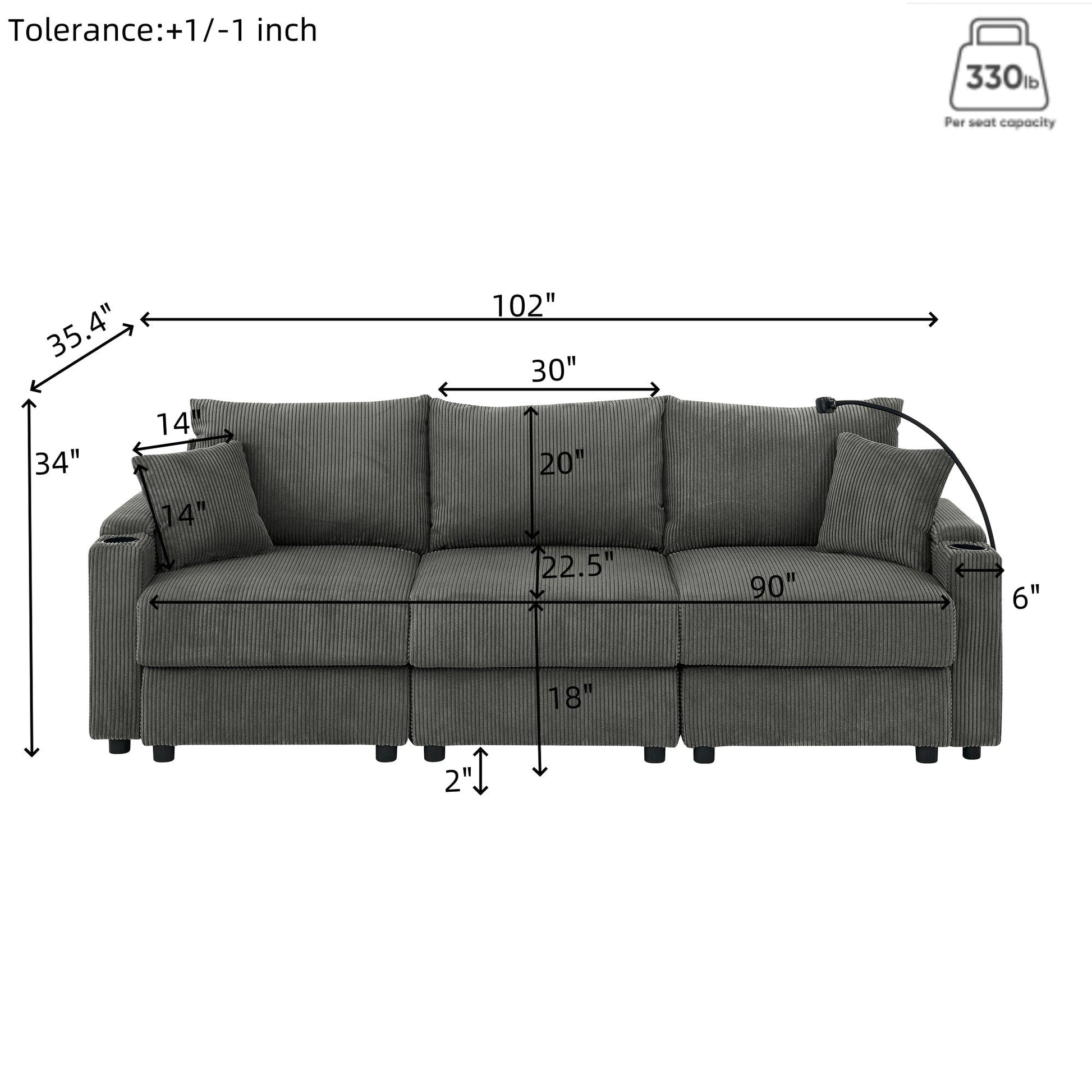 Canapé 3 places moderne en velours côtelé 102, siège profond avec porte-gobelets et support pour téléphone
