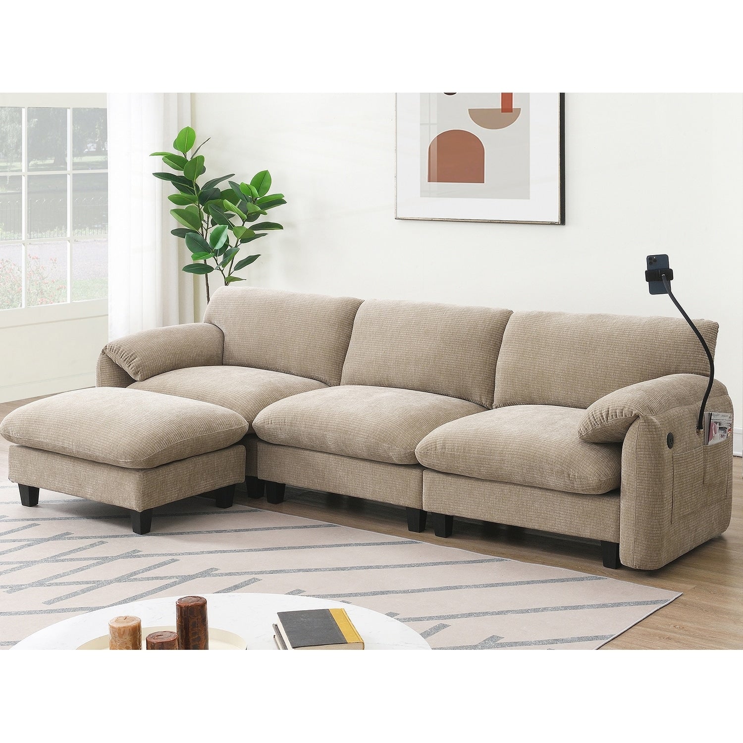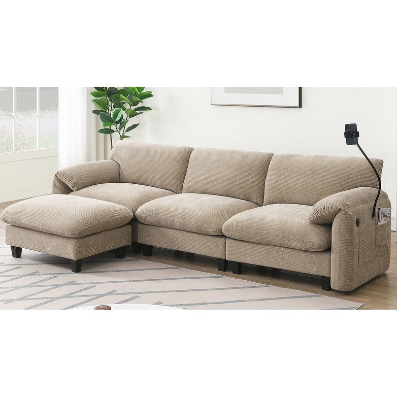 Poches de rangement latérales, chargeur USB et support pour téléphone : Conçu avec des poches de rangement de chaque côté, ce canapé permet de garder facilement à portée de main les objets essentiels comme les livres, les magazines ou les télécommandes. Pratiques au quotidien, ces deux accessoires contribuent à réduire l'encombrement et à mieux organiser votre espace de vie. Accoudoirs pratiques : Les coussins d'accoudoirs de chaque côté du canapé offrent un soutien et un confort accrus pour vos bras et vos épaules. Ils offrent un endroit où reposer vos bras en position assise, facilitant ainsi le maintien d'une posture détendue. Pouf amovible : Le canapé est livré avec un pouf amovible, repositionnable selon vos besoins. Qu'il soit utilisé comme siège d'appoint, repose-pieds ou table basse, le pouf ajoute de la polyvalence à l'agencement. Vous pouvez le déplacer où vous le souhaitez dans la pièce selon vos préférences ou le modifier selon vos envies.