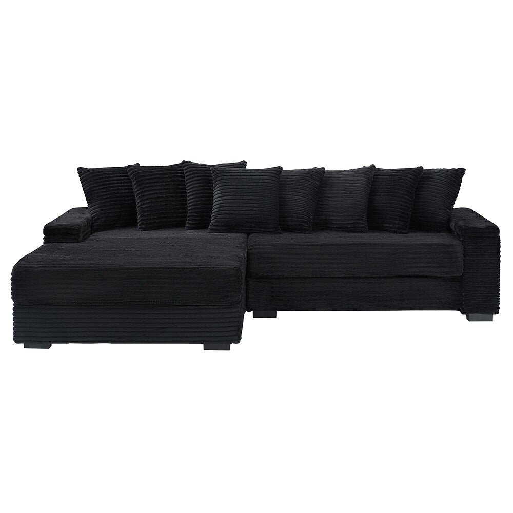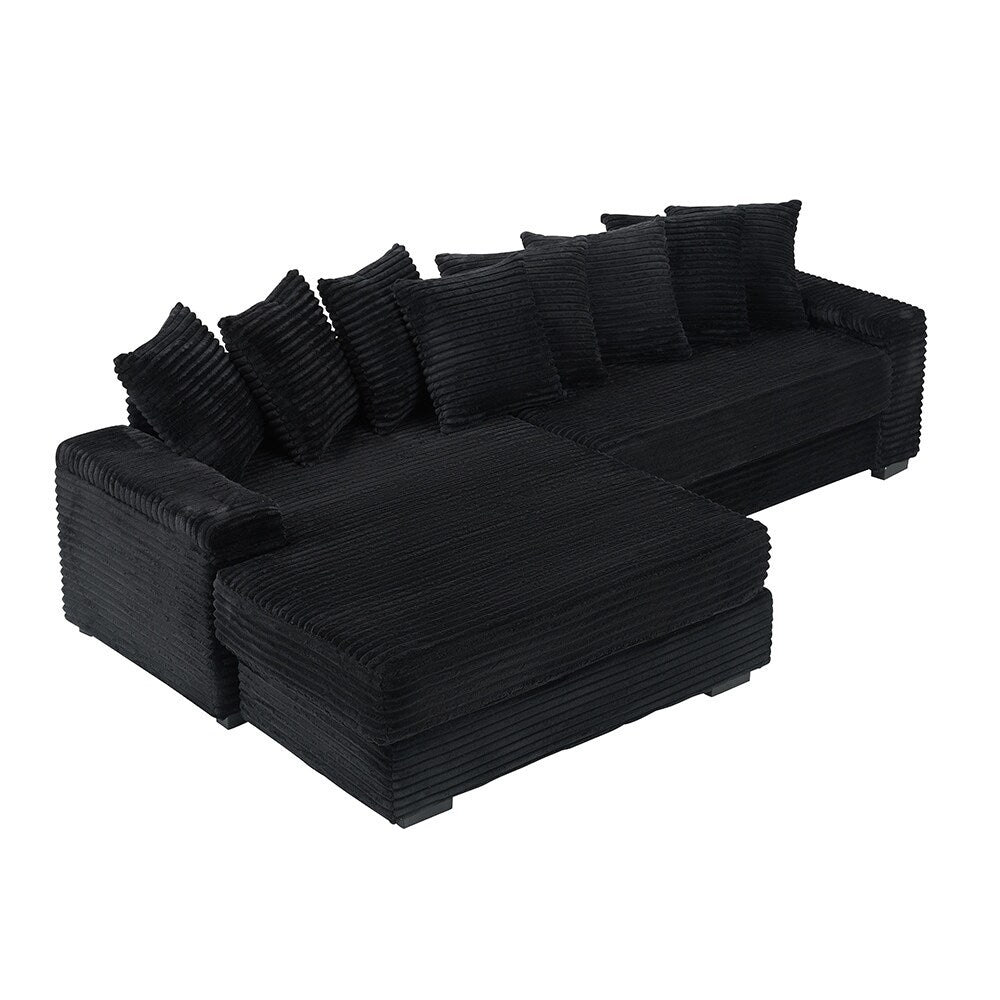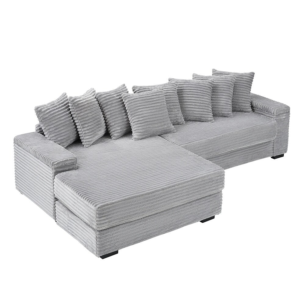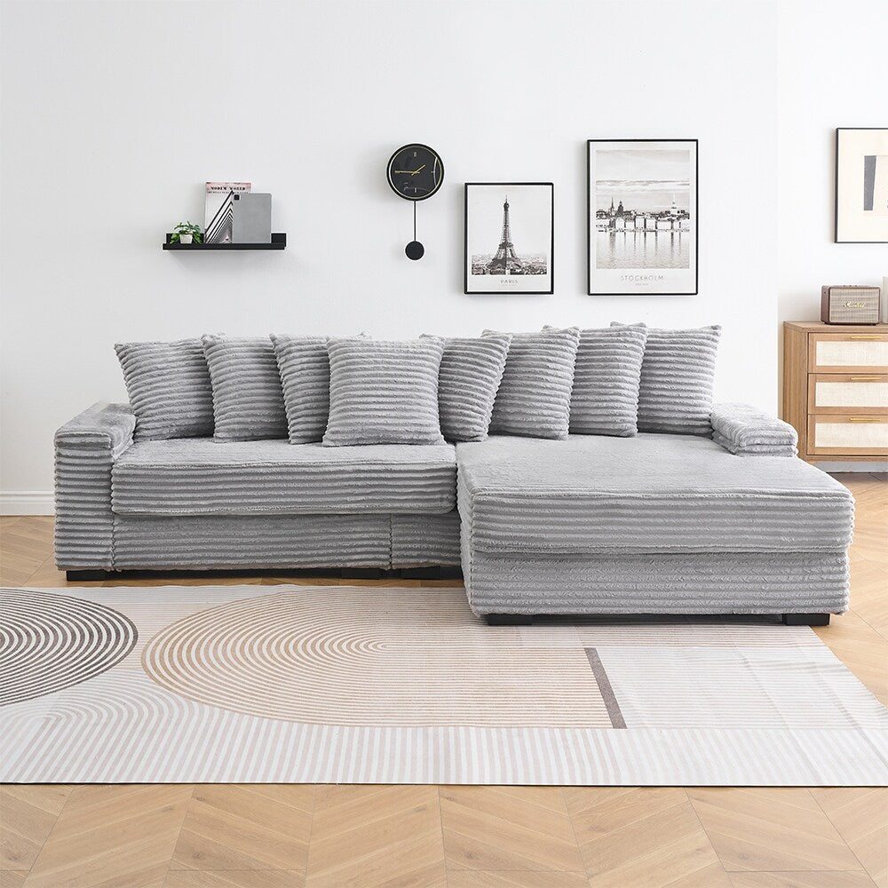 - Ce canapé en flanelle en forme de L de 111,4 pouces allie un design moderne à un confort douillet, avec un tissu en velours côtelé doux, un rembourrage en éponge haute densité et huit coussins moelleux pour une sensation chaleureuse et invitante.