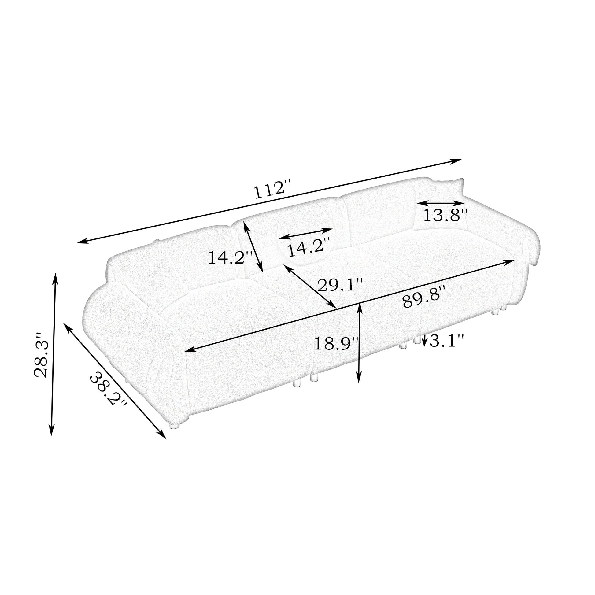 Canapé 3 places en tissu Teddy de 112 pouces avec 3 oreillers, résistant aux rayures, avec rembourrage moelleux et pieds en métal