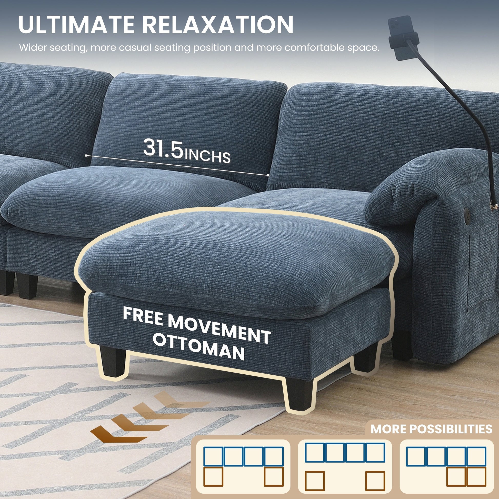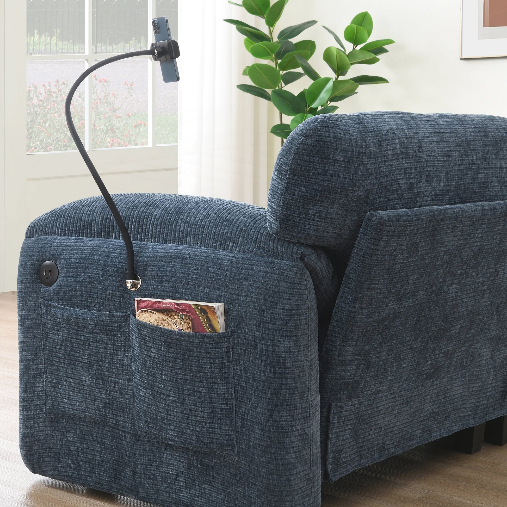 Support et chargeur de téléphone : Le support de téléphone fixe les appareils pour éviter qu'ils ne glissent dans les espaces entre les canapés, sans nécessiter de supports séparés. L'accoudoir s'adapte à la morphologie du corps. Les chargeurs sont dotés de ports intégrés, ce qui élimine les multiprises et le souci de la batterie.