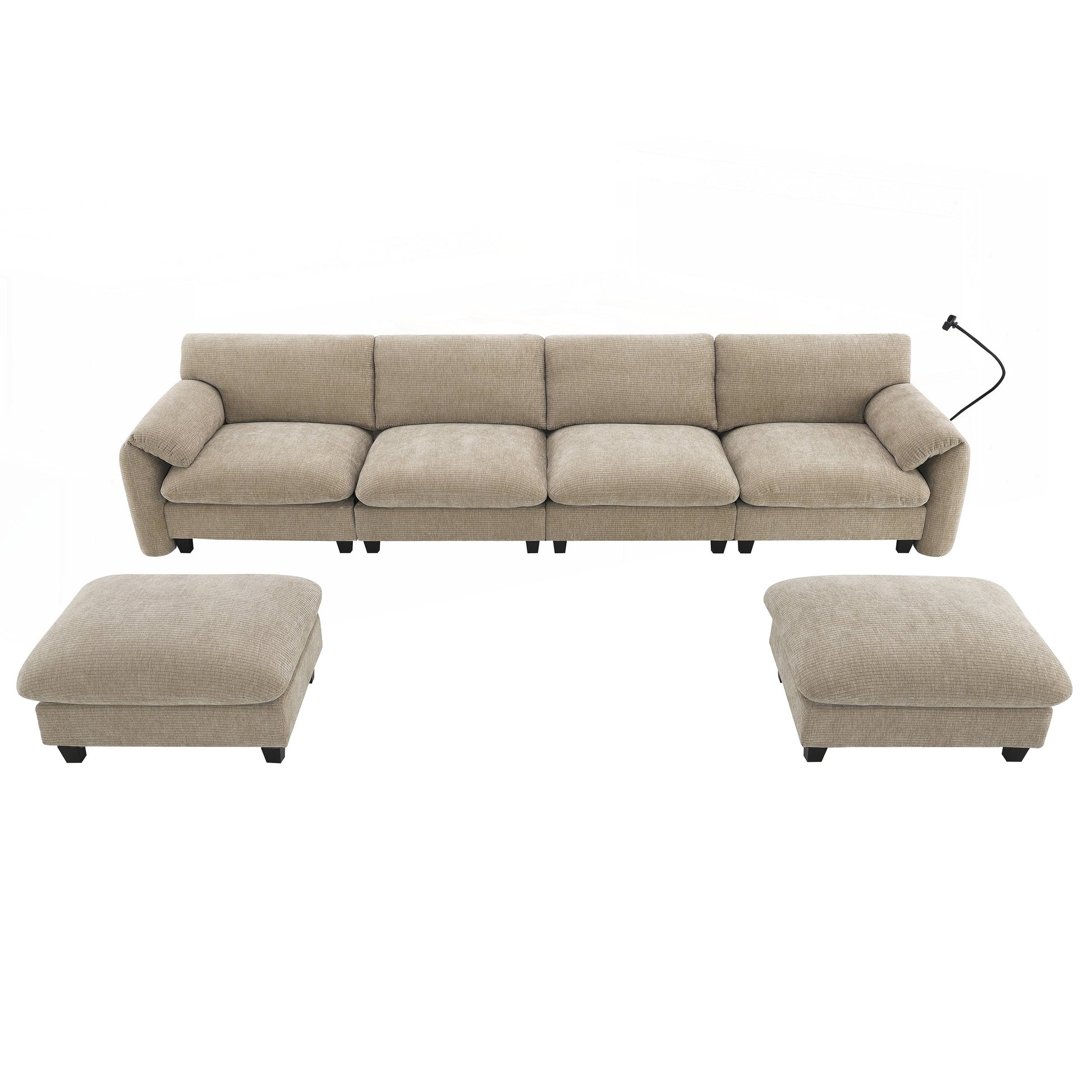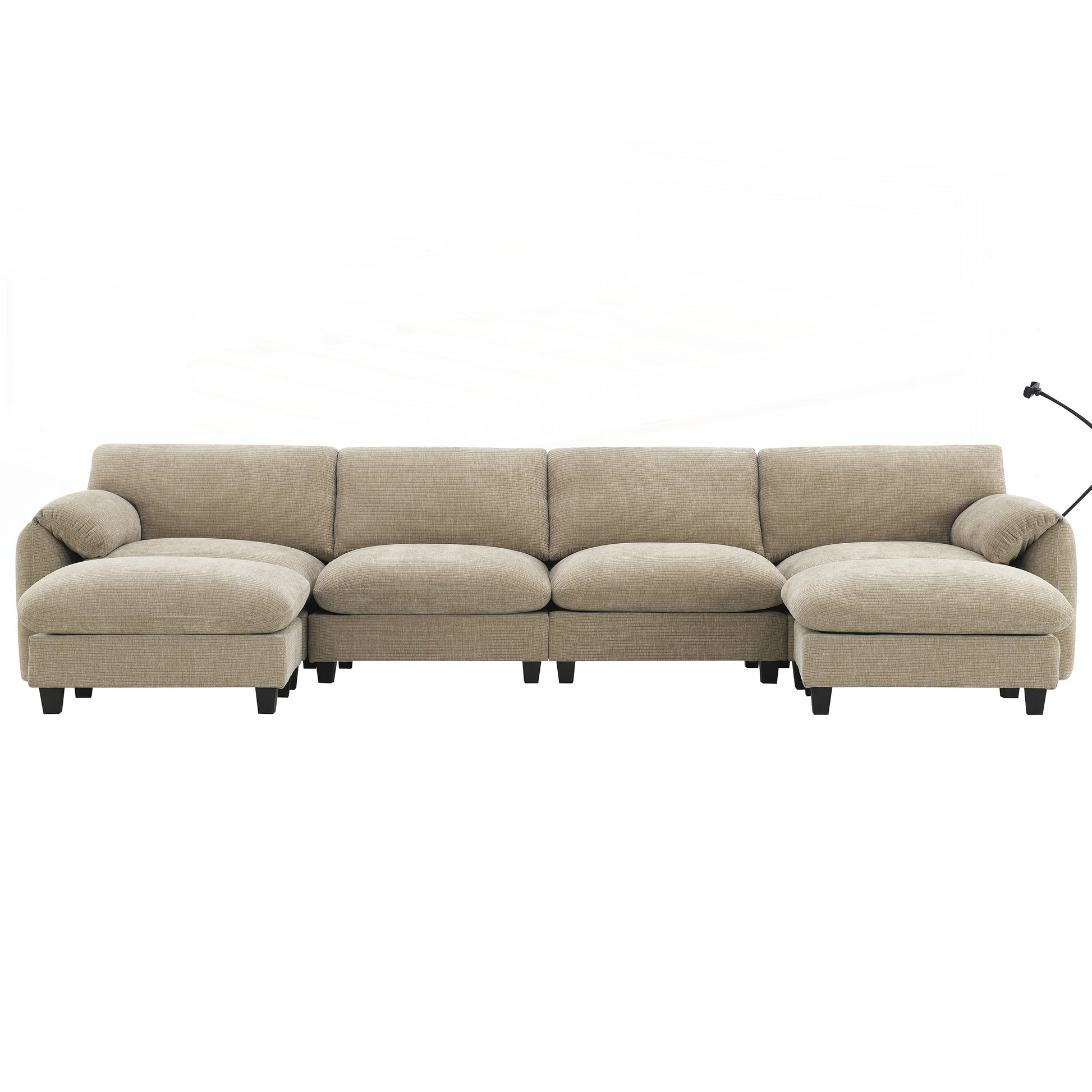 Offrez-vous le luxe avec notre canapé modulable. L'accoudoir est équipé d'un sac de rangement pratique, d'un support pour téléphone portable et de ports de recharge filaire et sans fil, vous permettant de profiter rapidement et facilement de vos services. Des coussins d'accoudoir moelleux et une assise spacieuse aux dimensions extra-larges et profondes complètent le confort. Le canapé est composé de cinq éléments modulaires à combiner librement. Il est équipé de deux poufs amovibles. La liberté de combinaison des différentes formes permet de mieux s'adapter à l'agencement et à l'espace de votre pièce.