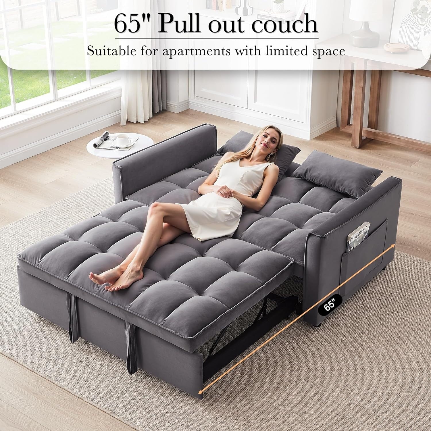 Canapé-lit convertible 3 en 1 - Canapé futon en velours avec dossier réglable, poche latérale et fonction gigogne, gris foncé