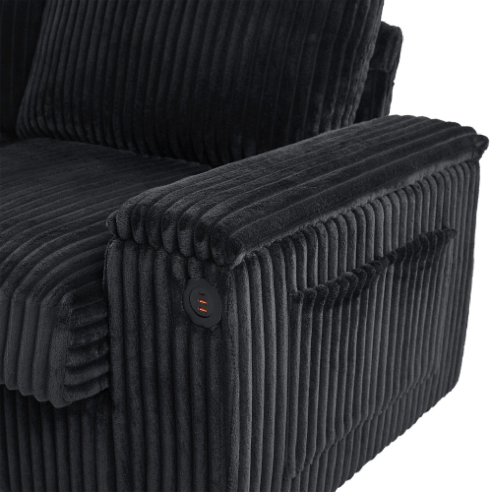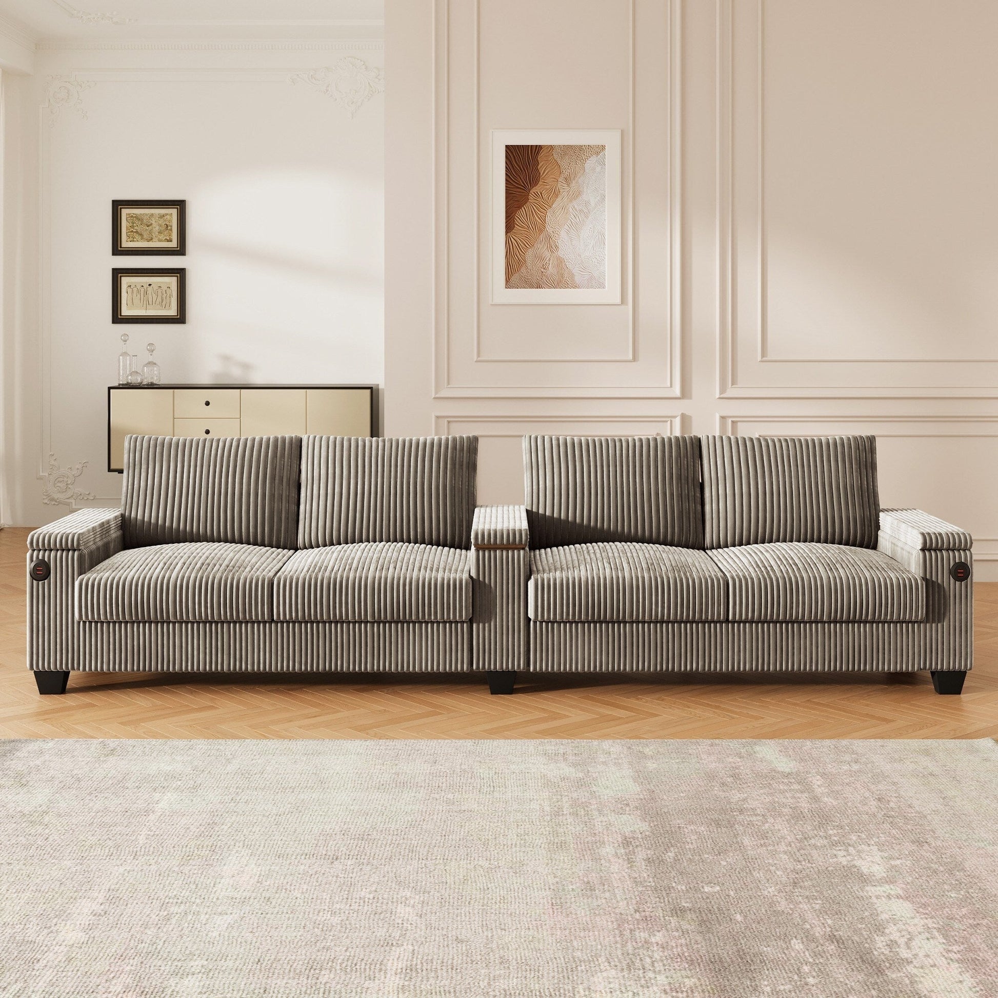 Canapé 4 places moderne en velours côtelé avec ports USB, rangement dissimulé et porte-gobelets rabattables