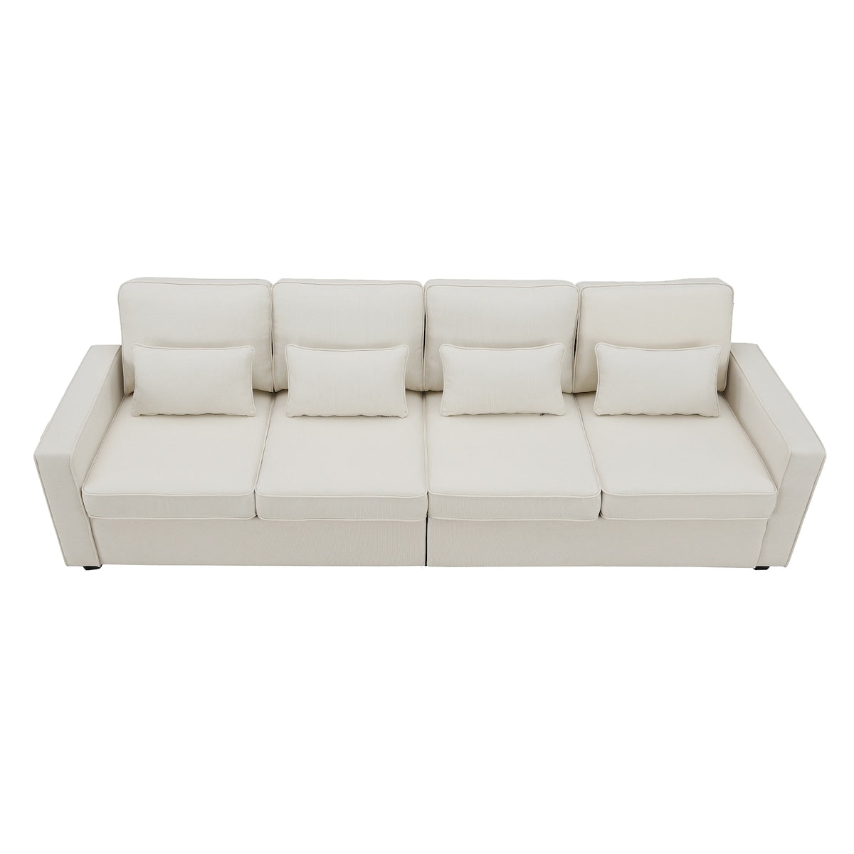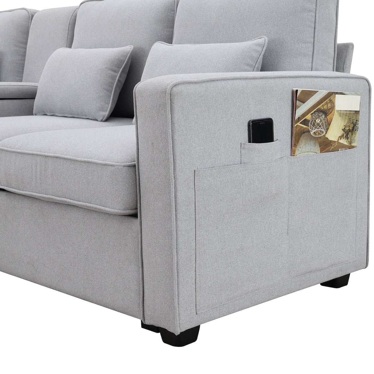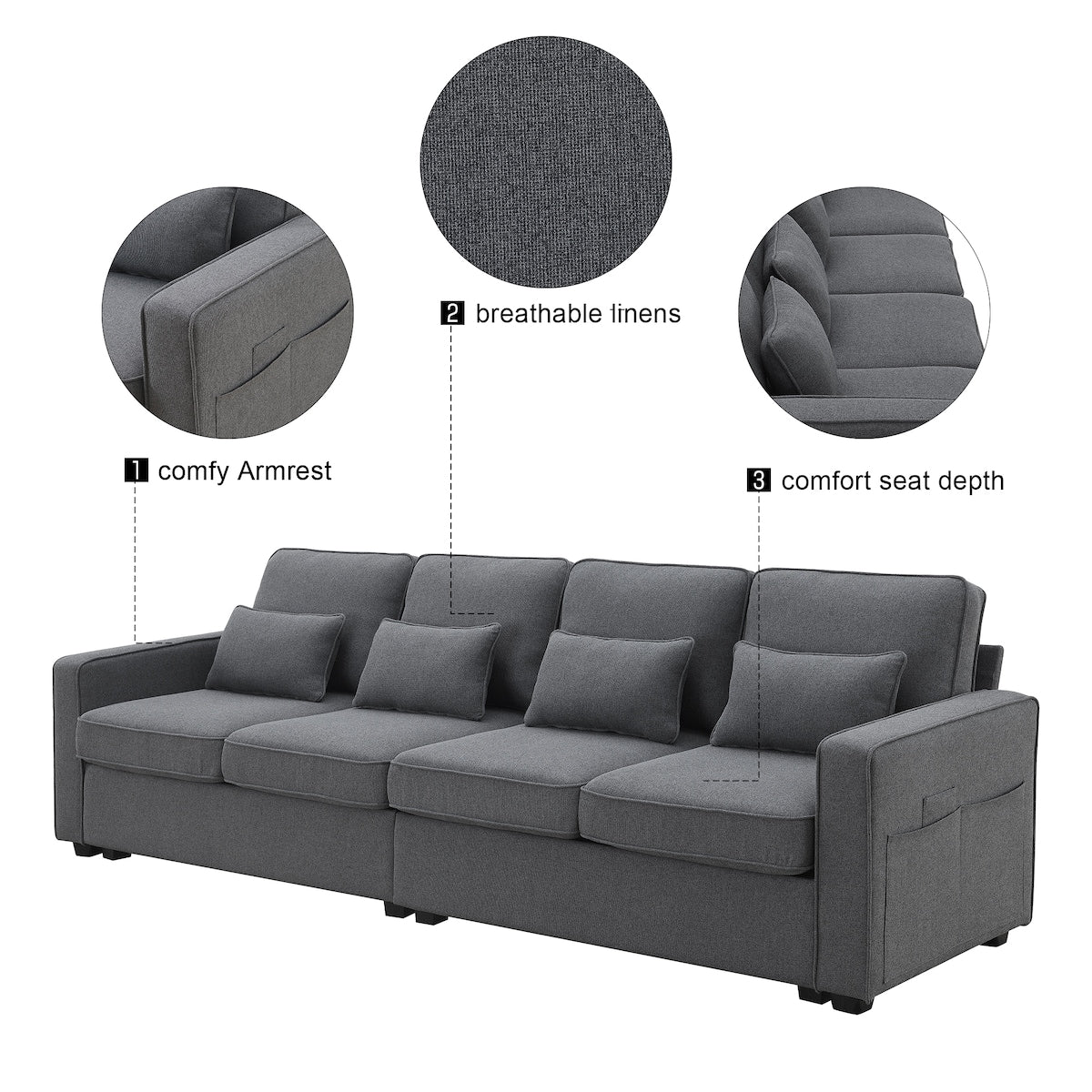 Canapé 4 places moderne en lin avec poches d'accoudoirs et 4 oreillers