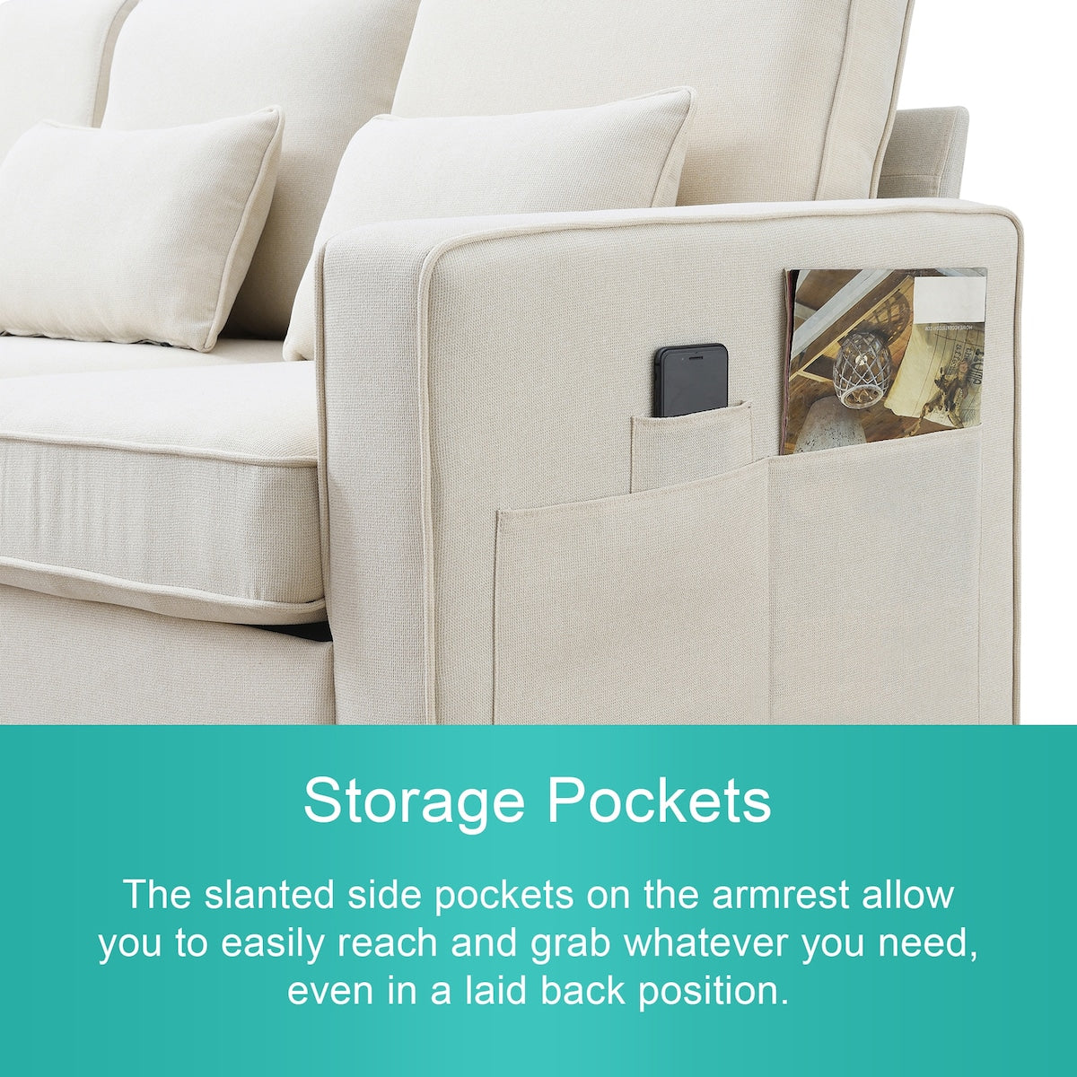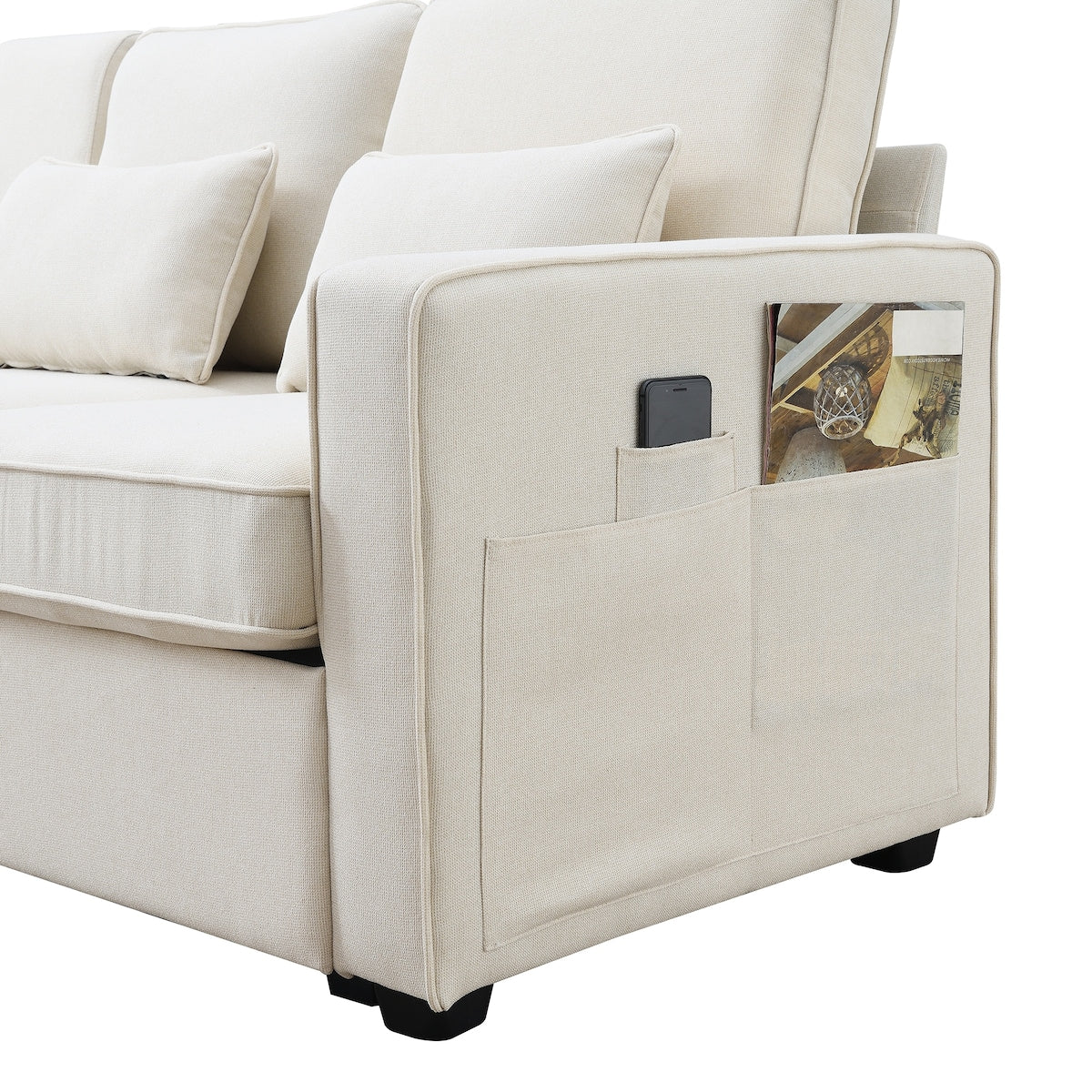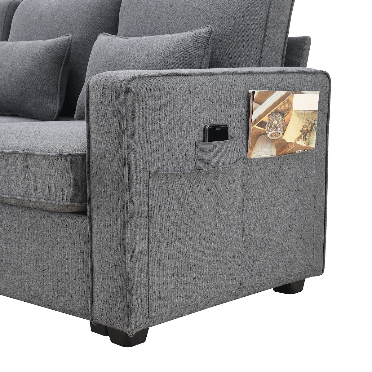 Plus d'espace de rangement : pour rendre l'environnement plus soigné, le canapé dispose de quelques poches de rangement sur le côté pour ranger des magazines, des téléphones, des télécommandes ou autres.
