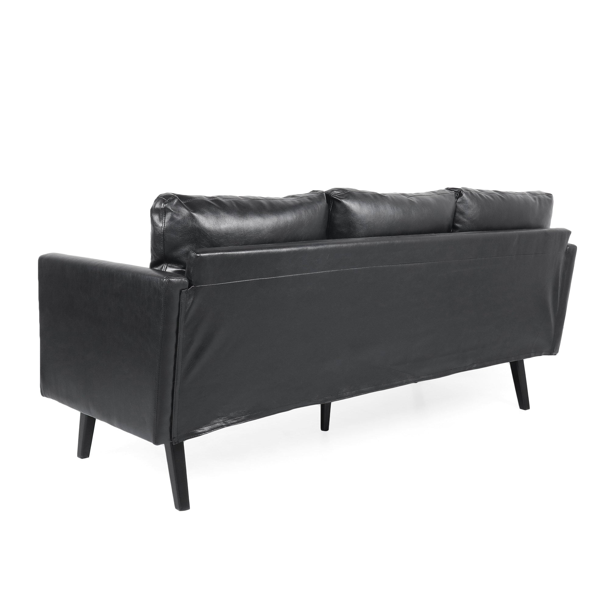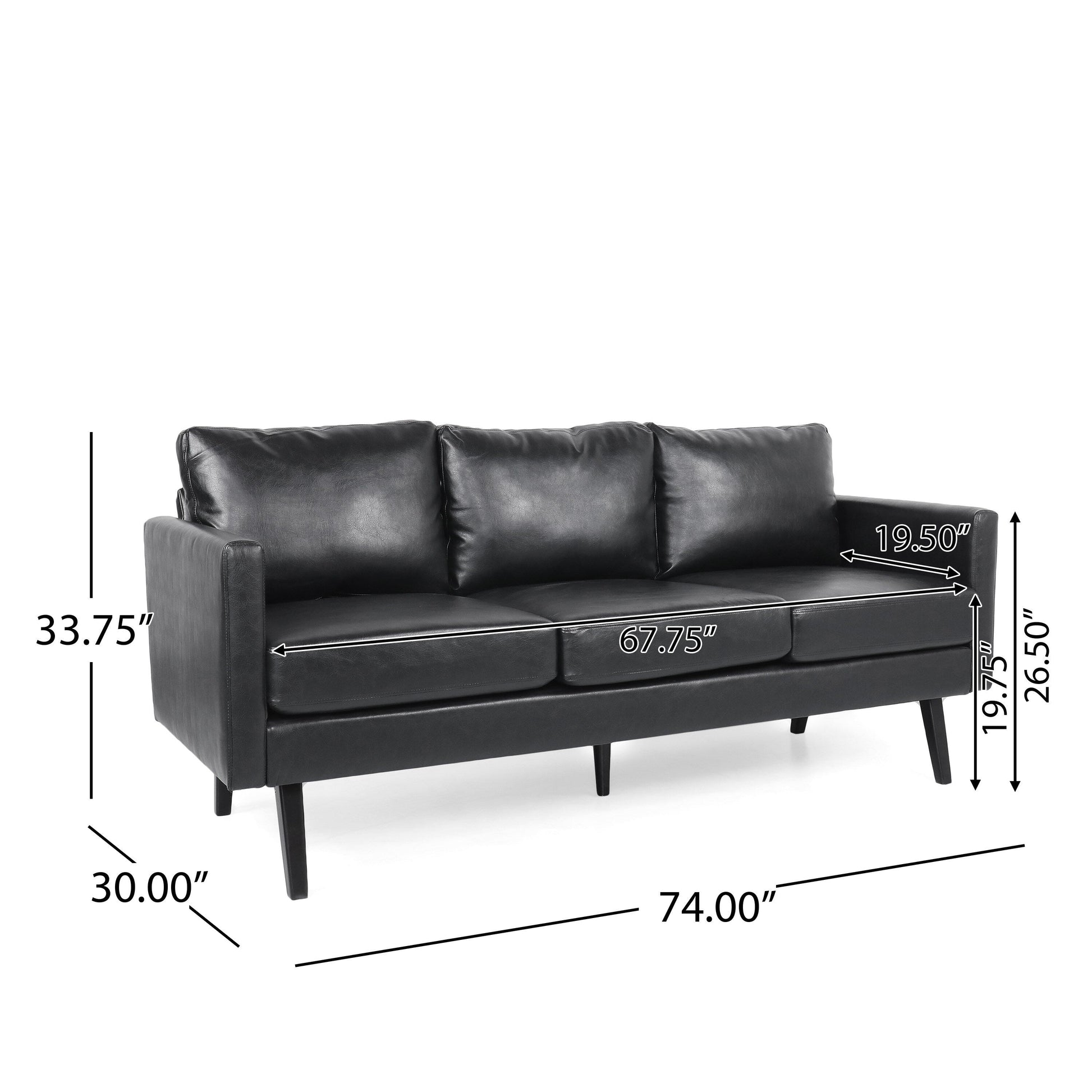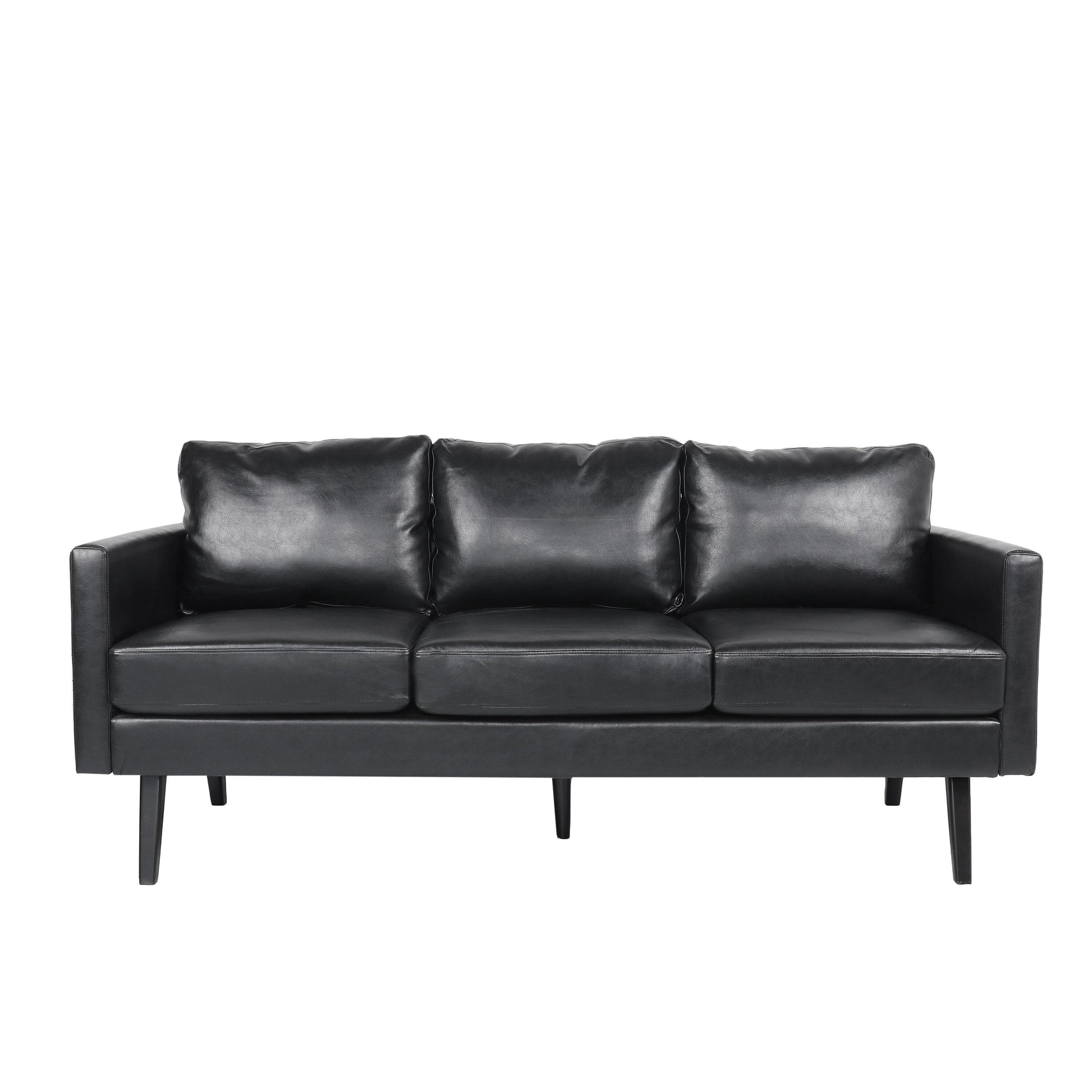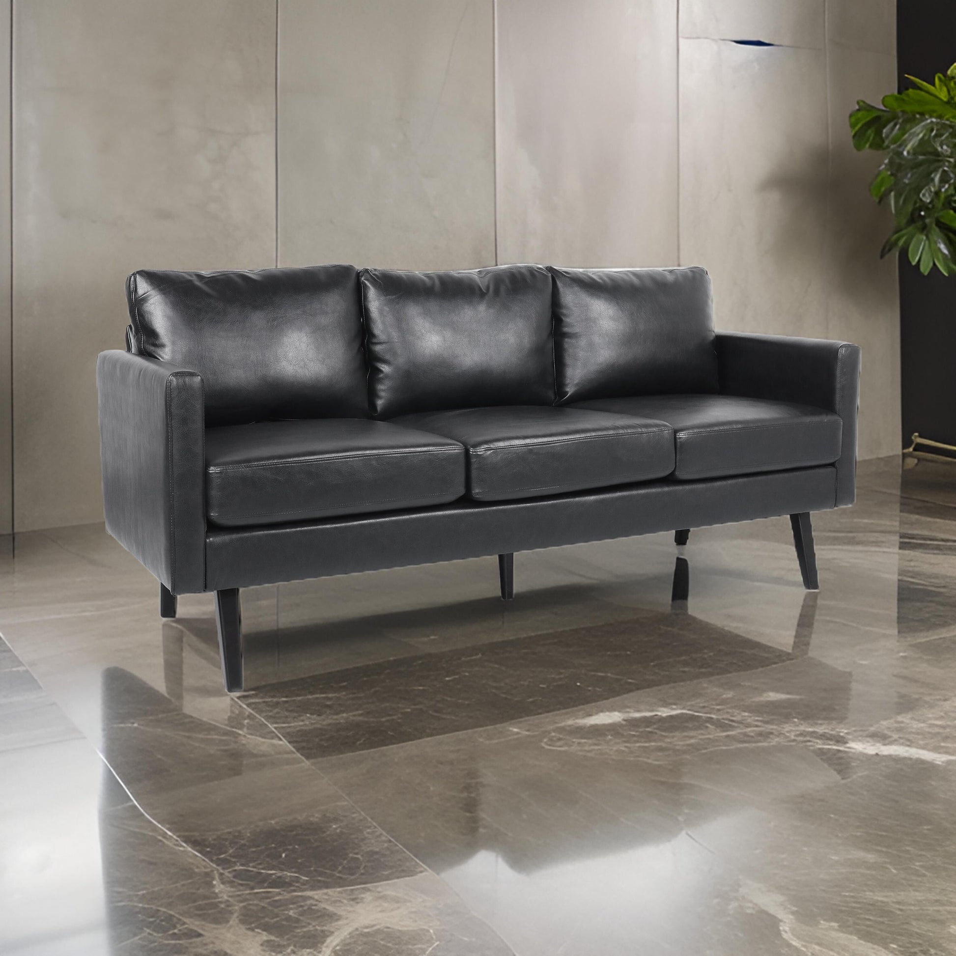Canapé 74 pouces, revêtement en similicuir noir, coussiné, accoudoirs carrés rétro
