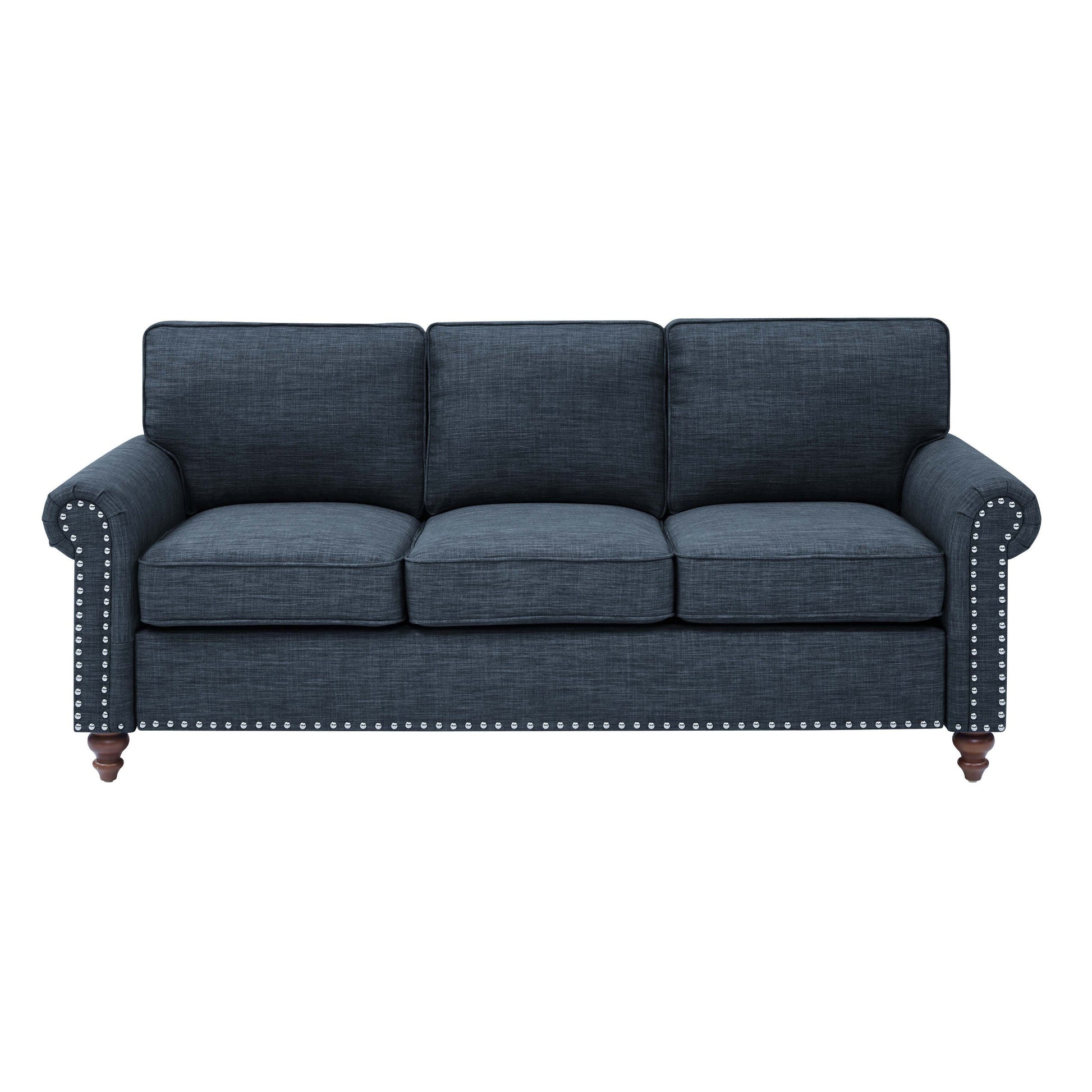 Profitez de l'atout supplémentaire de ce canapé spacieux, qui rendra vos soirées télé et repas à emporter bien plus agréables dans votre salon. Sa structure en bois massif et contrecollé, et son revêtement dans la teinte neutre de votre choix, lui confèrent un style et une fonctionnalité exceptionnels. Ses coussins carrés moelleux aux détails passepoilés sont garnis de mousse pour un soutien optimal, notamment dans les petits espaces. Ses ressorts à arc de l'assise préviennent l'affaissement au fil du temps. De plus, ses pieds tournés et ses accoudoirs roulés, ornés de clous décoratifs classiques, complètent à merveille les styles traditionnels et campagnards français.