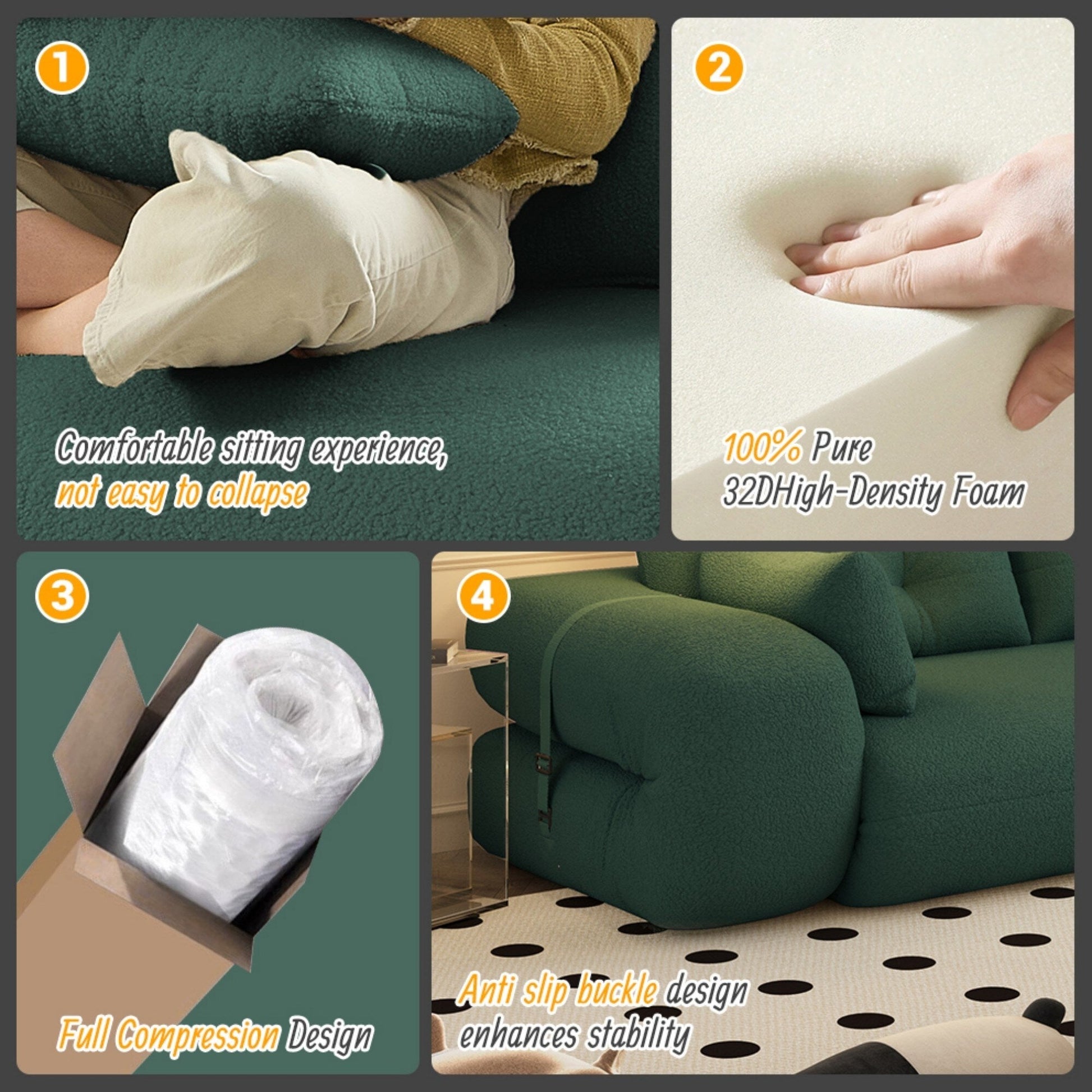 - Stabilité et sécurité : Doté d'un coussin antidérapant, ce canapé de sol assure une stabilité optimale sur toutes les surfaces. Son tissu respirant favorise la circulation de l'air, ce qui en fait un ajout sûr et élégant à votre intérieur, qui réchauffera votre espace et votre cœur.