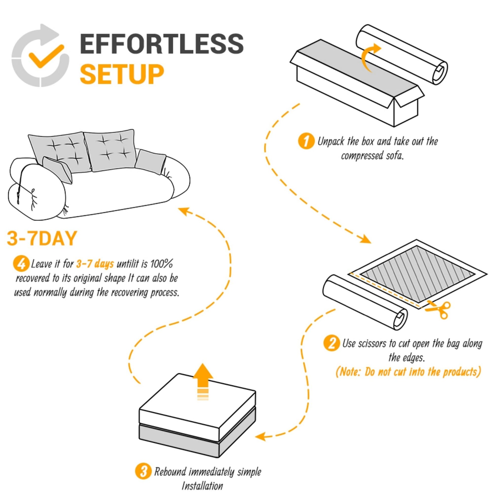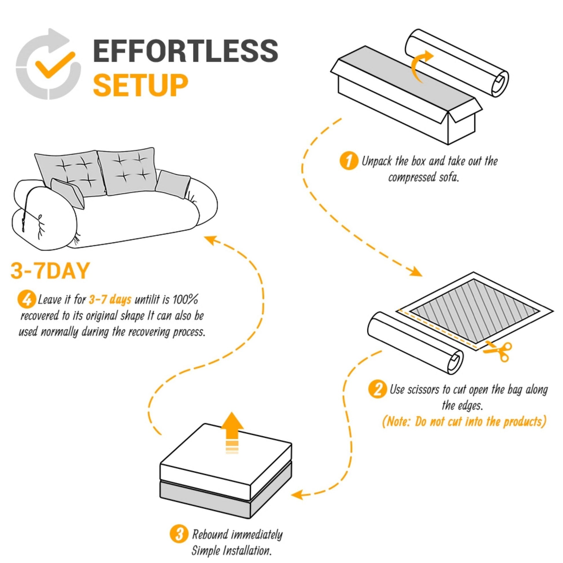 - Remarque importante : Le canapé-lit est compressé et emballé sous vide afin de réduire l'encombrement et les émissions de carbone pendant le transport. Une fois déballé, laissez-le respirer pendant 72 heures pour qu'il reprenne sa forme et sa taille d'origine.