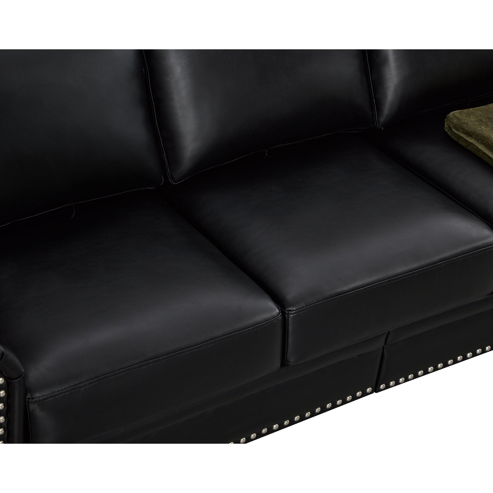 Canapé 3 places en similicuir avec rangement, structure en bois massif et métal, support à 6 pieds et coffres de rangement sous le siège.