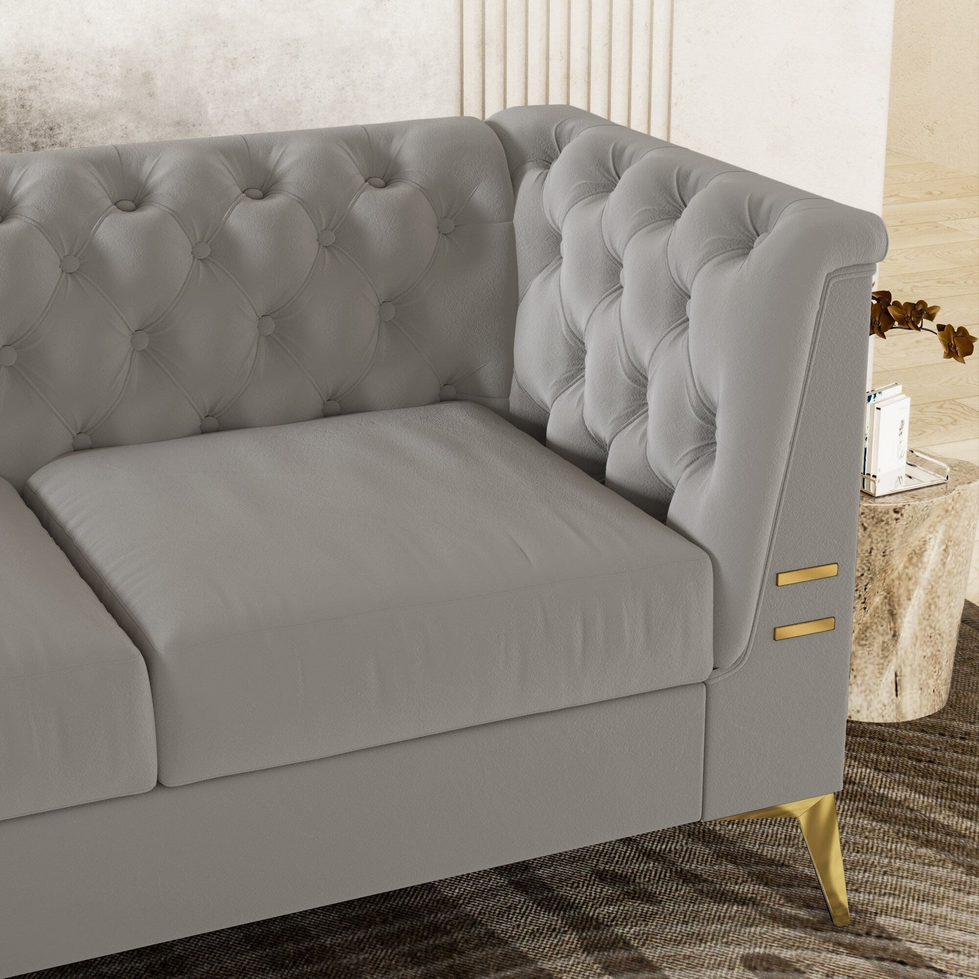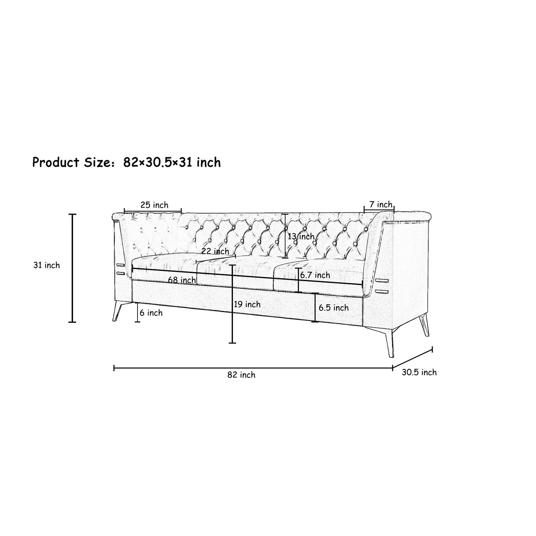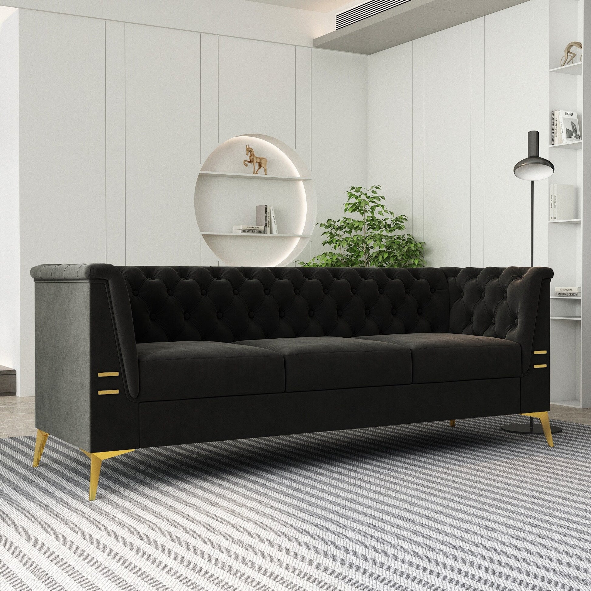 Canapé 3 places moderne en velours de 82 pouces avec design capitonné et pieds en métal doré