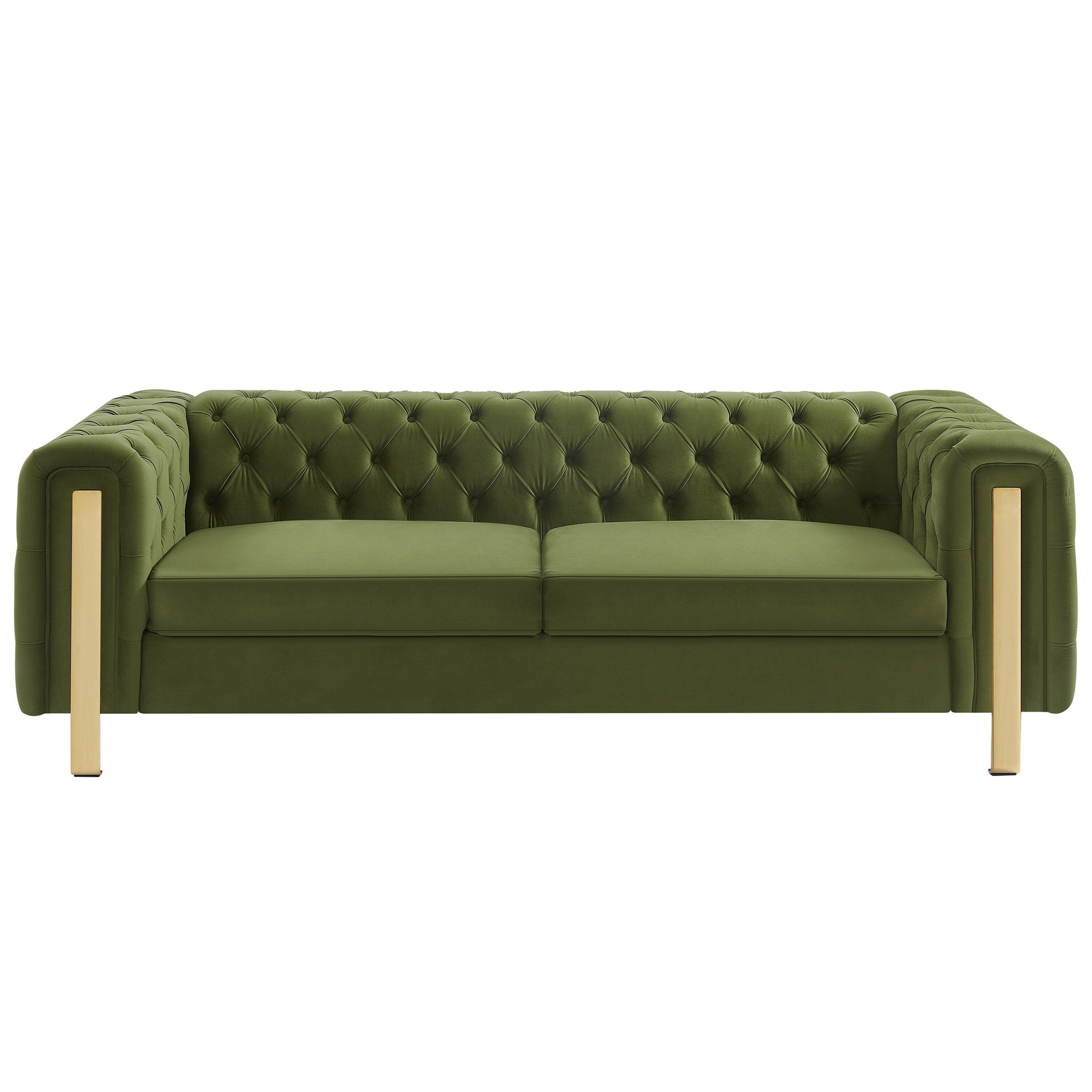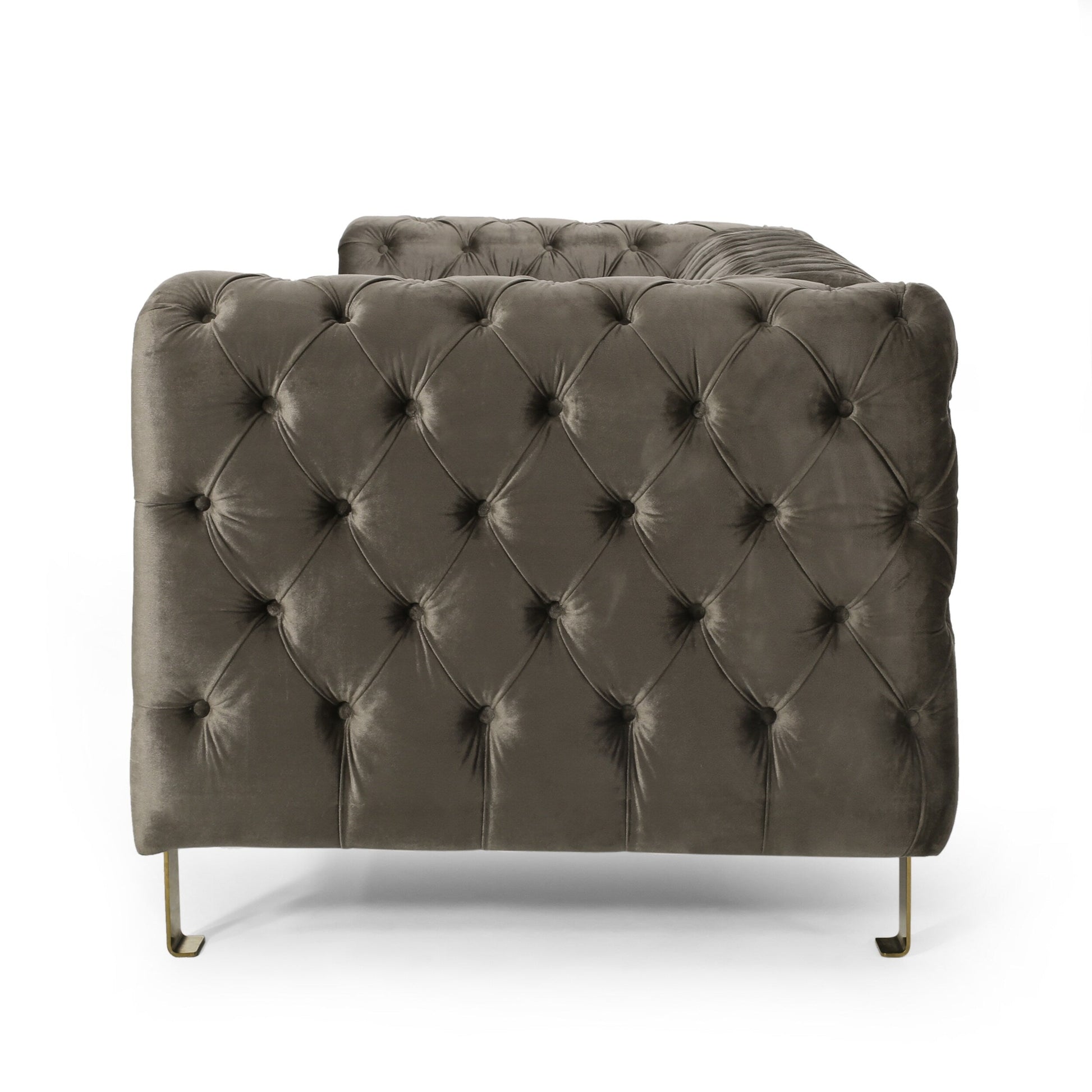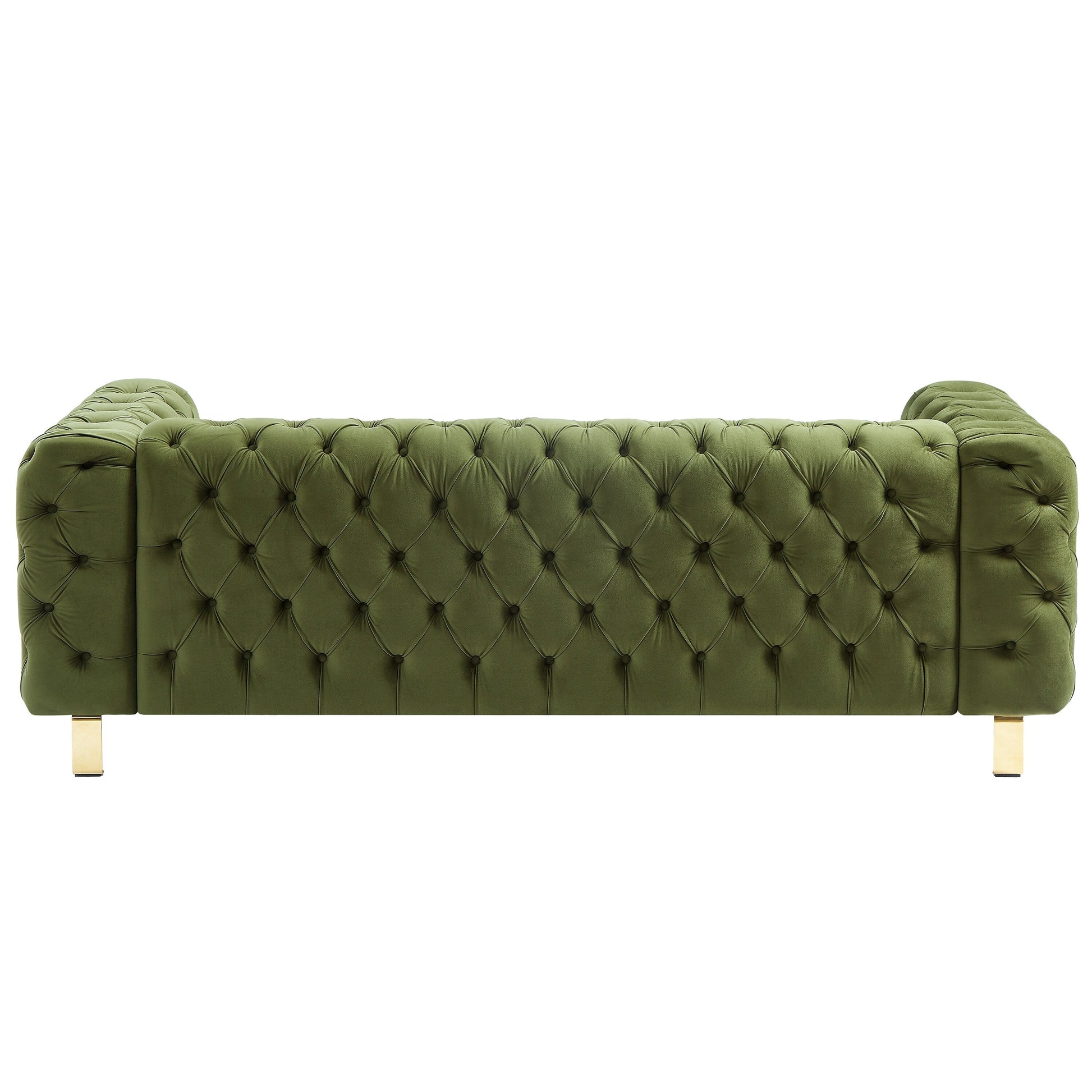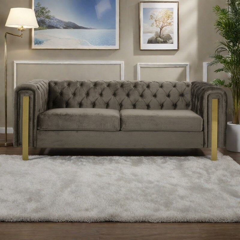 Canapé 3 places en velours 83,75 $ avec surpiqûres en losanges capitonnées, touches dorées et pieds en fer