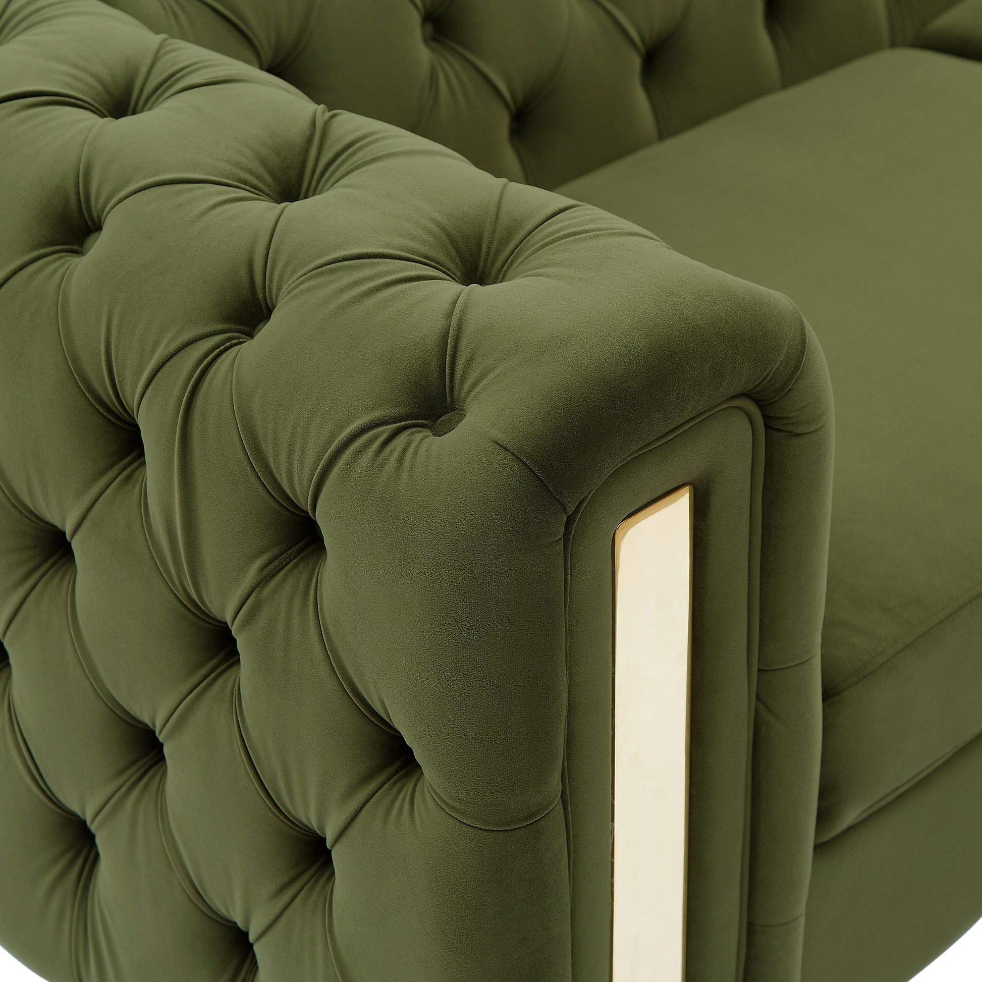 Sublimez votre espace de vie avec ce luxueux canapé en velours, doté d'accoudoirs style smoking glamour et d'élégants détails dorés. Alliant sophistication moderne et confort douillet, il transforme n'importe quelle pièce en un havre de paix élégant.