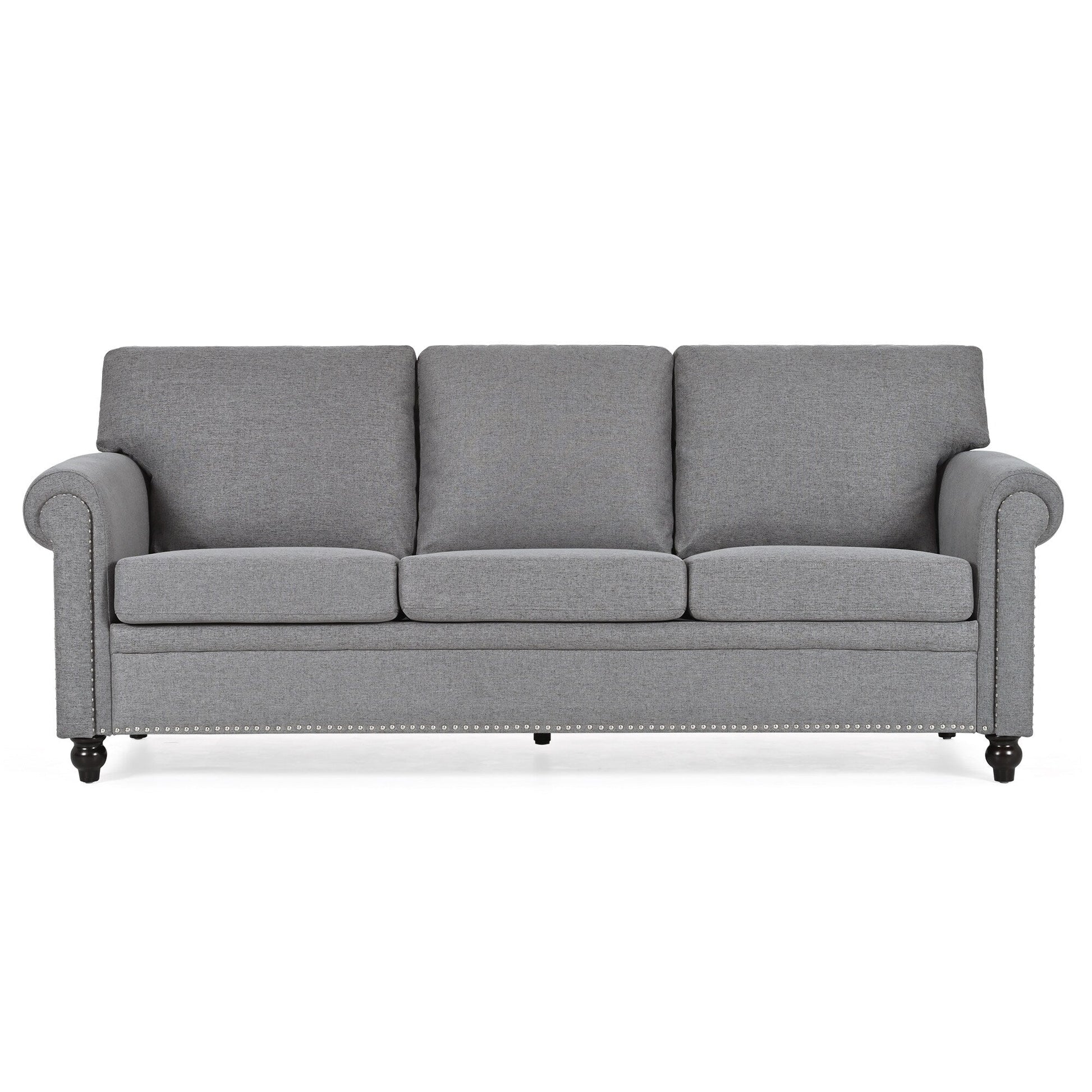 Canapé 3 places en tissu à accoudoirs enroulables, assise à ressorts ensachés, dossier en mousse PP et structure en bois massif (83,86 €)