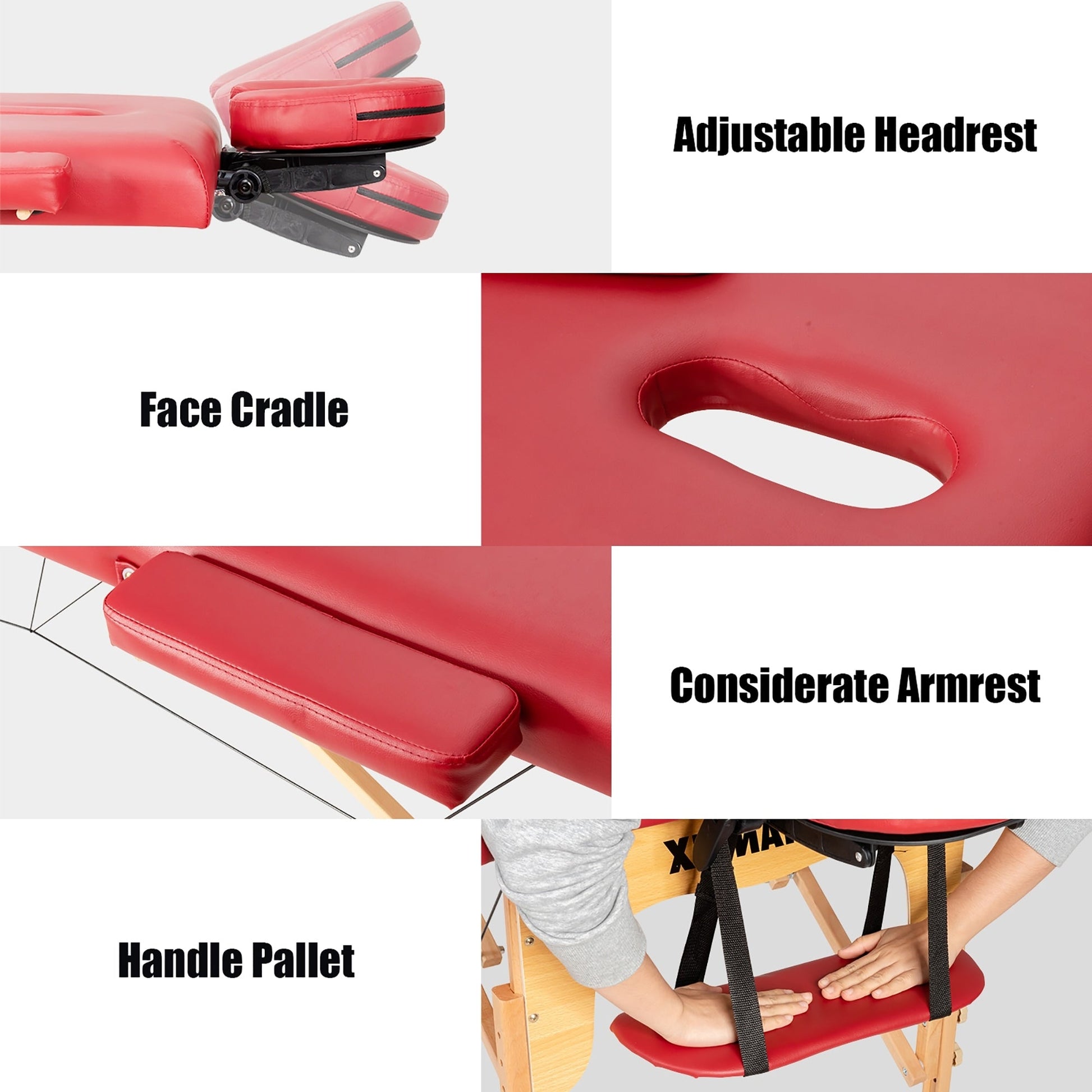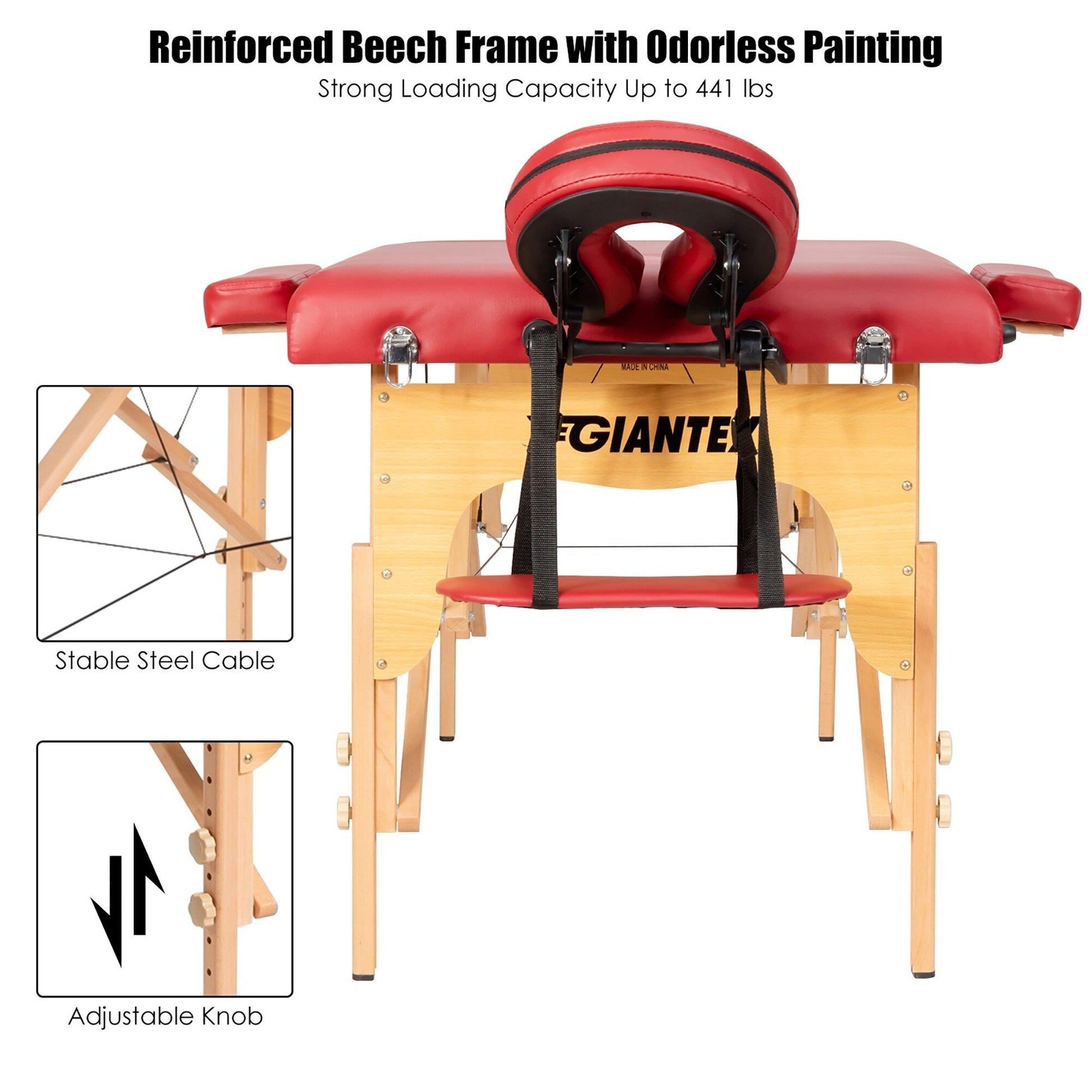 La hauteur et l'appui-tête sont réglables pour s'adapter aux différentes tailles de thérapeutes et répondre à divers besoins. De plus, sa conception pliable et légère facilite le transport et le rangement de ce lit de spa. Le sac de transport inclus est très pratique. Construite avec un cadre en hêtre massif et des câbles en acier, cette table de massage de haute qualité est robuste et stable, supportant jusqu'à 200 kg. Son revêtement en éponge haute densité et son cuir PVC respirant offrent un confort optimal et un nettoyage facile.
