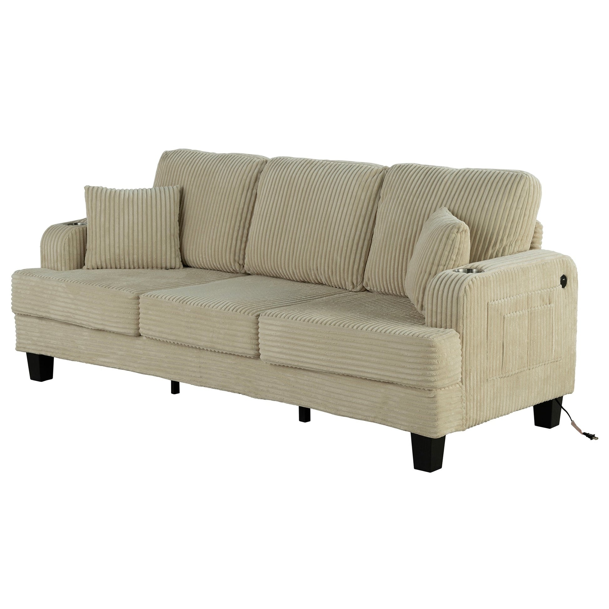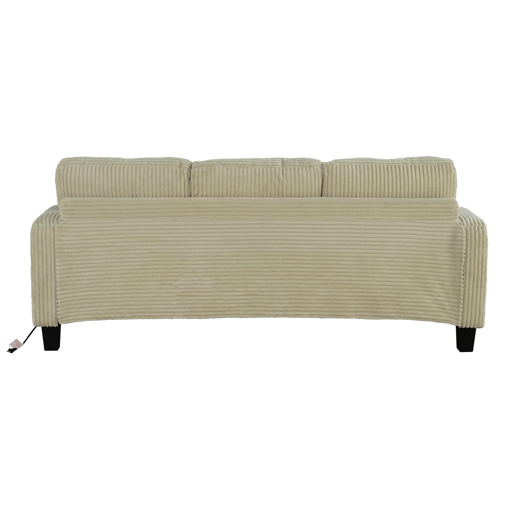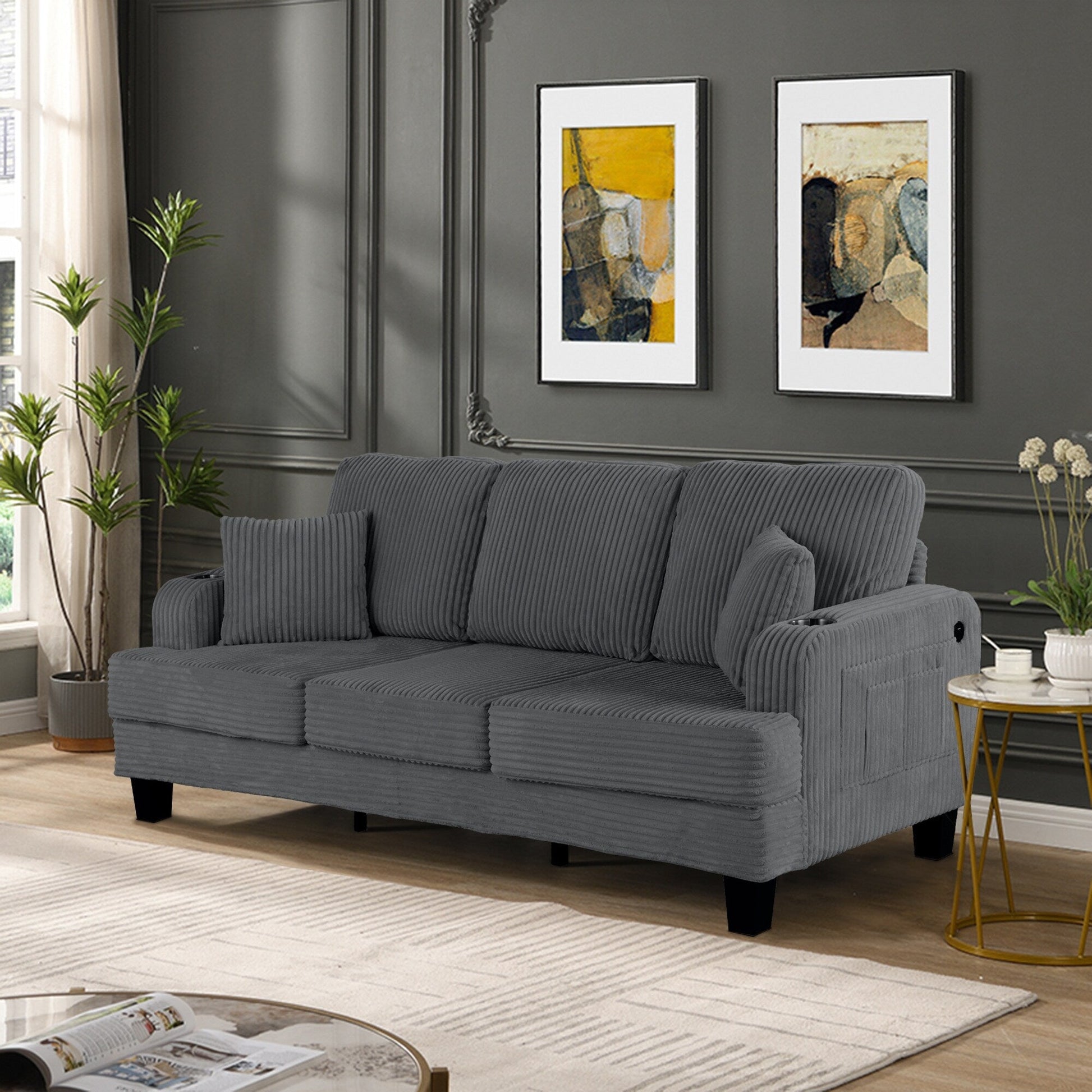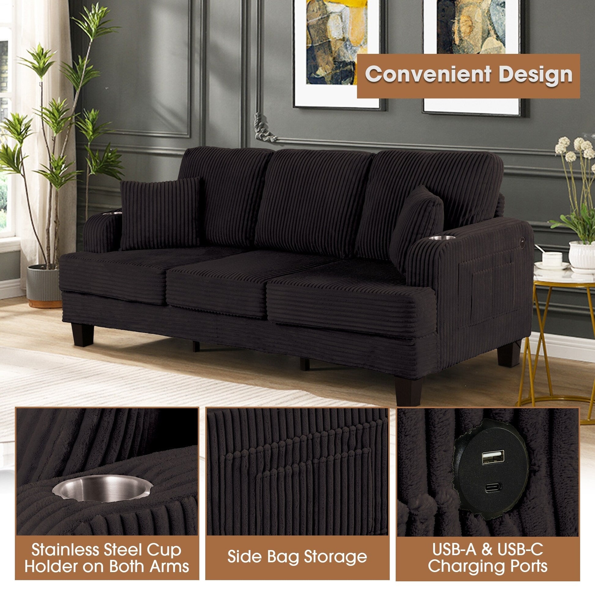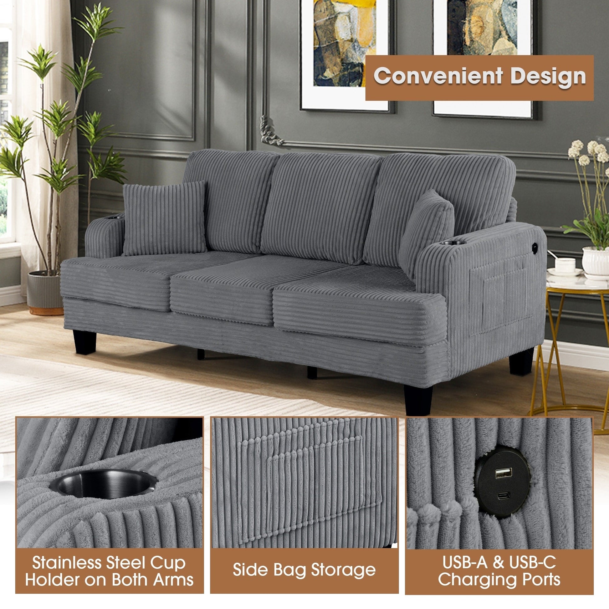 Canapé rectangulaire moderne 3 places en velours côtelé avec port USB et 2 oreillers