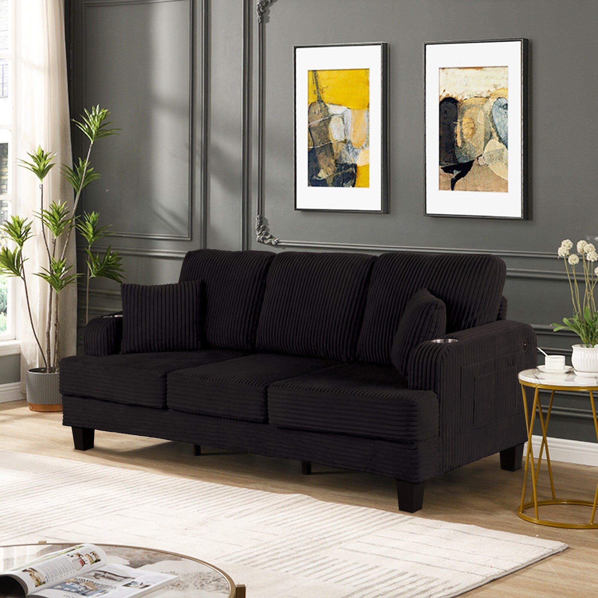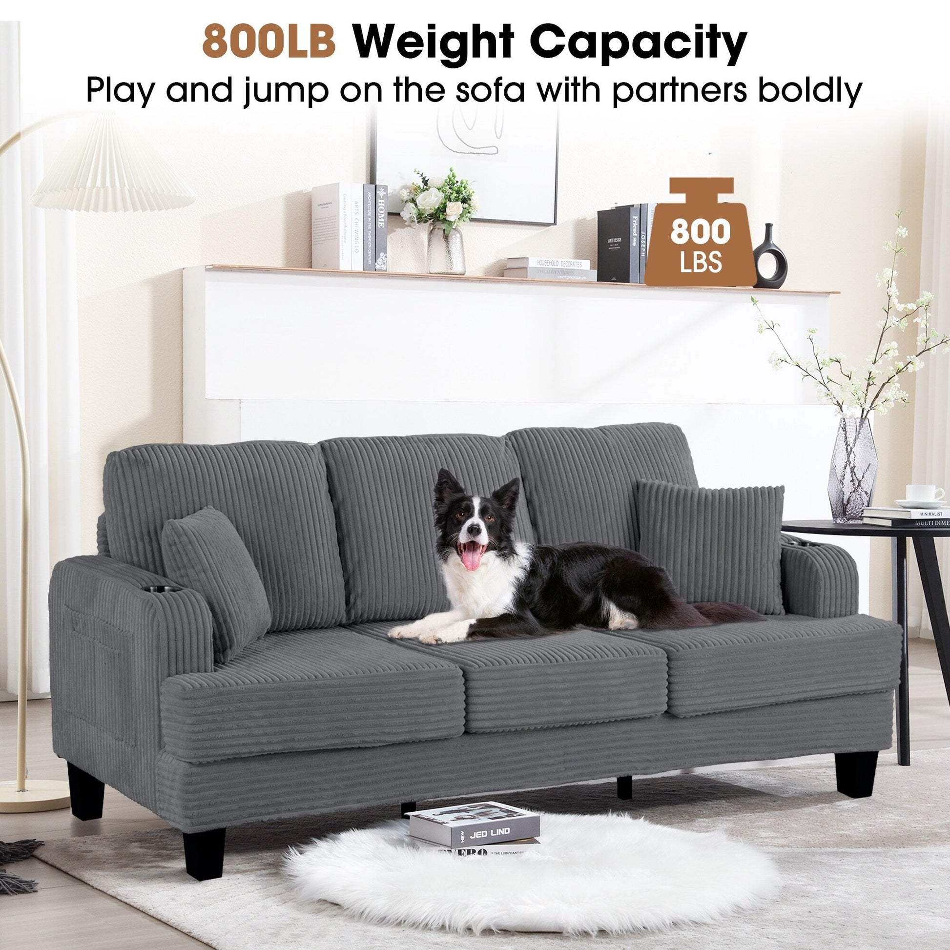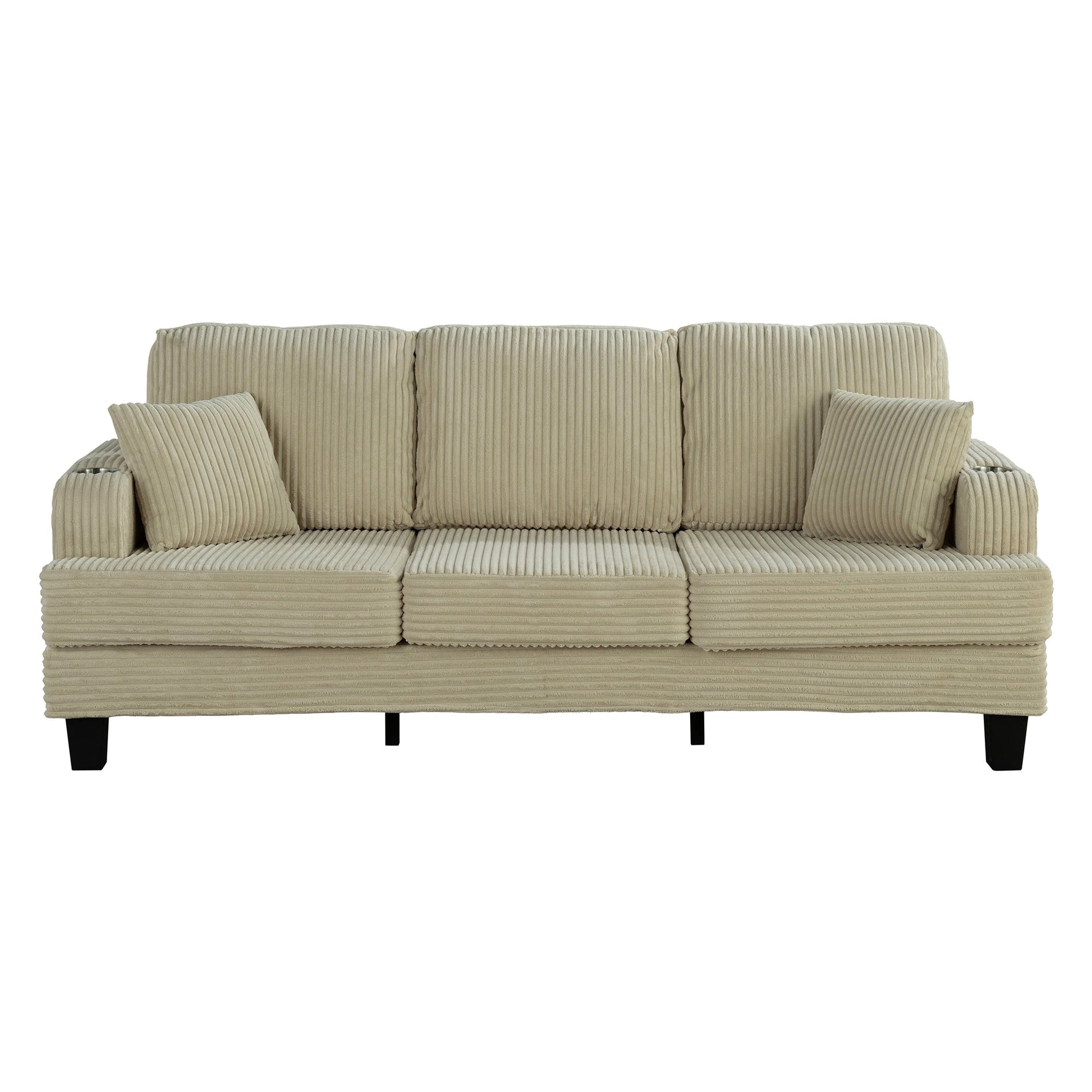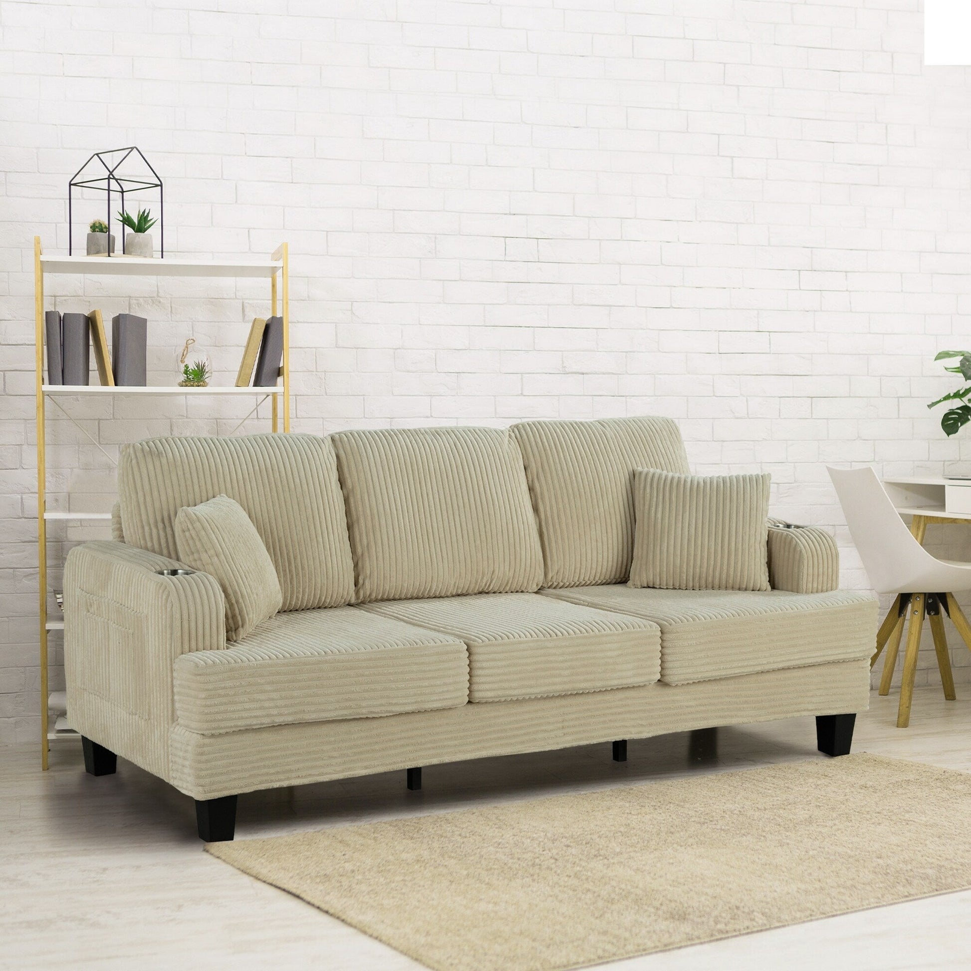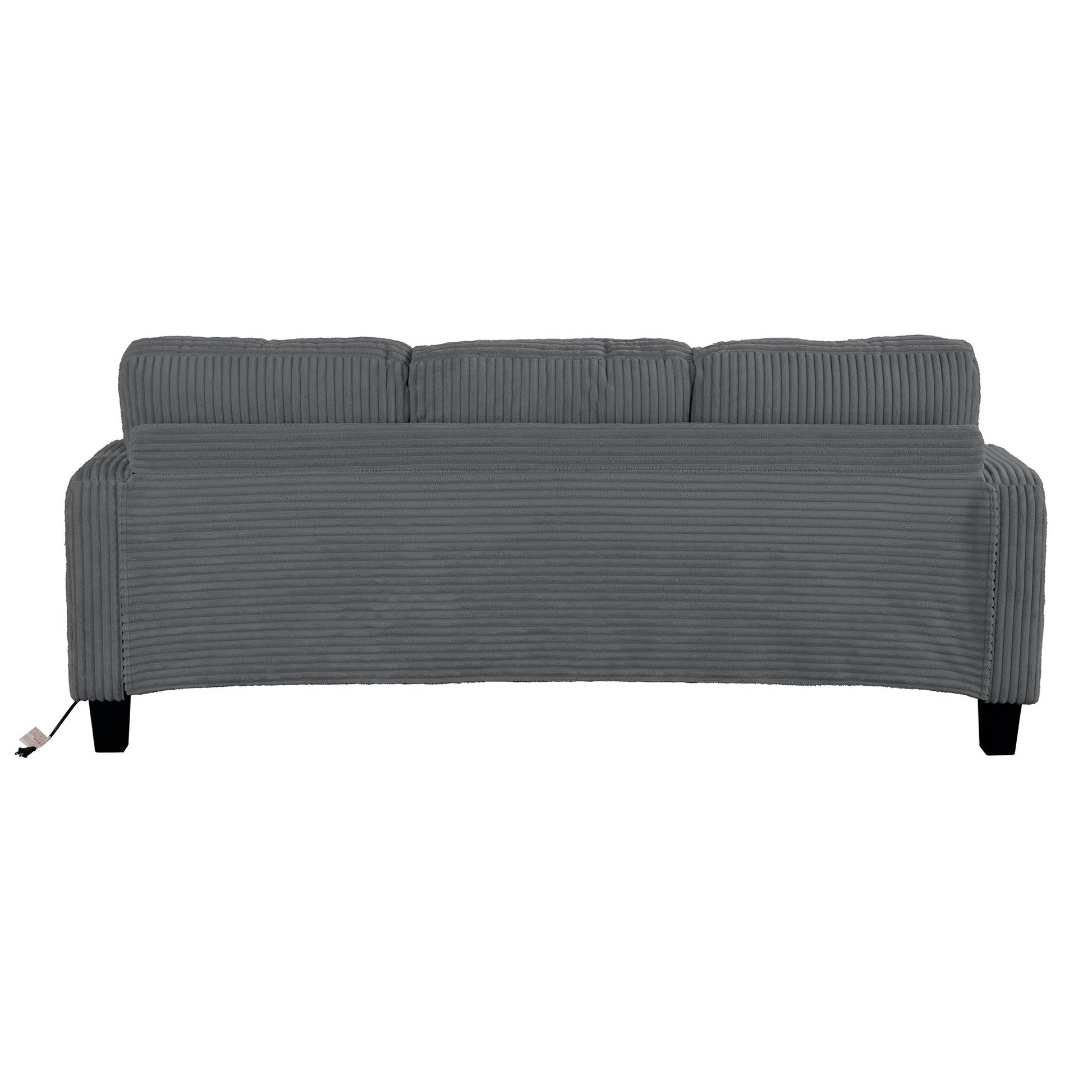 Canapé rectangulaire moderne 3 places en velours côtelé avec port USB et 2 oreillers