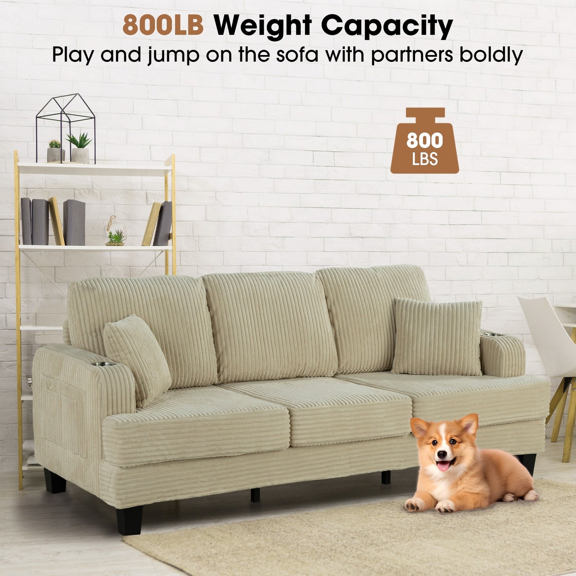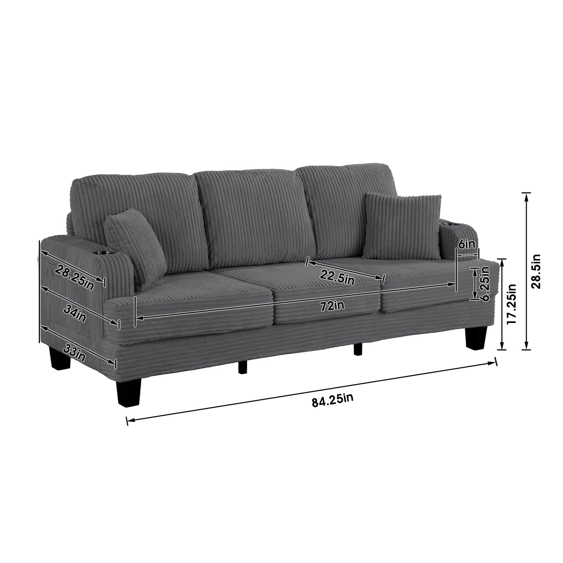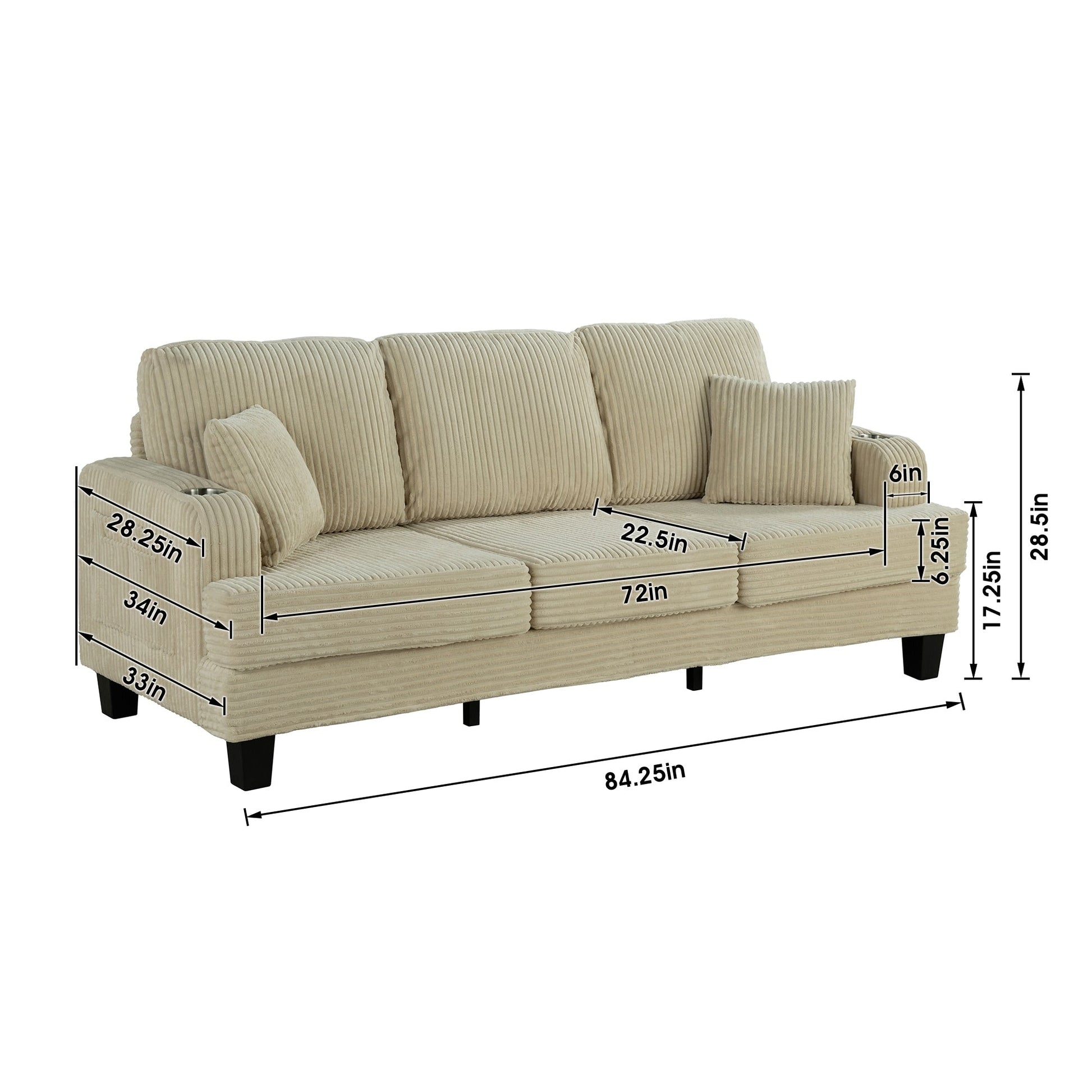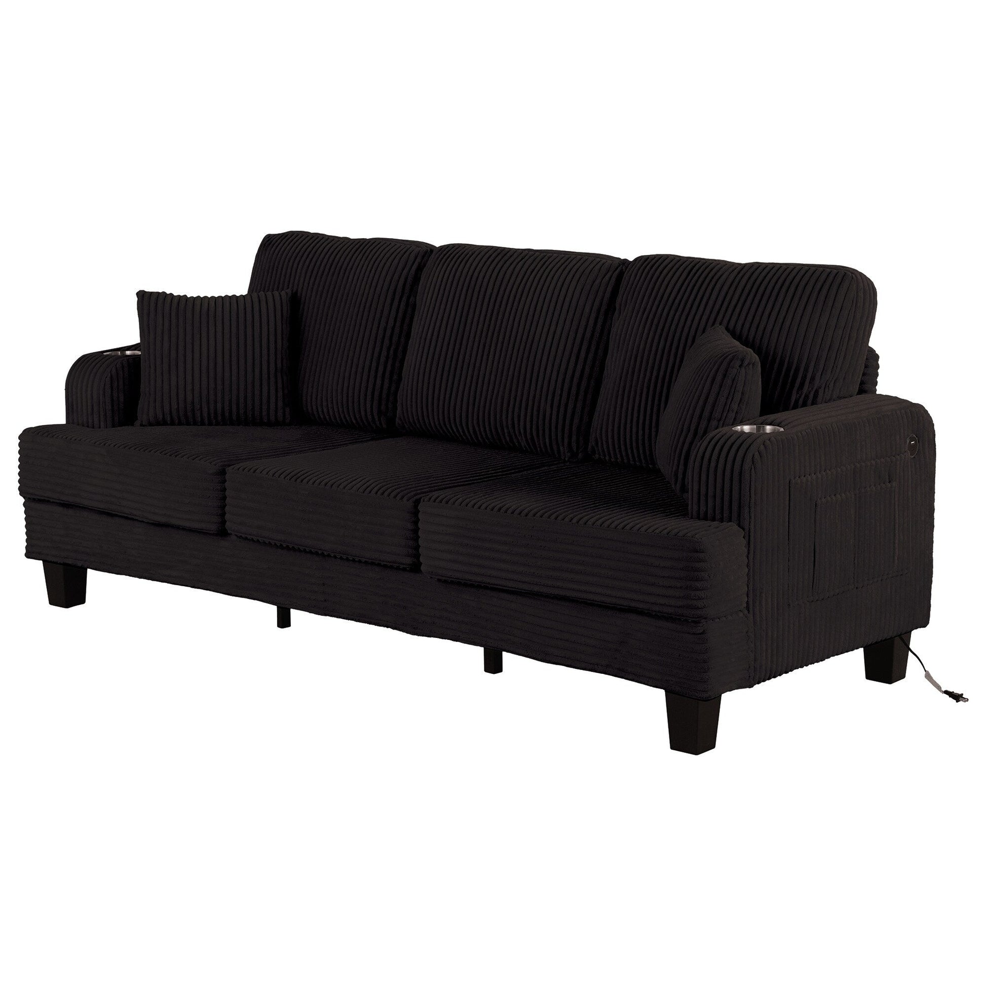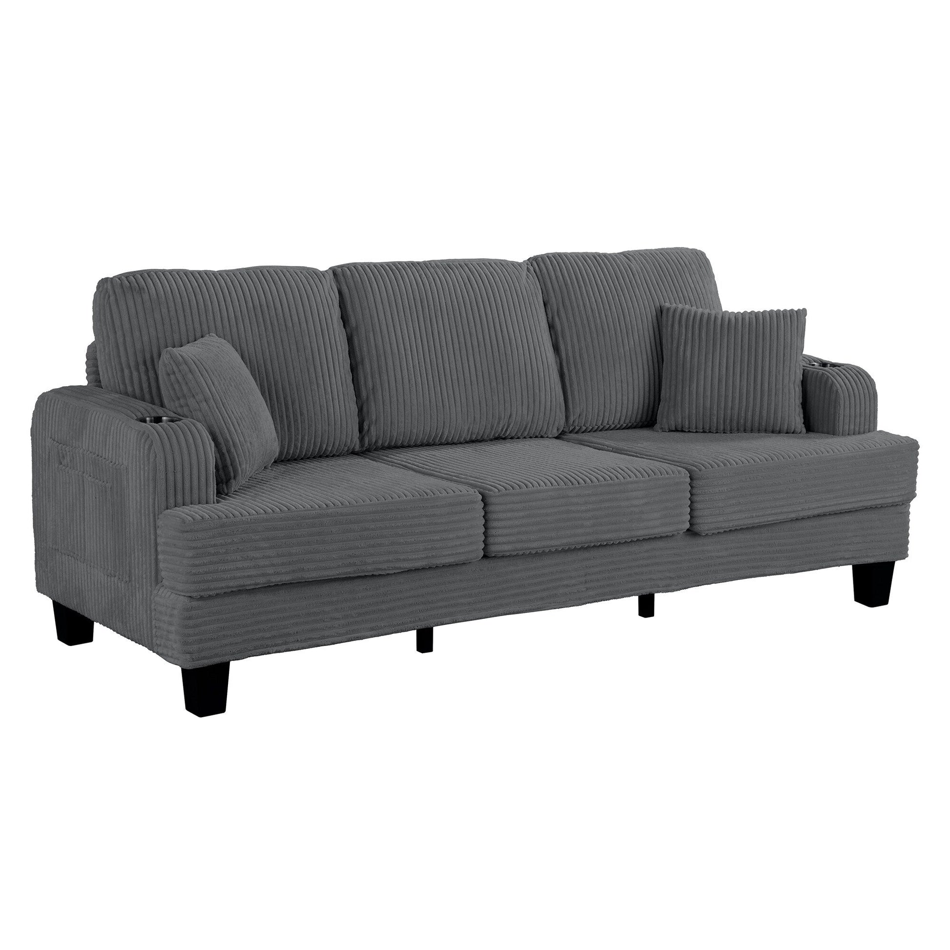 Canapé rectangulaire moderne 3 places en velours côtelé avec port USB et 2 oreillers