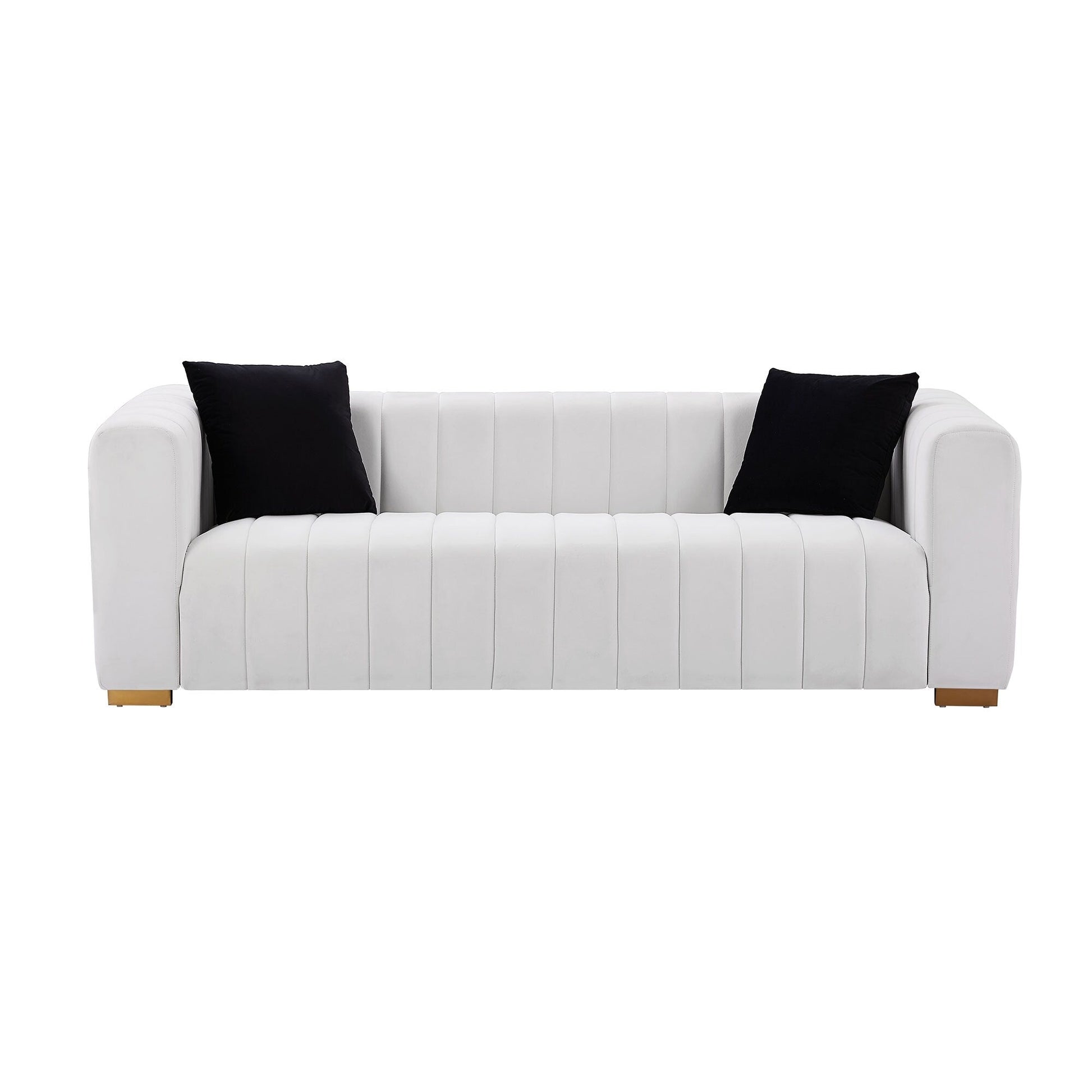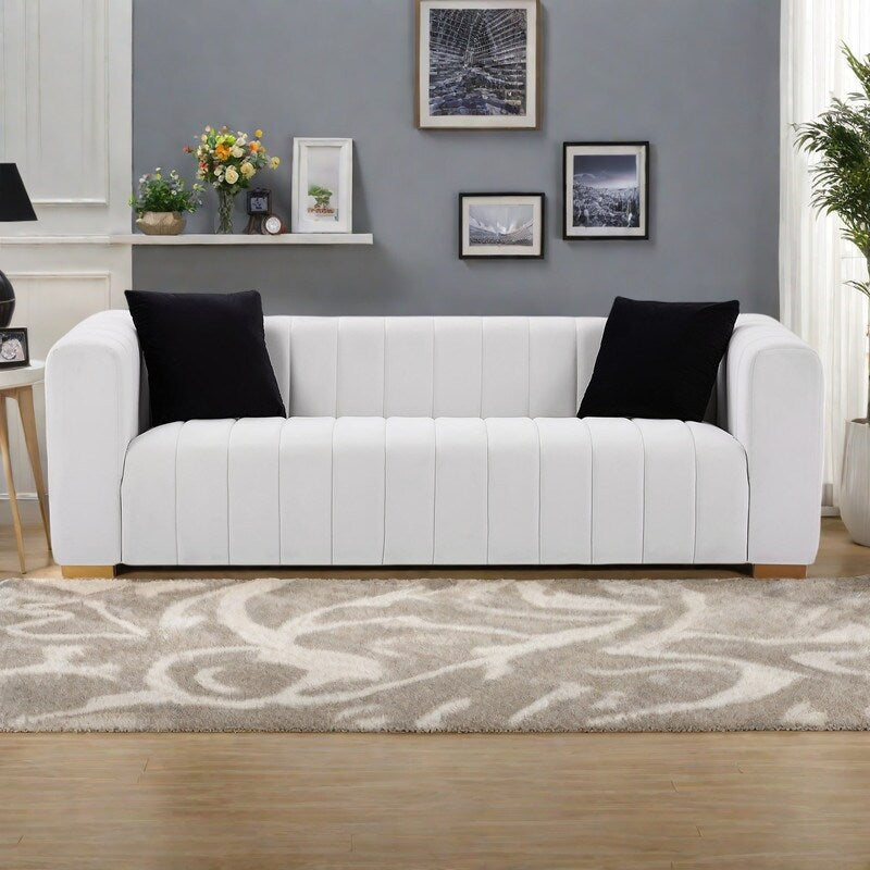 Sublimez votre espace de vie avec notre canapé capitonné en velours, alliant élégance moderne et confort douillet. Ce superbe canapé allie un luxueux revêtement en velours à d'élégants pieds en métal doré pour créer une pièce maîtresse aussi saisissante que confortable.