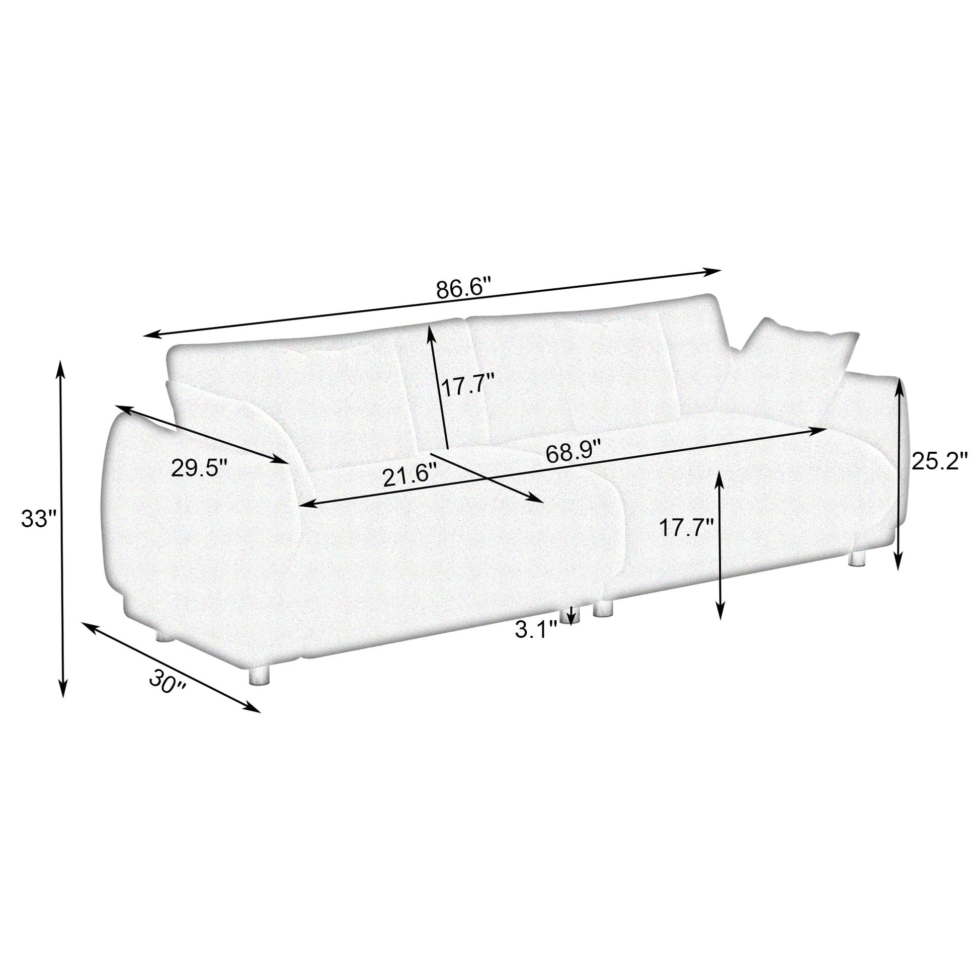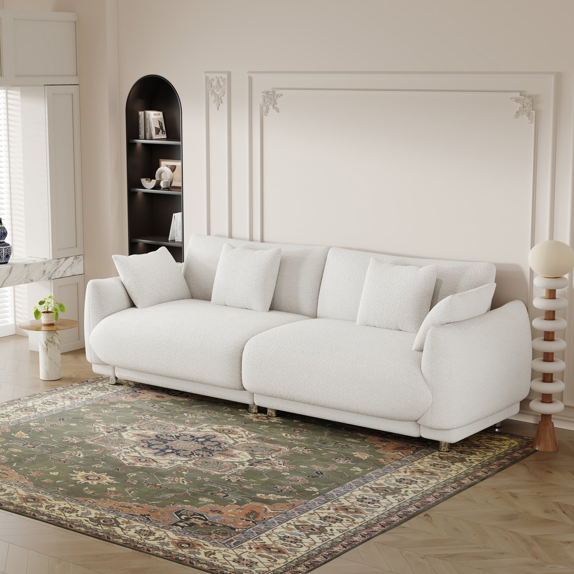 Un canapé en laine verte Teddy de 86,6 pouces avec quatre coussins et des pieds en quincaillerie qui peuvent s'asseoir confortablement dans une chambre d'appartement avec