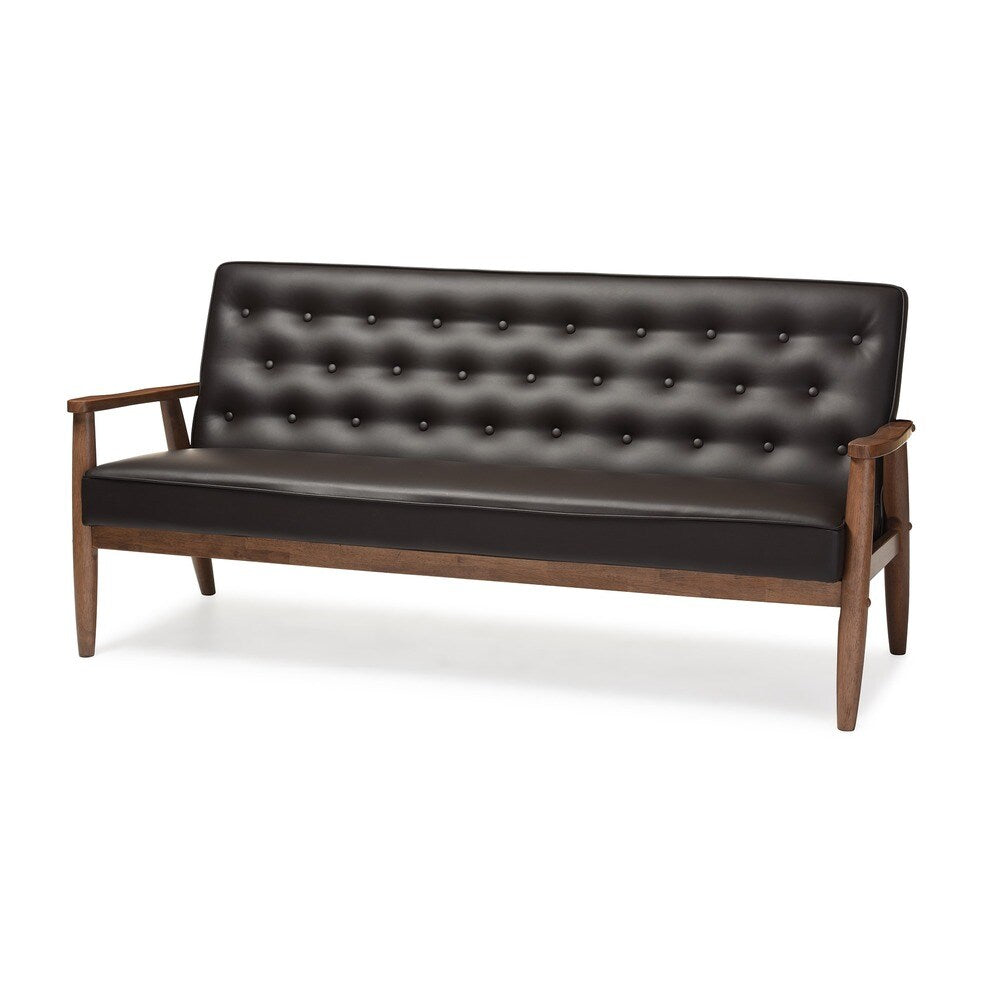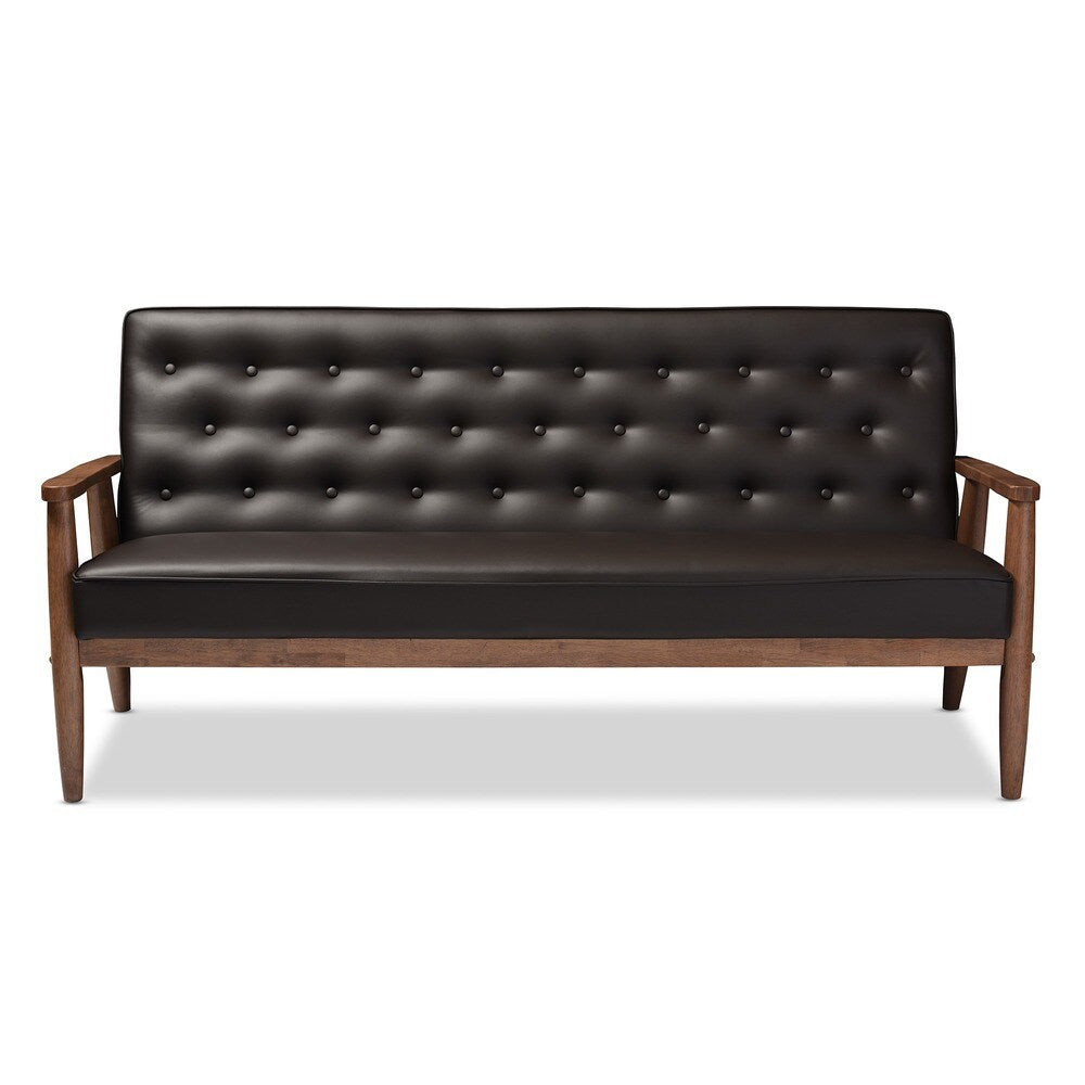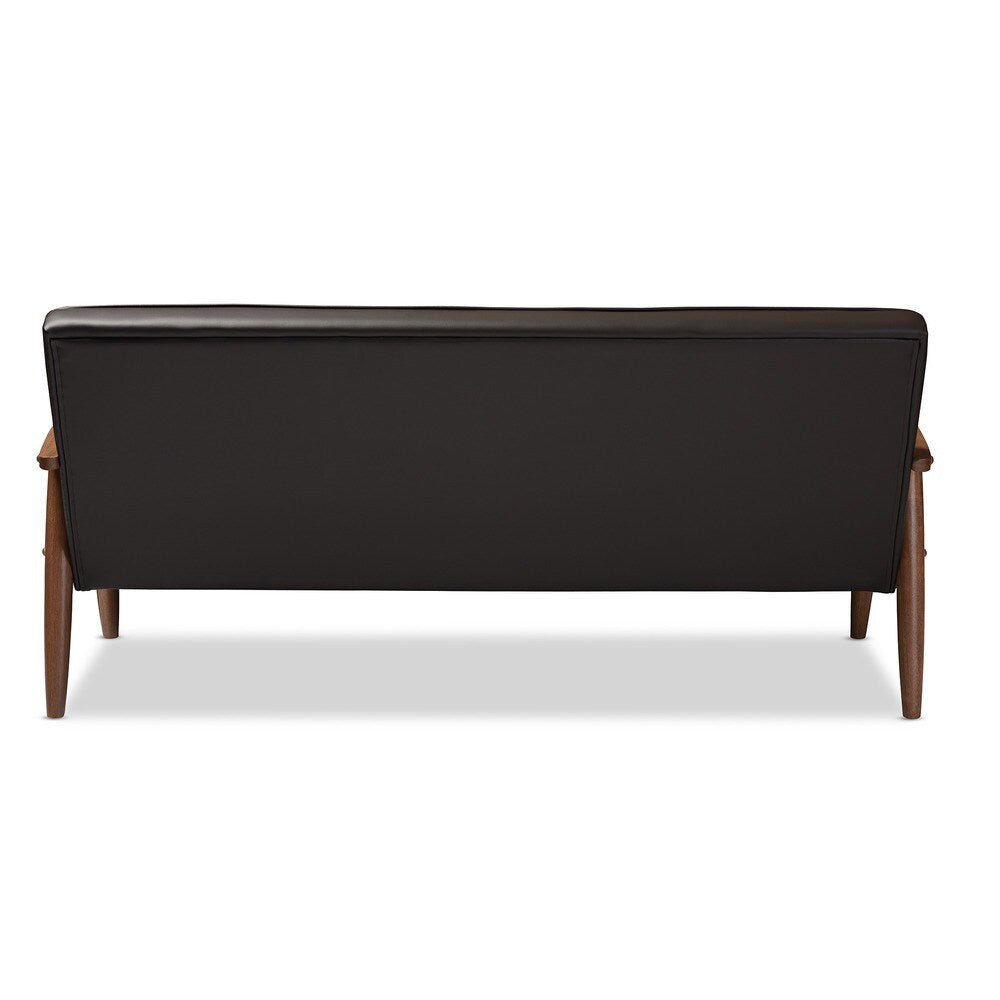 Canapé 3 places en bois rembourré en similicuir marron style rétro moderne du milieu du siècle de Baxton Studio Sorrento