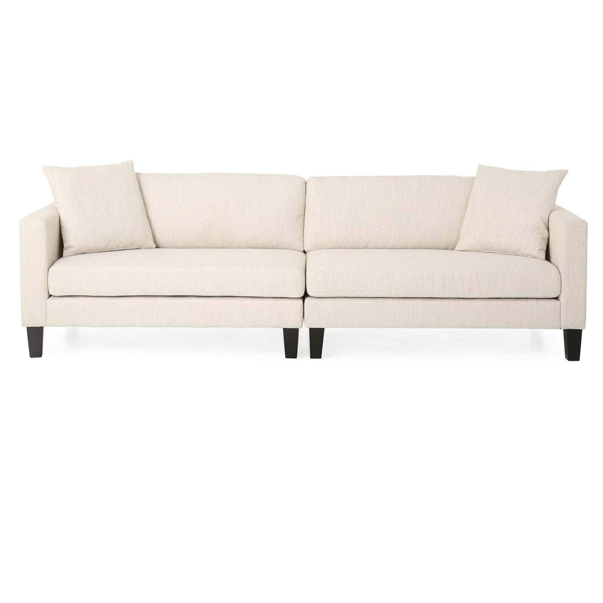 Canapé 3 places beige avec pieds en bois et deux coussins