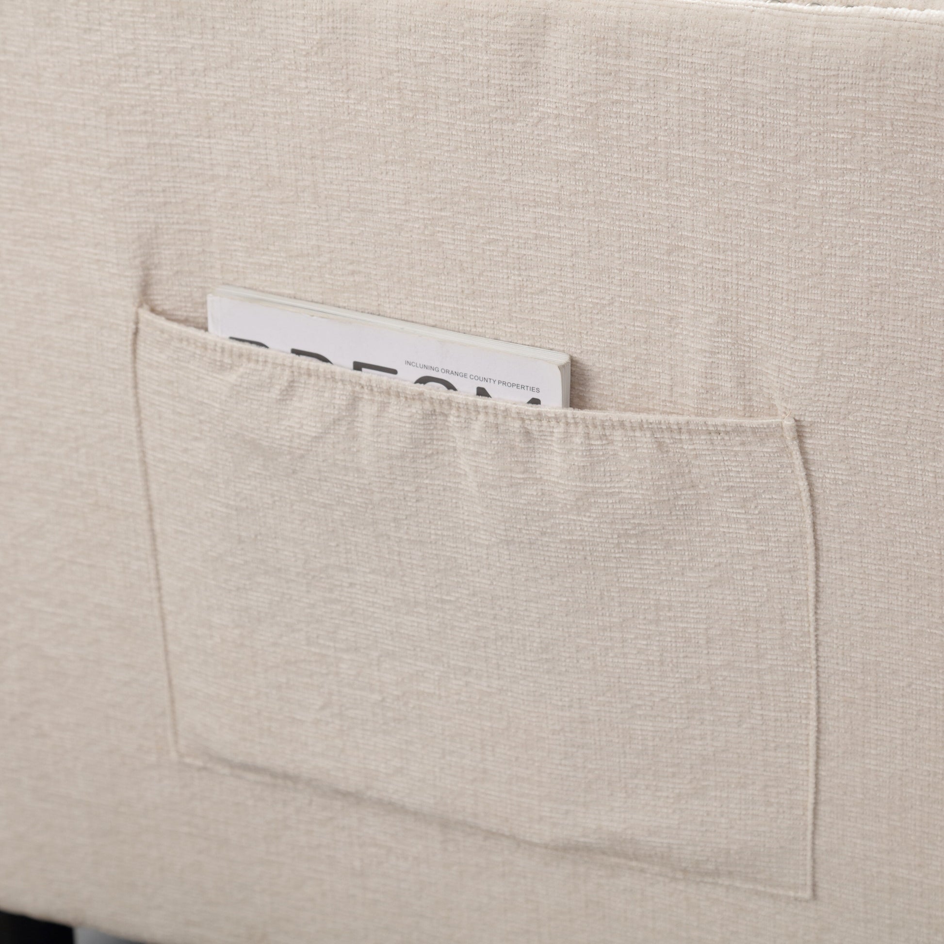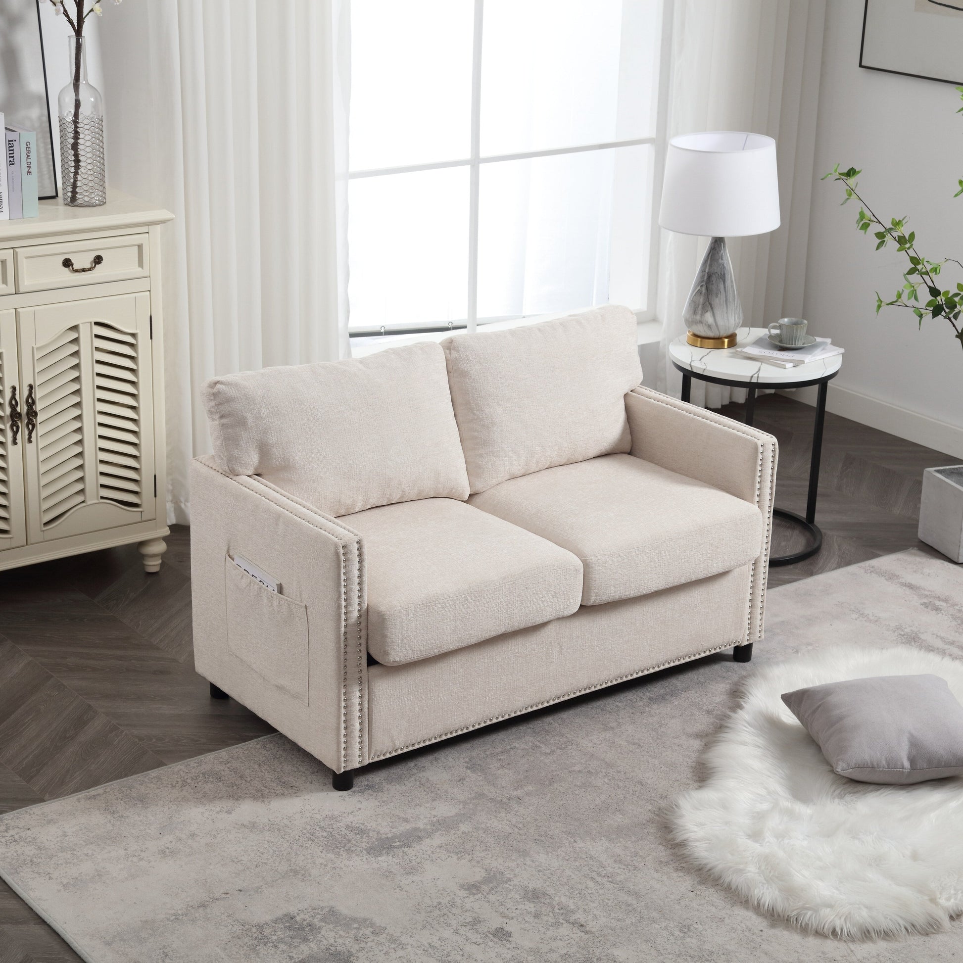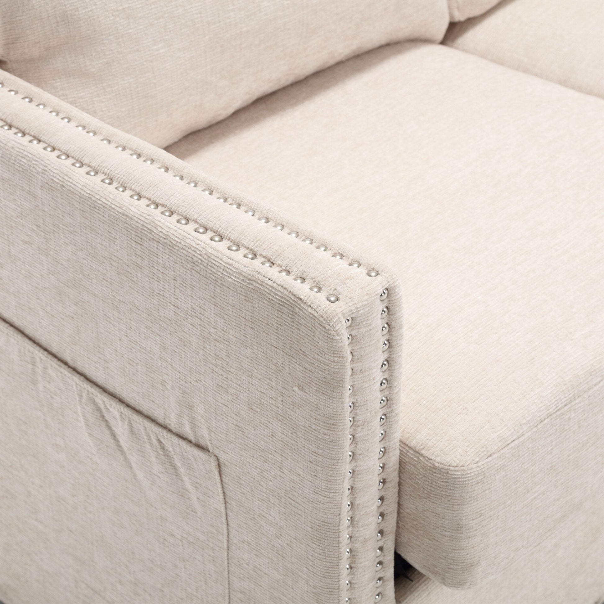 Canapé causeuse en chenille beige avec poche et clous décoratifs