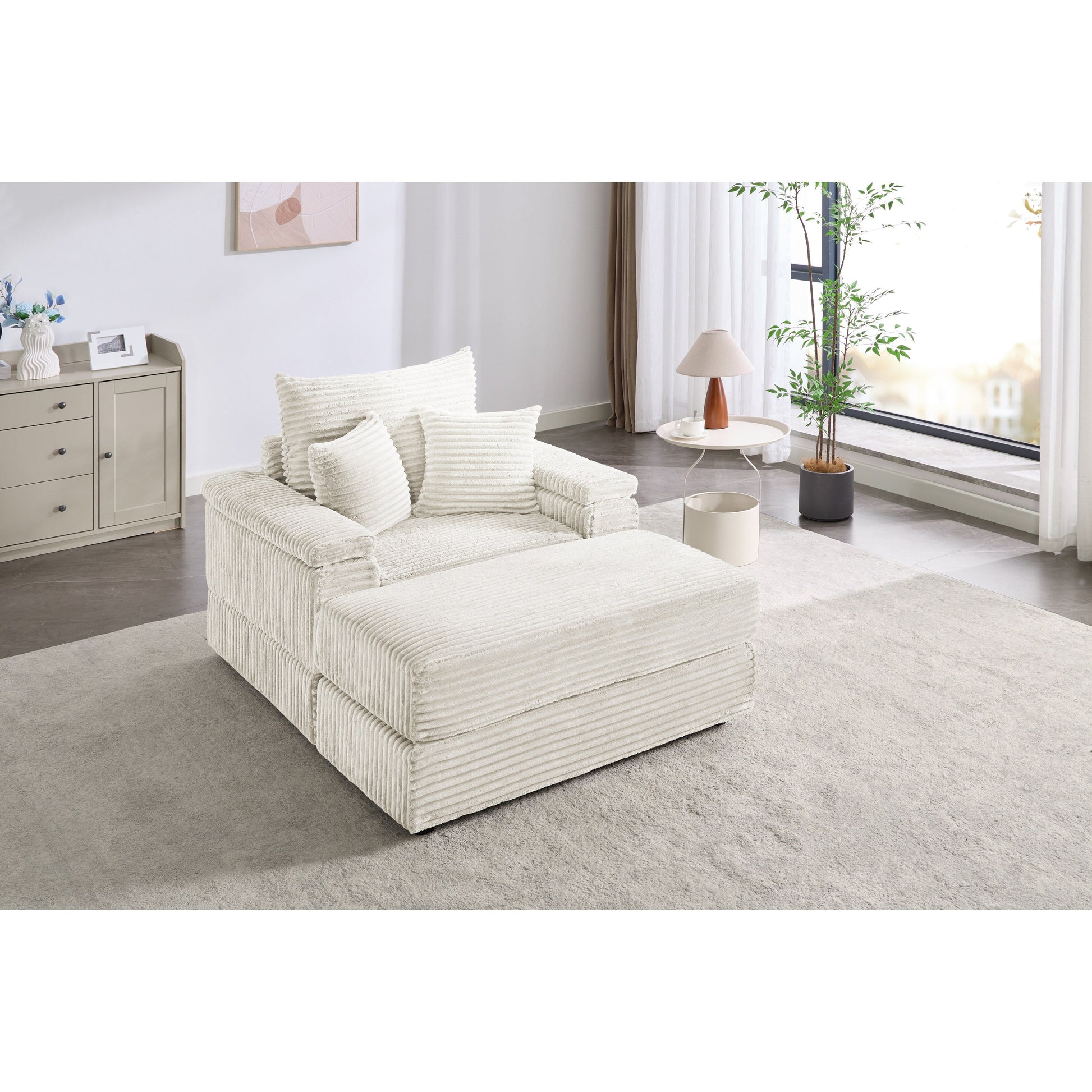 Canapé simple en velours côtelé beige avec pouf et accoudoir de rangement