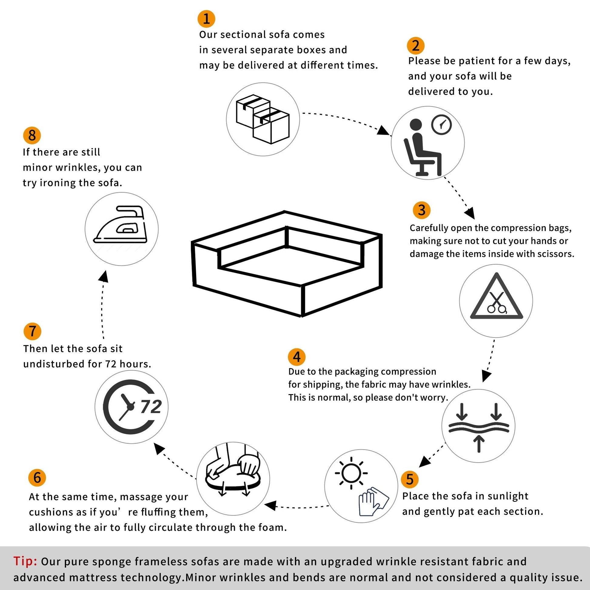 - CONSEIL : En raison de la compression du colis pour une meilleure expédition, le tissu peut présenter des plis. Veuillez retirer tous les colis et tapoter chaque partie pour lui redonner un meilleur rebond et un meilleur gonflant, afin qu'il retrouve son aspect d'origine.