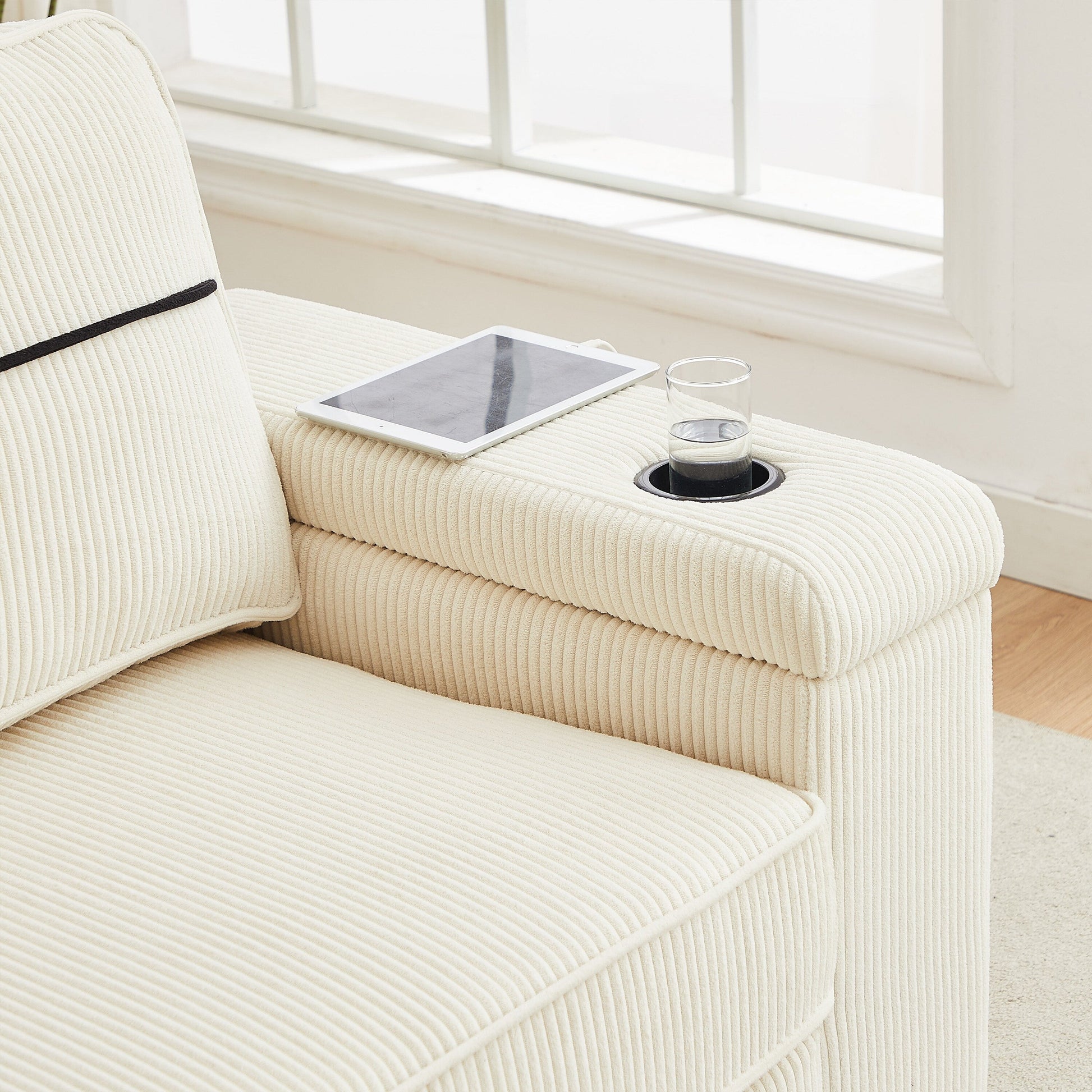 Canapé 3 places beige moderne en velours côtelé 86,5 avec deux espaces de rangement, ports de chargement USB et deux porte-gobelets
