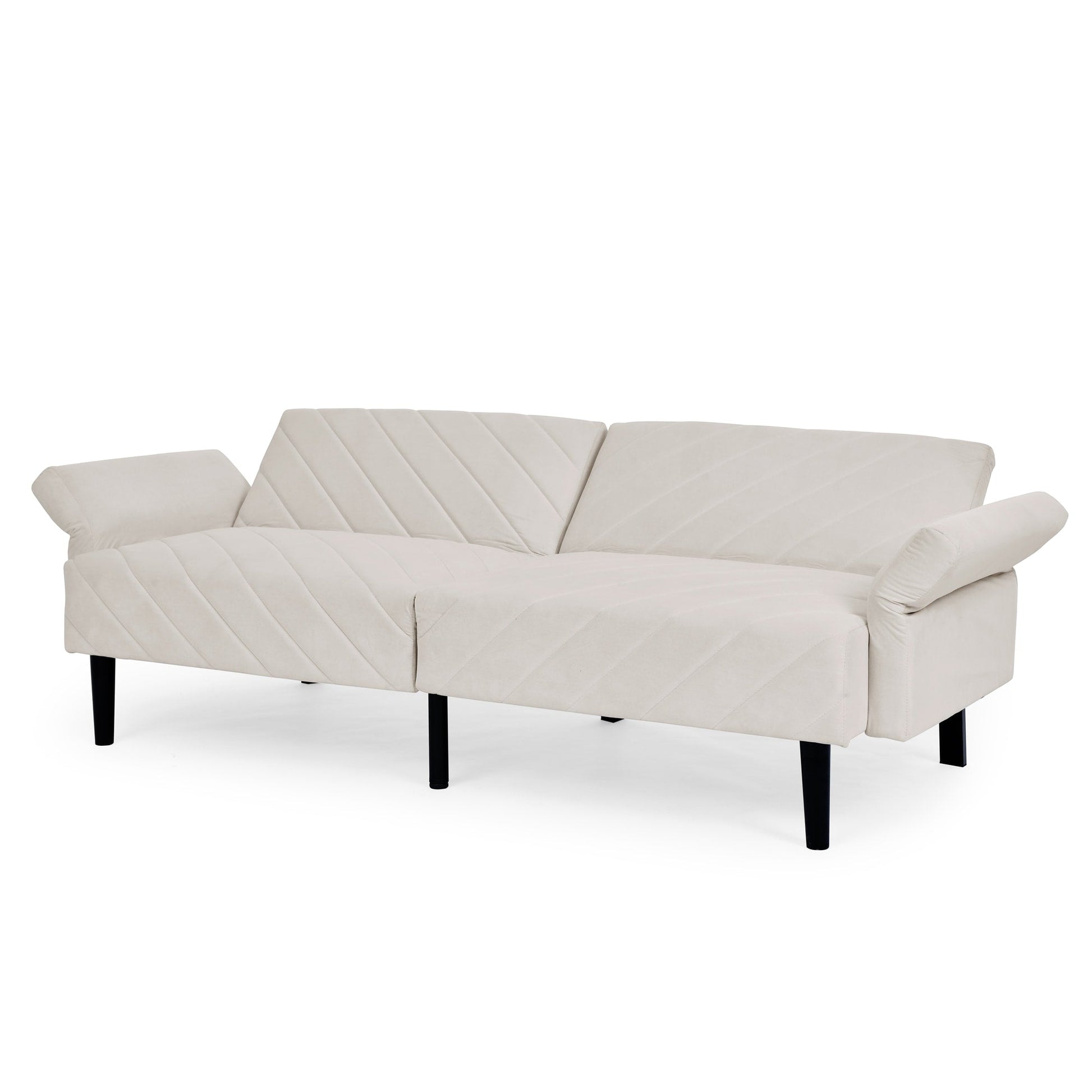 Sublimez votre espace de vie avec ce canapé-lit futon en velours, intemporel et polyvalent. Alliant lignes modernes et détails modernes du milieu du siècle, comme le capitonnage à chevrons et les pieds fuselés en plastique, ce meuble apporte une touche d'élégance à tout décor. Le revêtement en velours est non seulement élégant, mais offre également un confort et une durabilité accrus, vous permettant de profiter de sa douceur et de sa chaleur. Les accoudoirs et dossiers réglables multi-angles offrent un confort personnalisé, avec un dossier inclinable sur 6 positions (de 90° à 180°), idéal pour lire, se divertir ou dormir. Il suffit de tirer pour le transformer en canapé, lit ou fauteuil inclinable. Conçu pour une utilisation durable, le cadre en fer et bois massif assure une structure stable, tandis que la mousse haute densité offre un soutien ferme et confortable qui ne se déforme pas. Les accoudoirs réglables offrent un espace de couchage plus grand, vous permettant de vous allonger confortablement sur le canapé-lit au lieu de vous y blottir. Le couchage mesure 260 x 110 x 550 cm, offrant un espace de détente généreux.