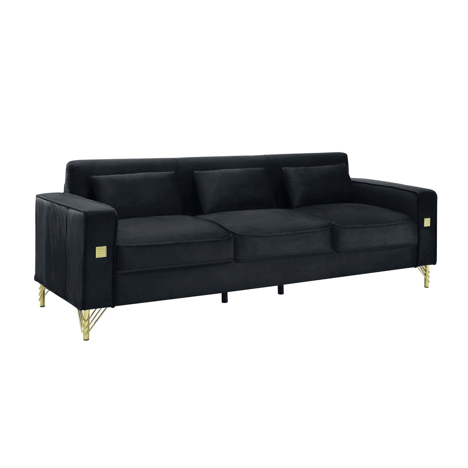 Canapé 3 places en velours noir 86.61 avec coussins et pieds en métal finition dorée pour le salon