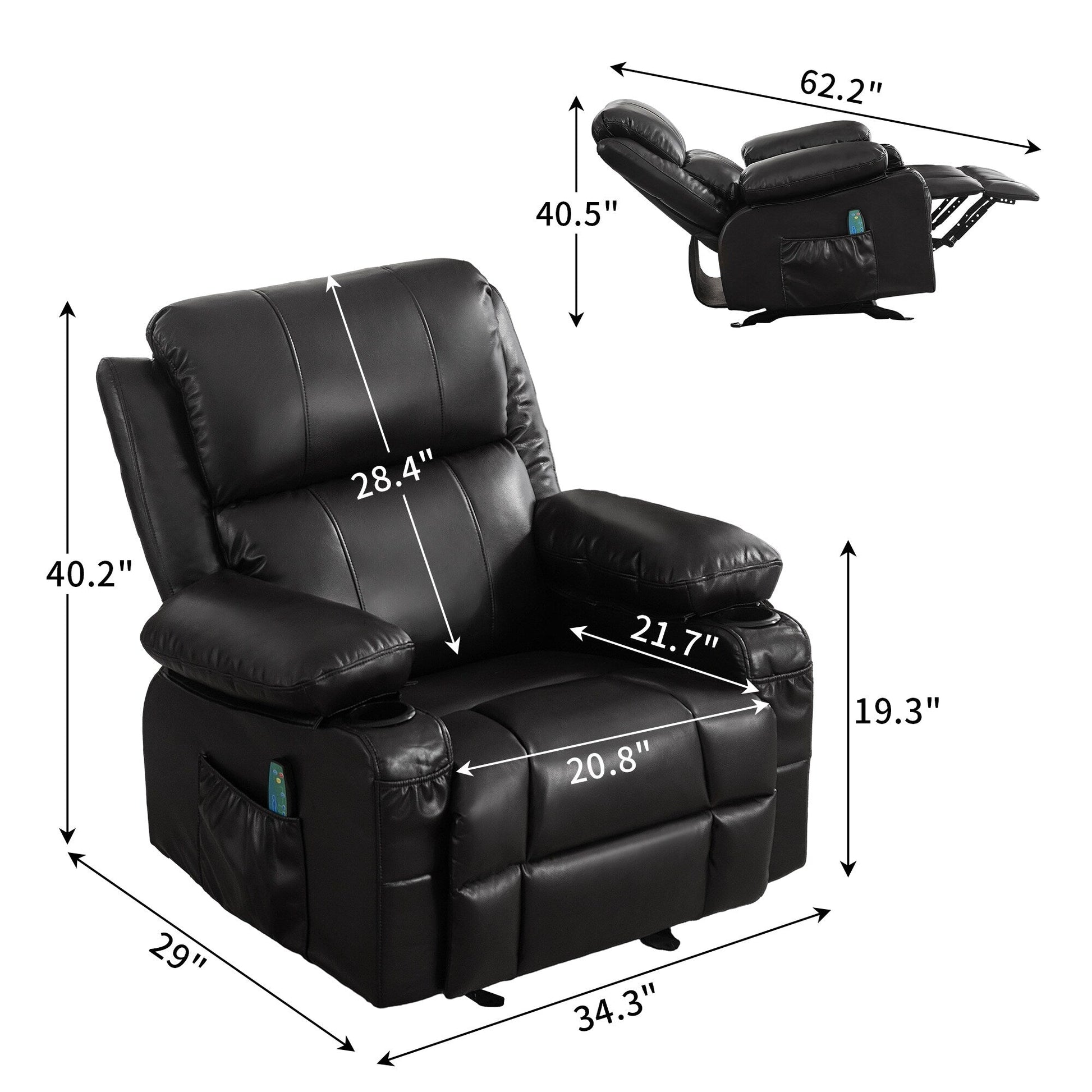 Fauteuil inclinable réglable noir avec massage, fonctions chauffantes, chargement USB, deux porte-gobelets et rangement latéral