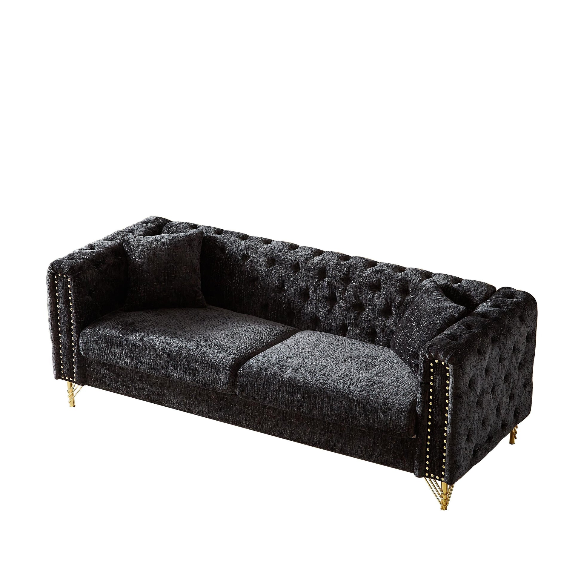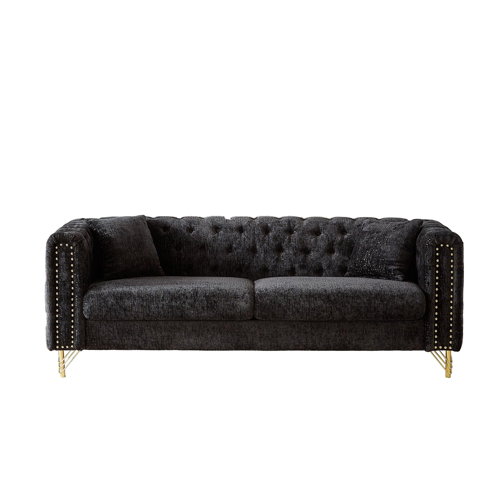 Canapé 3 places capitonné en chenille noire avec pieds en métal