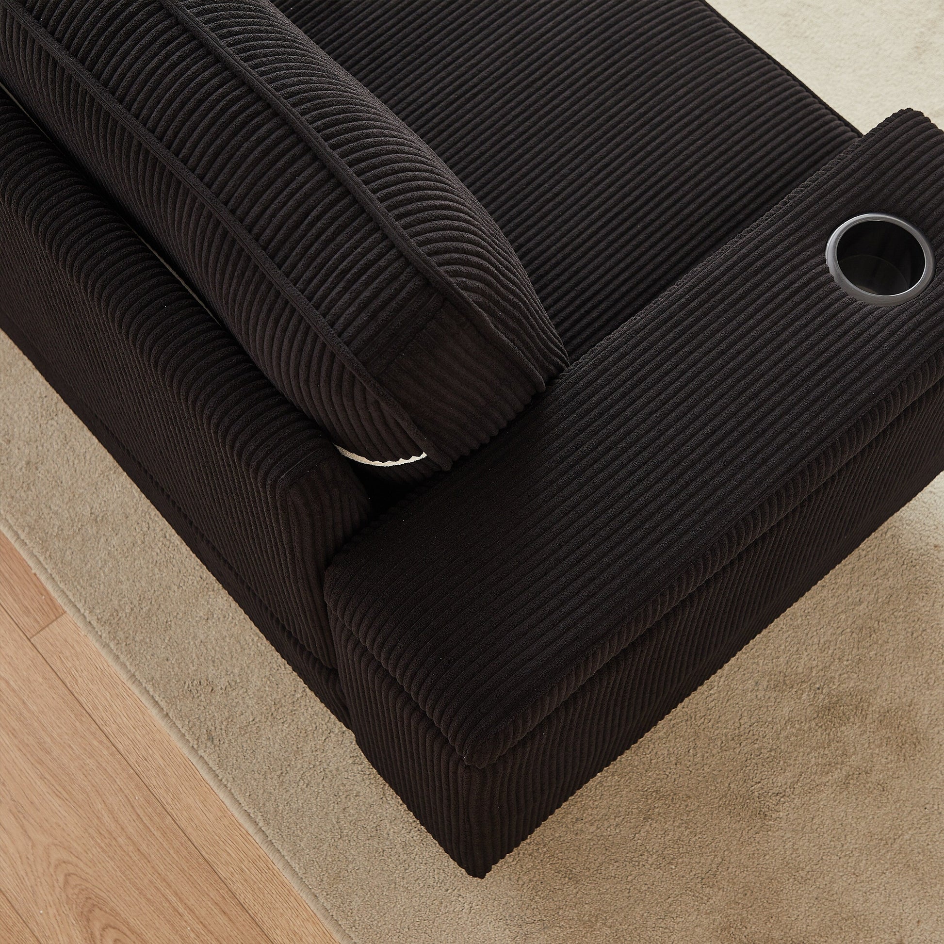 Canapé 3 places en velours côtelé noir moderne 86,5 avec deux espaces de rangement, ports de chargement USB et deux porte-gobelets