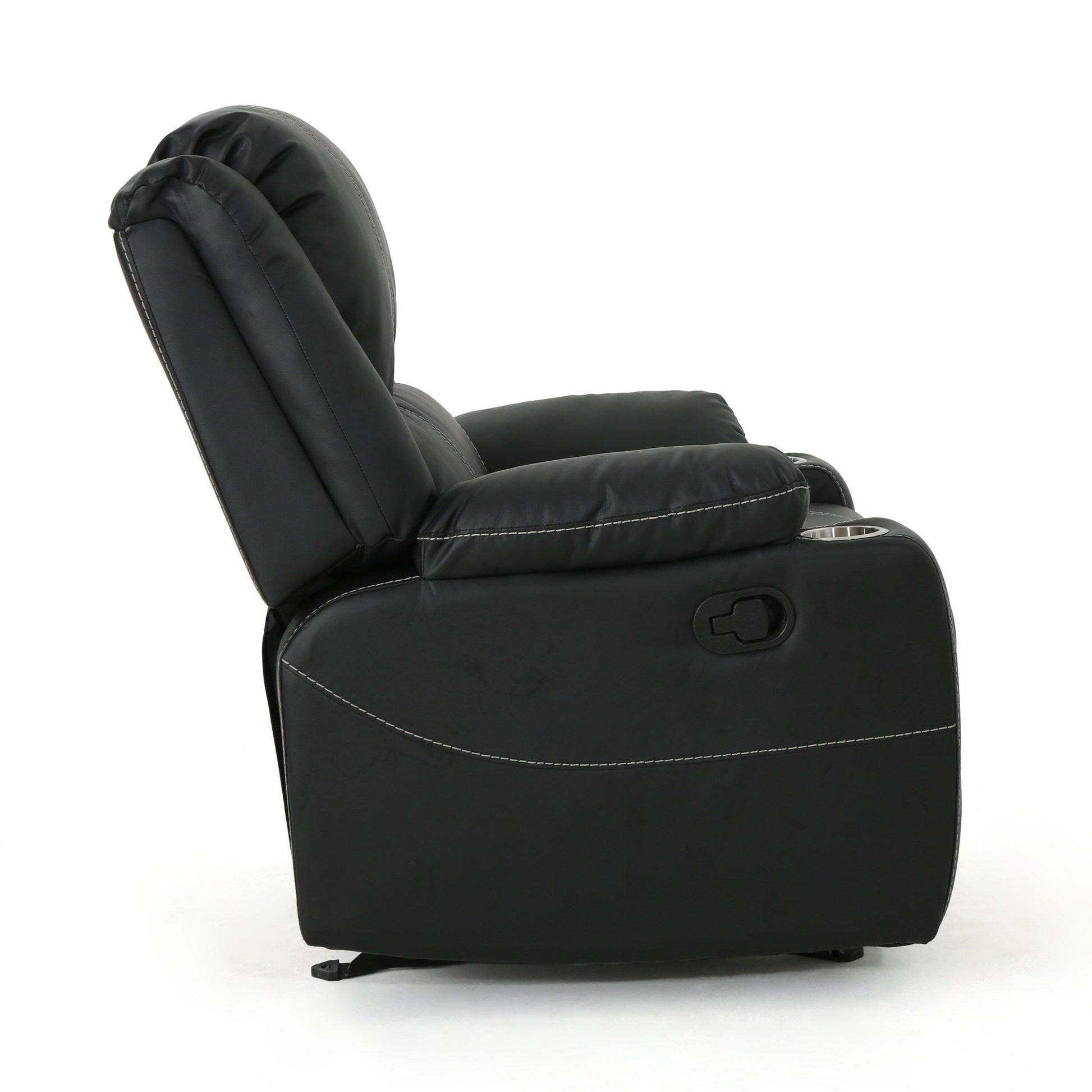 Fauteuil inclinable en cuir PU noir avec porte-gobelets en acier, mécanisme d'inclinaison facile et confort luxueux pour la détente