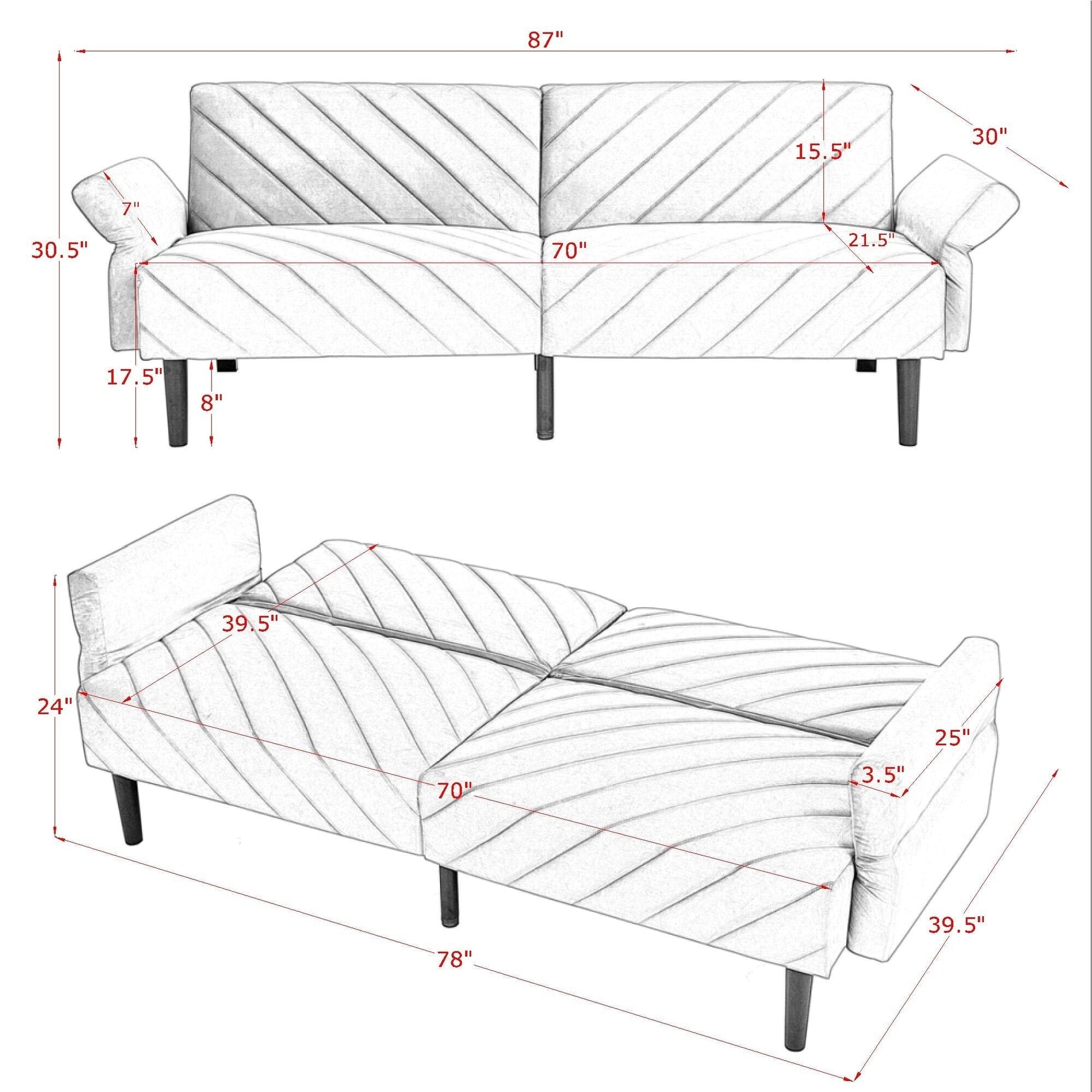 Sublimez votre espace de vie avec ce canapé-lit futon en velours, intemporel et polyvalent. Alliant lignes modernes et détails modernes du milieu du siècle, comme le capitonnage à chevrons et les pieds fuselés en plastique, ce meuble apporte une touche d'élégance à tout décor. Le revêtement en velours est non seulement élégant, mais offre également un confort et une durabilité accrus, vous permettant de profiter de sa douceur et de sa chaleur. Les accoudoirs et dossiers réglables multi-angles offrent un confort personnalisé, avec un dossier inclinable sur 6 positions (de 90° à 180°), idéal pour lire, se divertir ou dormir. Il suffit de tirer pour le transformer en canapé, lit ou fauteuil inclinable. Conçu pour une utilisation durable, le cadre en fer et bois massif assure une structure stable, tandis que la mousse haute densité offre un soutien ferme et confortable qui ne se déforme pas. Les accoudoirs réglables offrent un espace de couchage plus grand, vous permettant de vous allonger confortablement sur le canapé-lit au lieu de vous y blottir. Le couchage mesure 260 x 110 x 550 cm, offrant un espace de détente généreux.