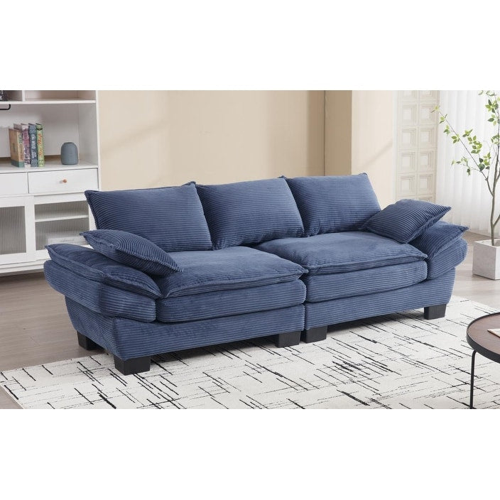- Il est doté d'un tissu en velours côtelé, d'un cadre en bois d'eucalyptus véritable et de larges pieds en plastique.