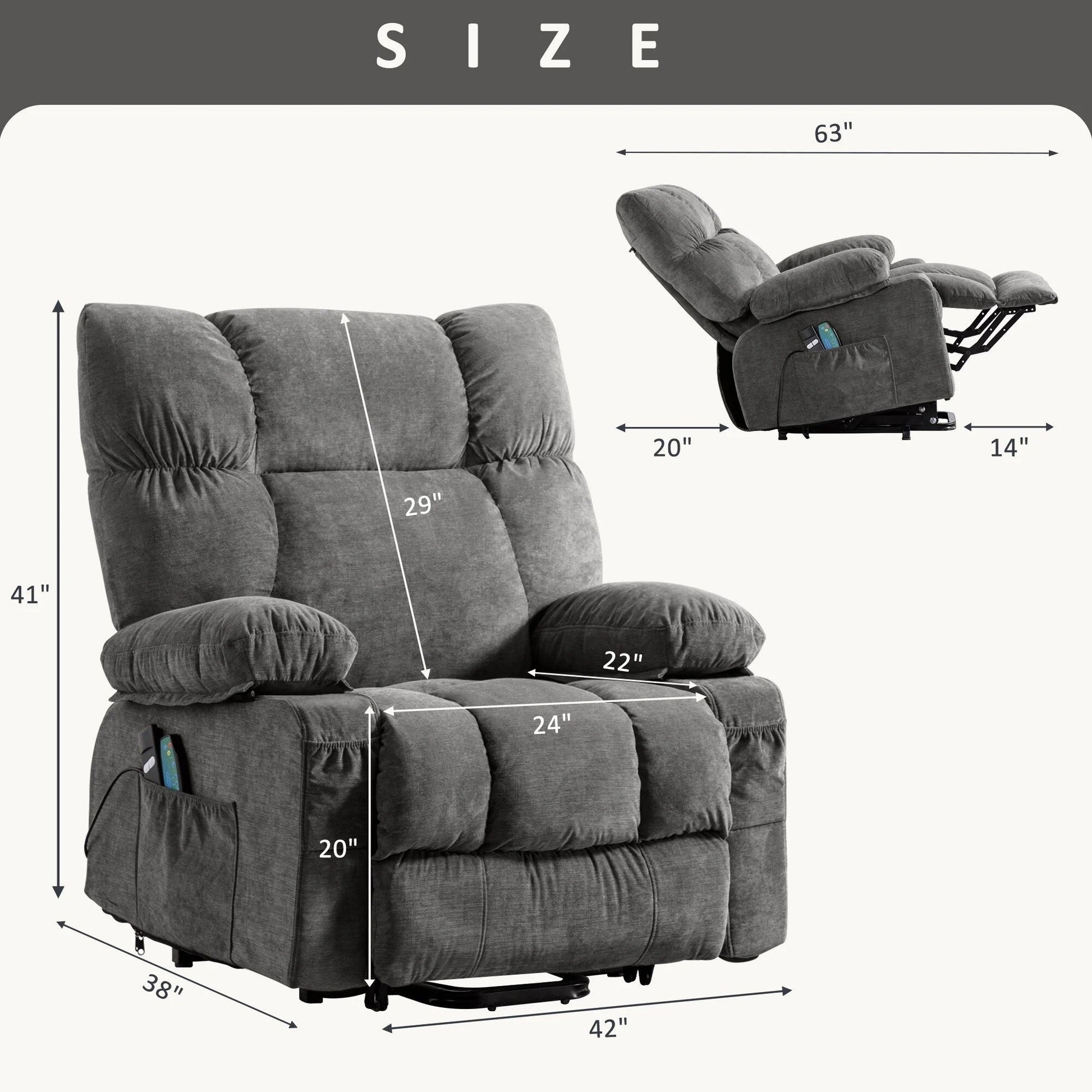 - [Conception pratique] : Ce fauteuil releveur électrique est équipé d'un câble de chargement USB pour recharger vos appareils en position assise ou allongée. Il dispose également de deux poches latérales pour ranger la télécommande ou des magazines, et de deux poches avant pour ranger votre téléphone ou autres petits objets. (Remarque : les ports USB sont réservés aux appareils basse consommation, comme les iPhones ou les iPads.)