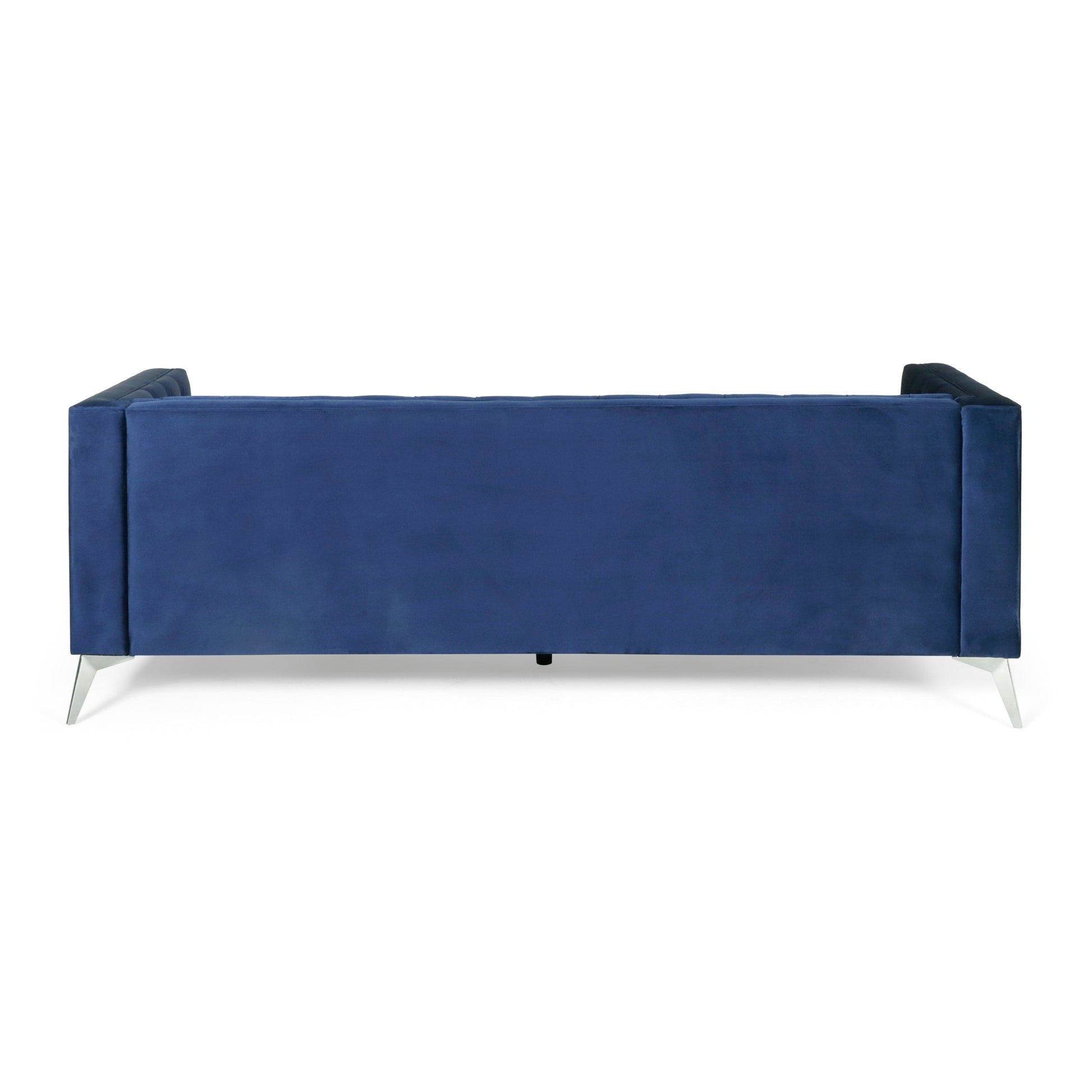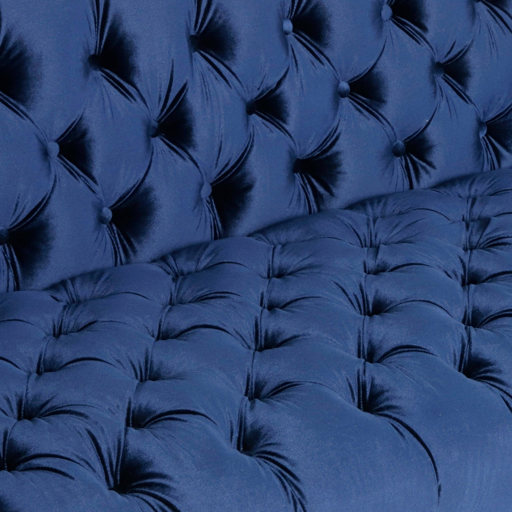 Canapé 3 places bleu moderne en similicuir 86,75 pouces, capitonné avec boutons et pieds en fer lisses en forme de T pour le salon