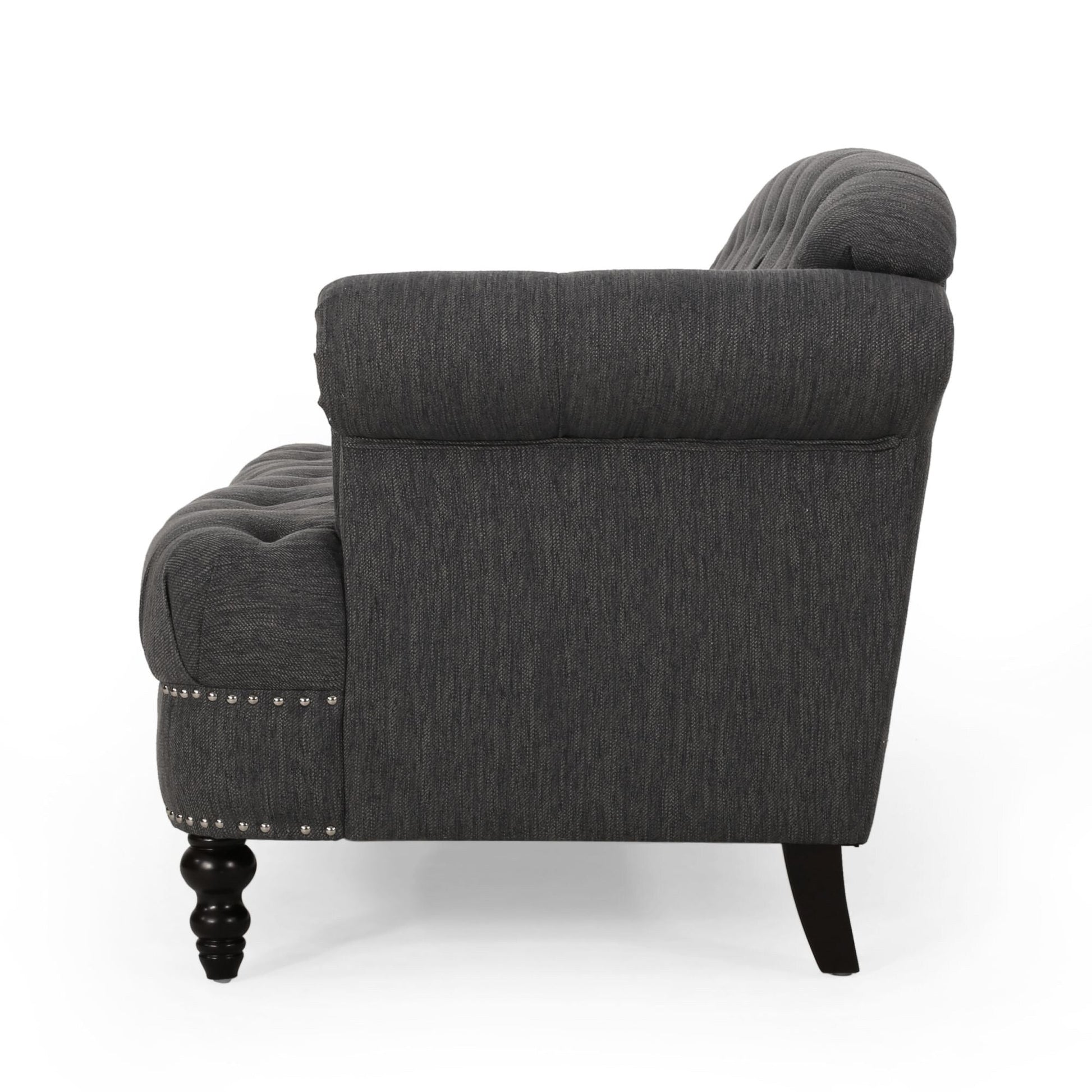 Canapé capitonné 3 places moderne 74, couleur charbon, avec tête de clou et pieds en bois pour le salon