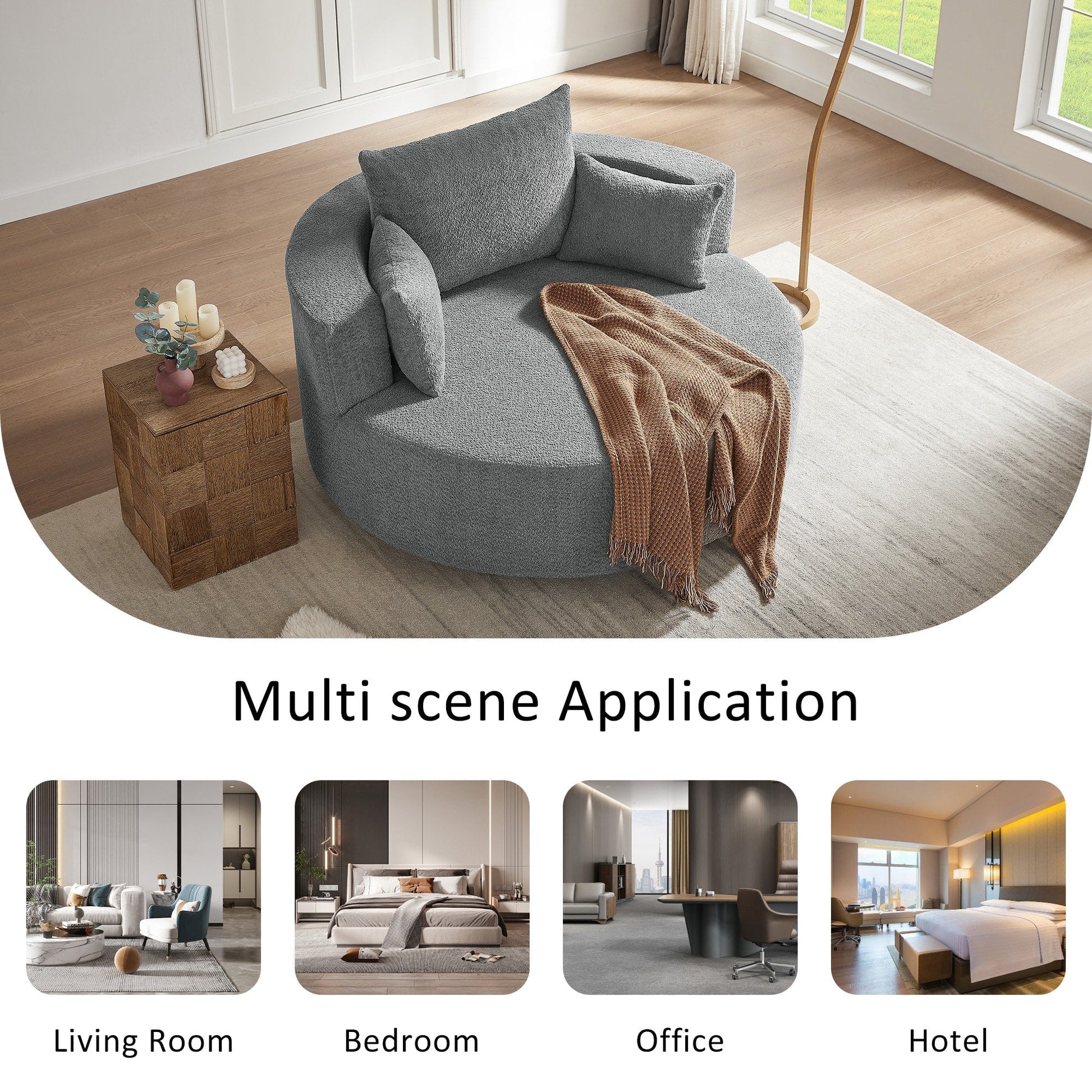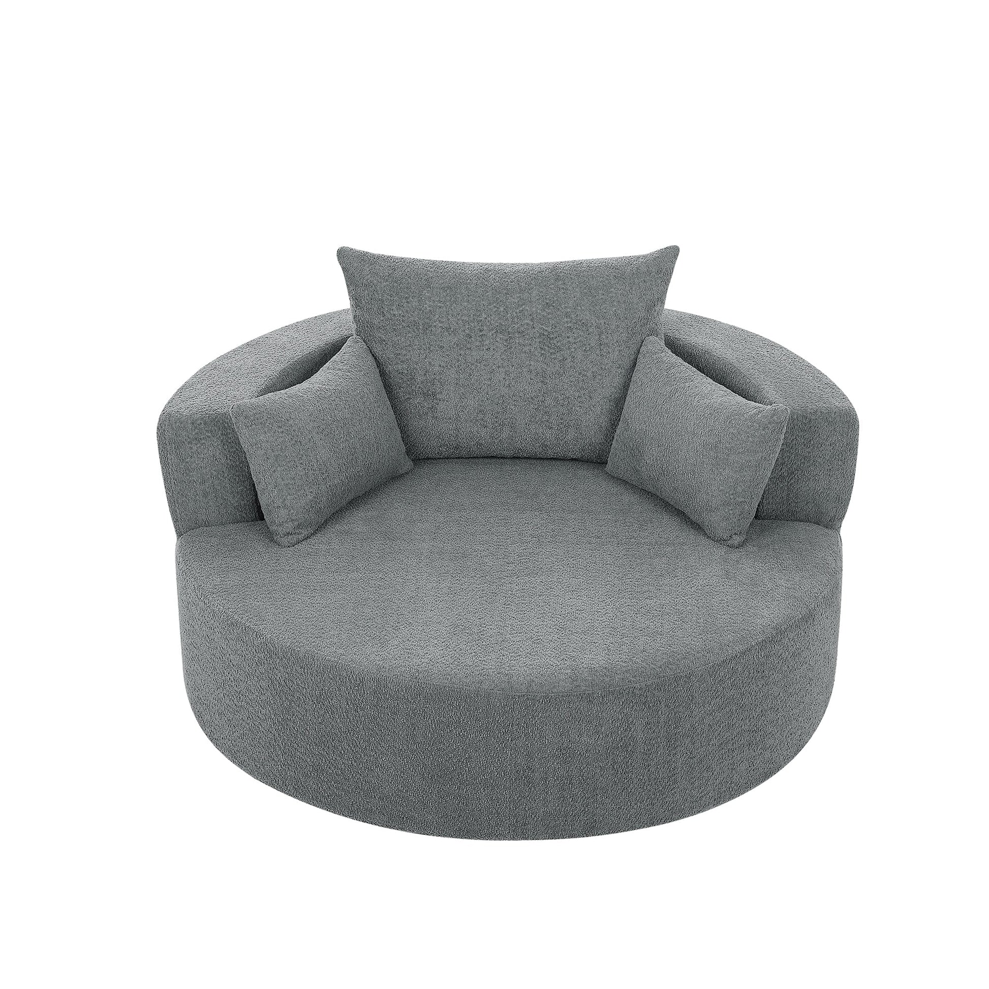 - Détendez-vous confortablement et avec style avec ce fauteuil pivotant à 360°, conçu avec un siège spacieux de 36,5 pouces de profondeur et trois oreillers amovibles.