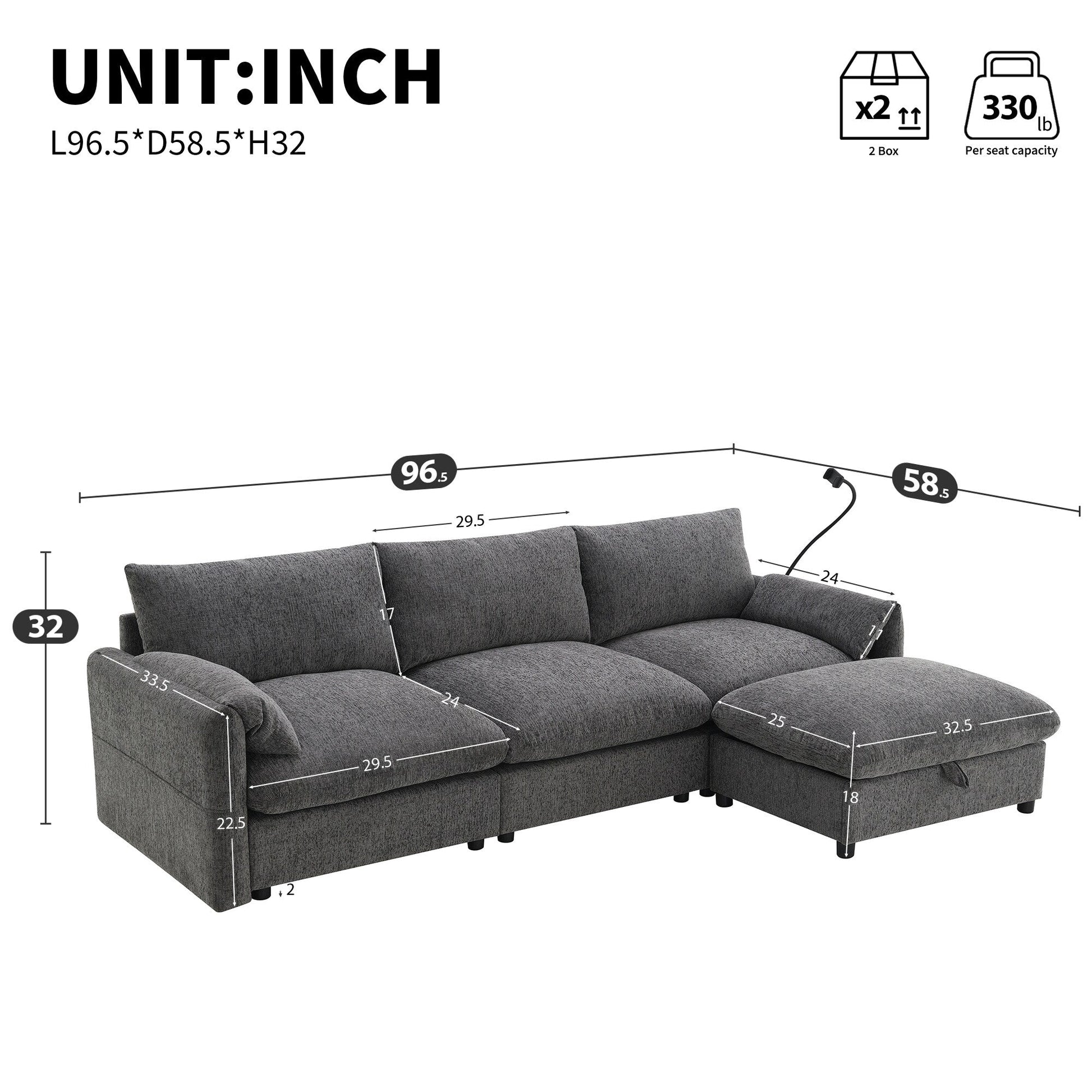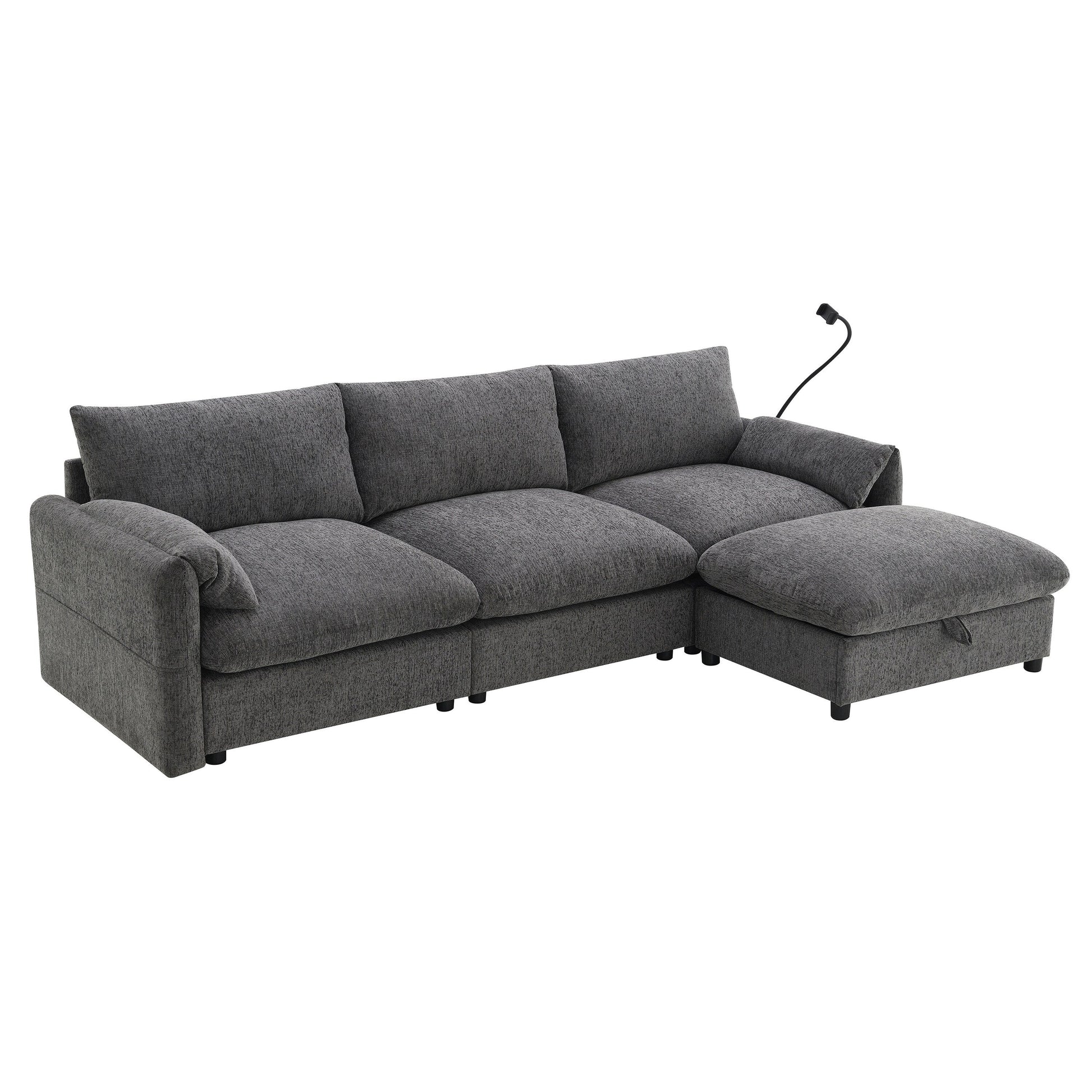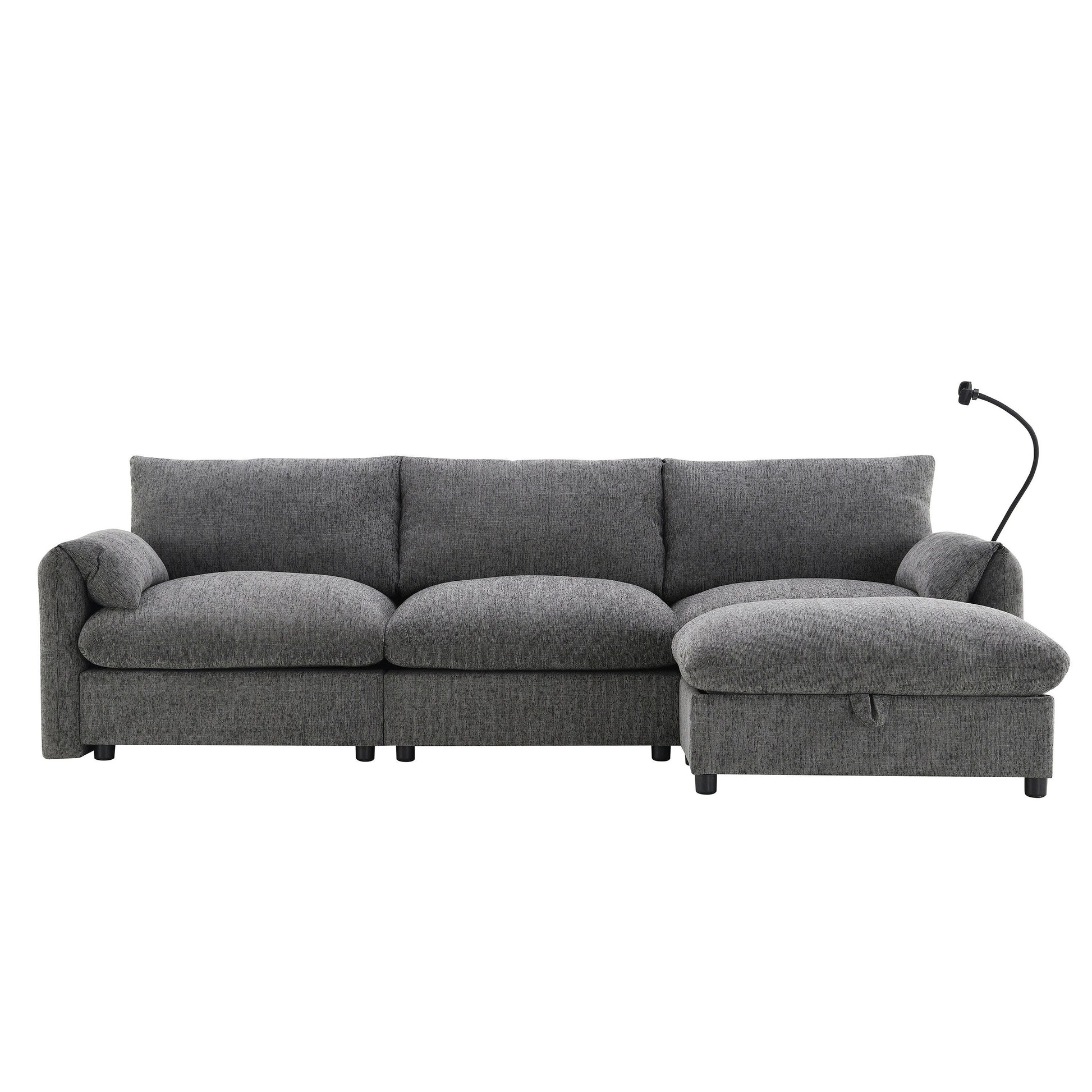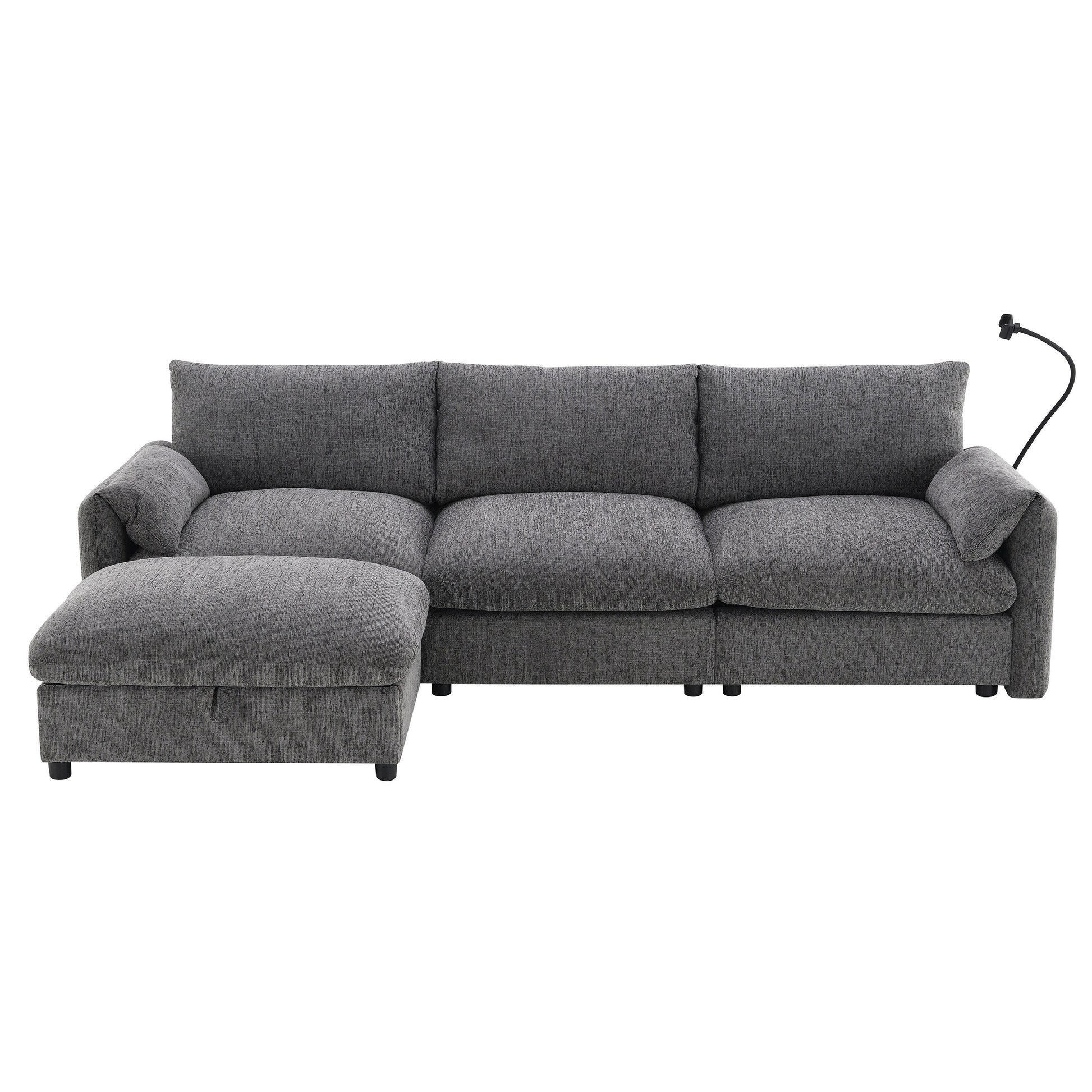 Canapé sectionnel en chenille avec pouf de rangement et poches, support de téléphone réglable, assise large, ensemble de canapé en L avec chargeur USB