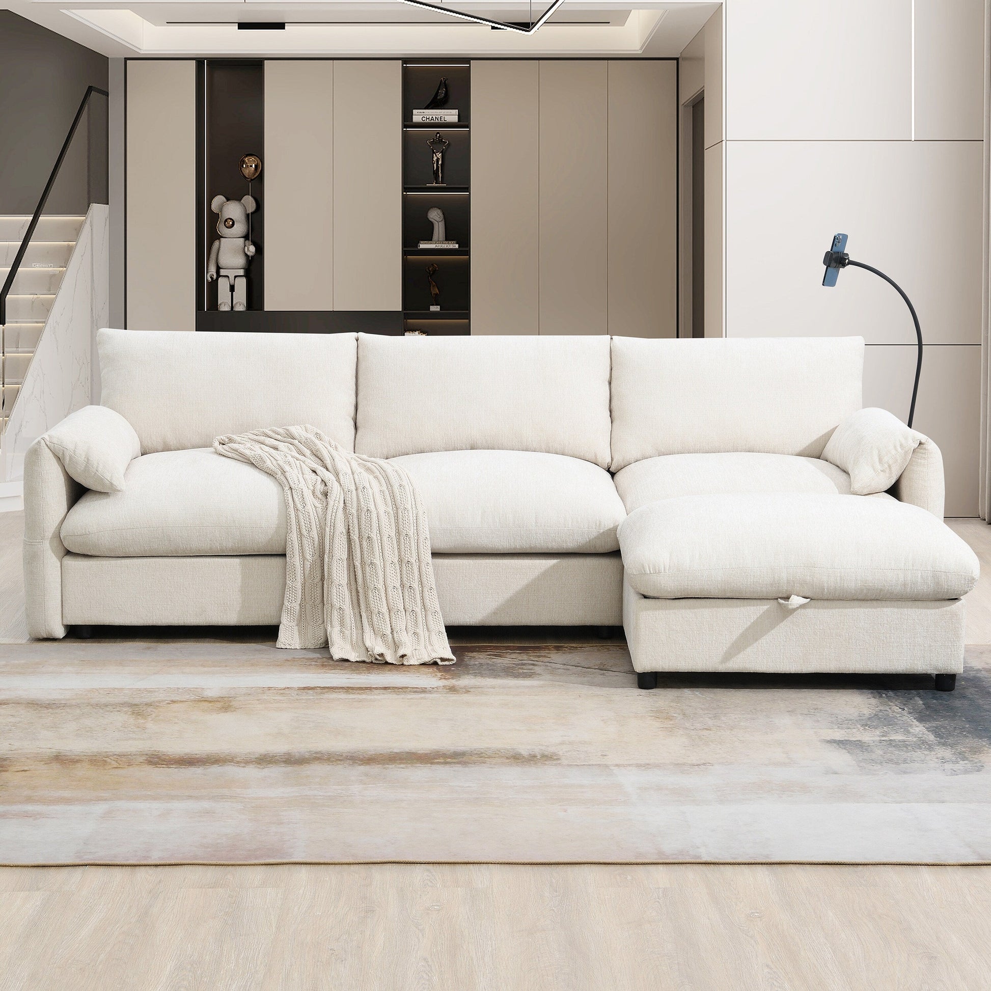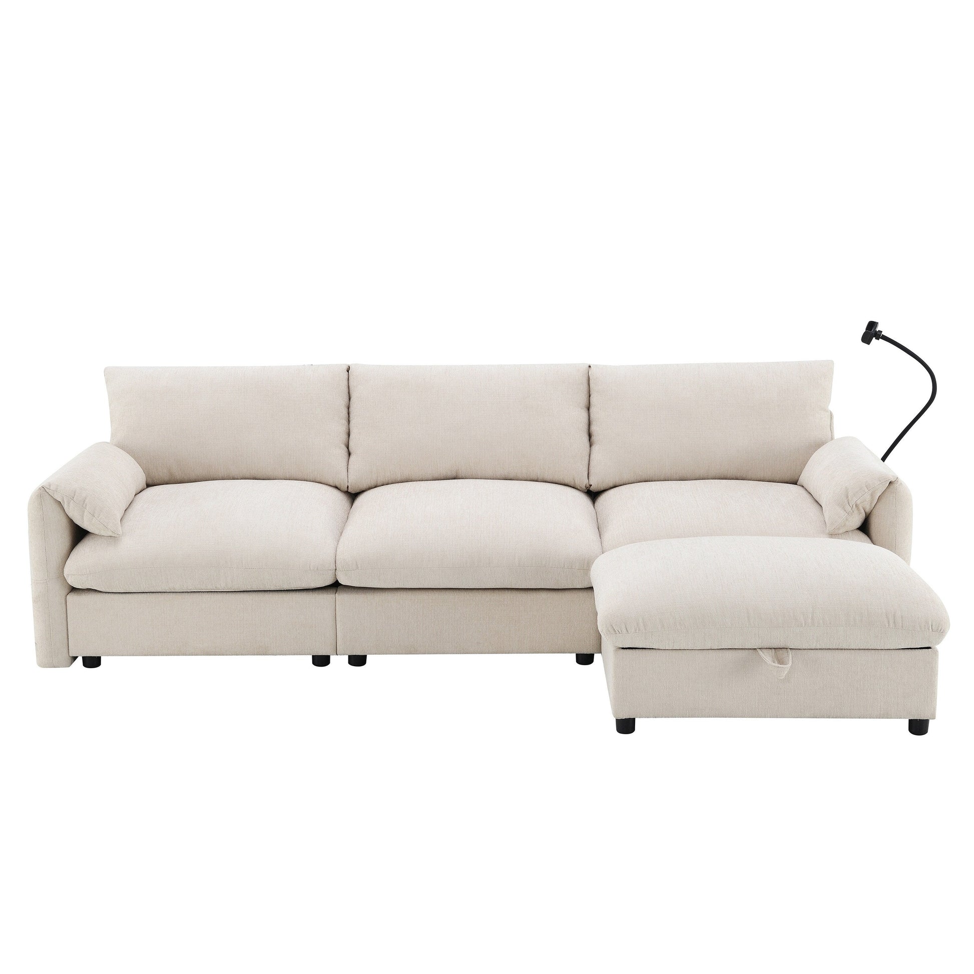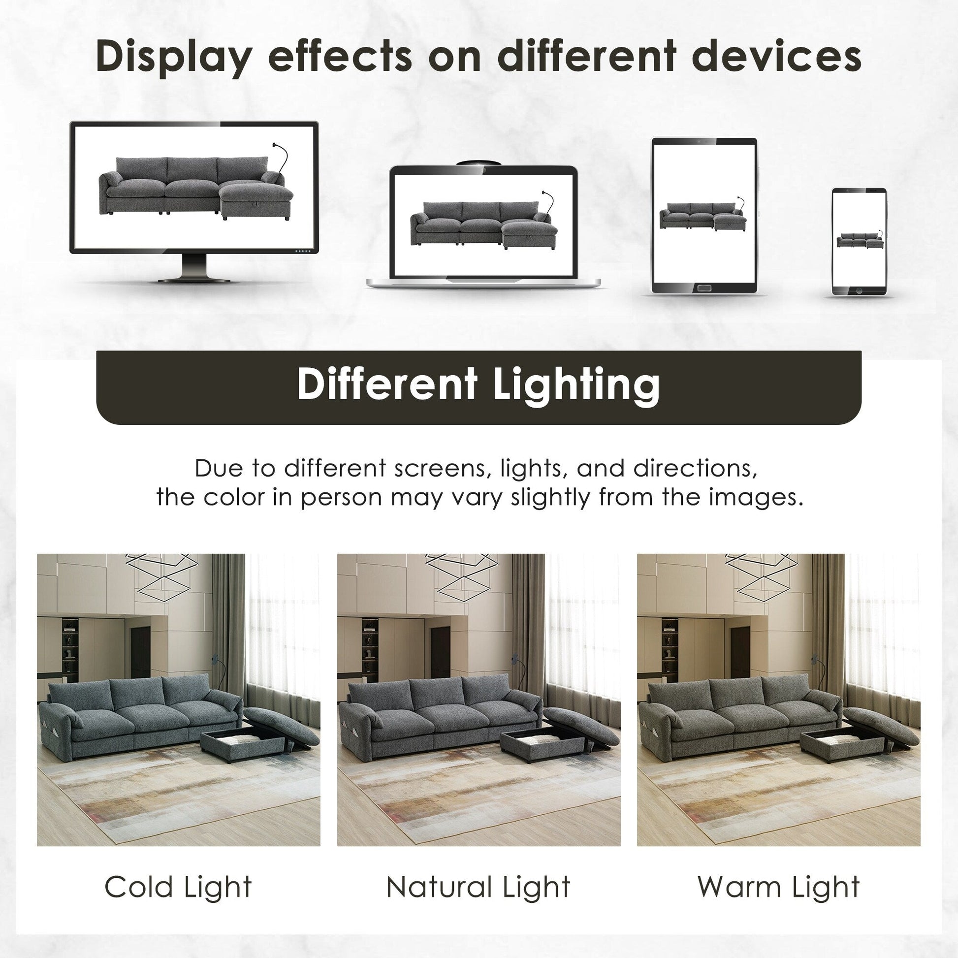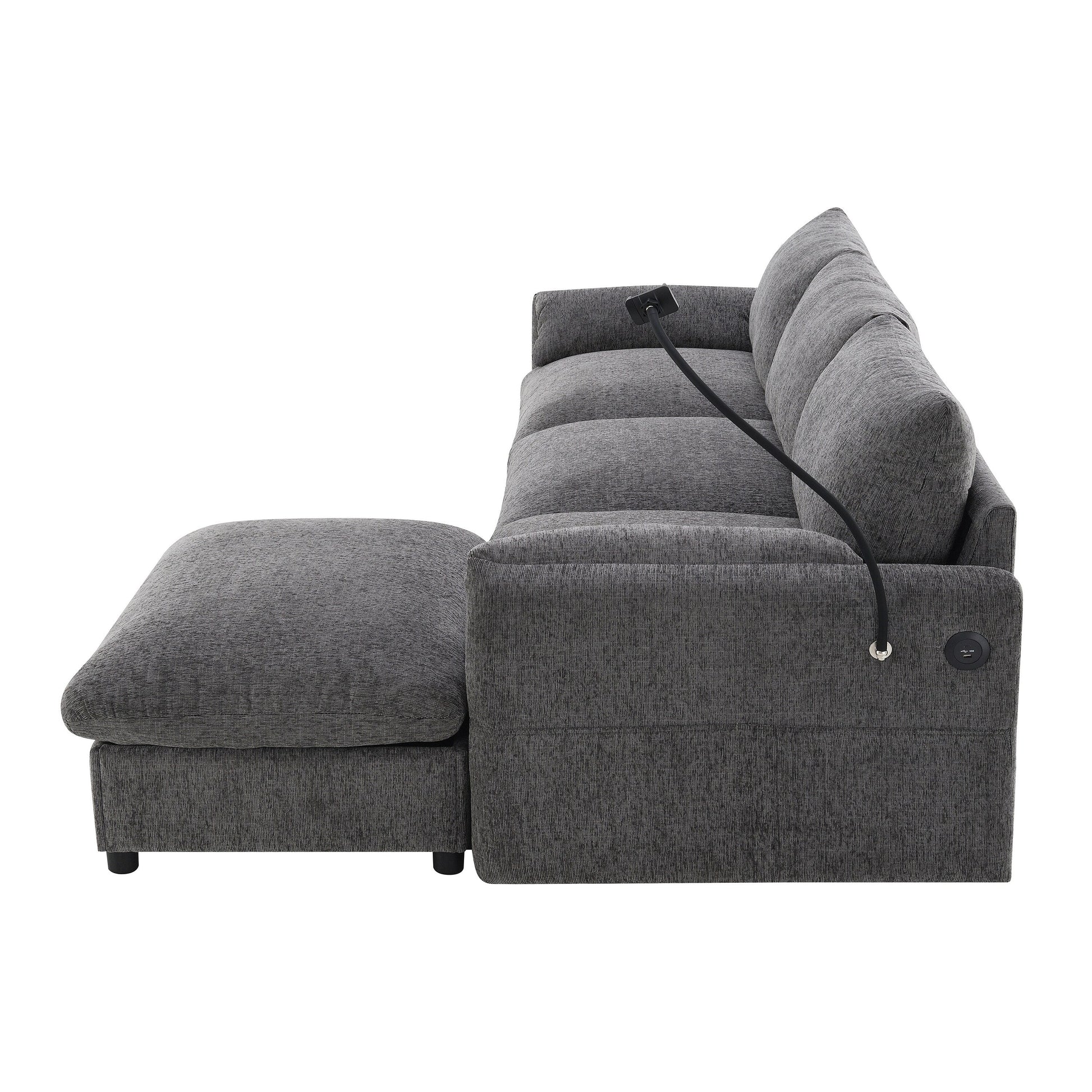 Canapé sectionnel en chenille avec pouf de rangement et poches, support de téléphone réglable, assise large, ensemble de canapé en L avec chargeur USB