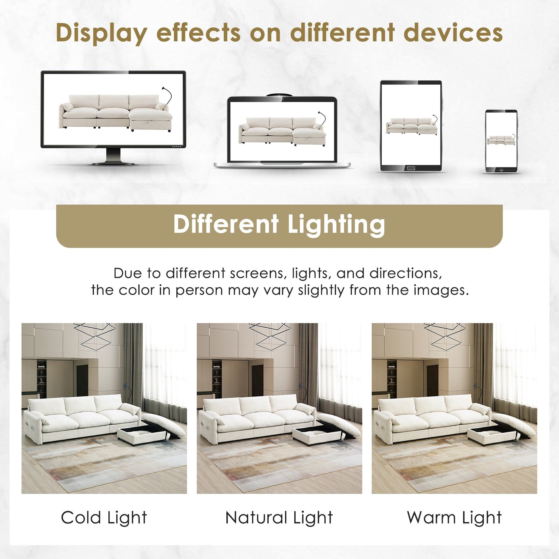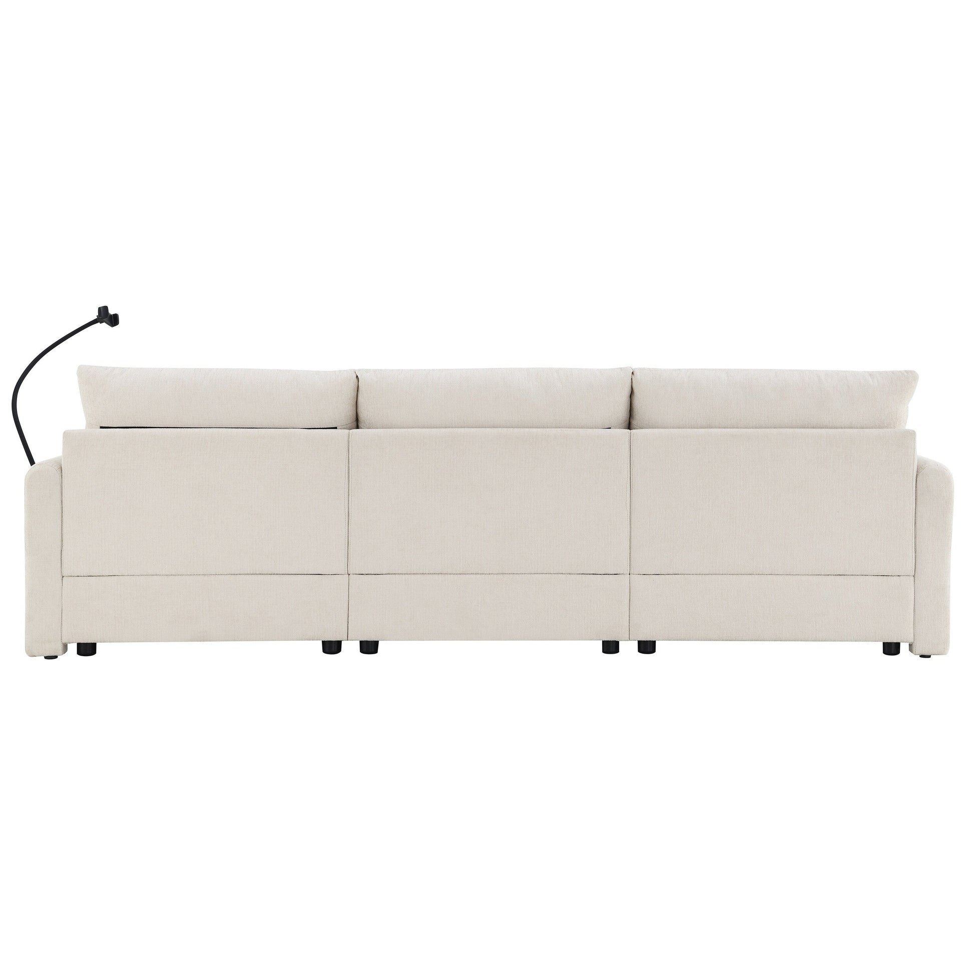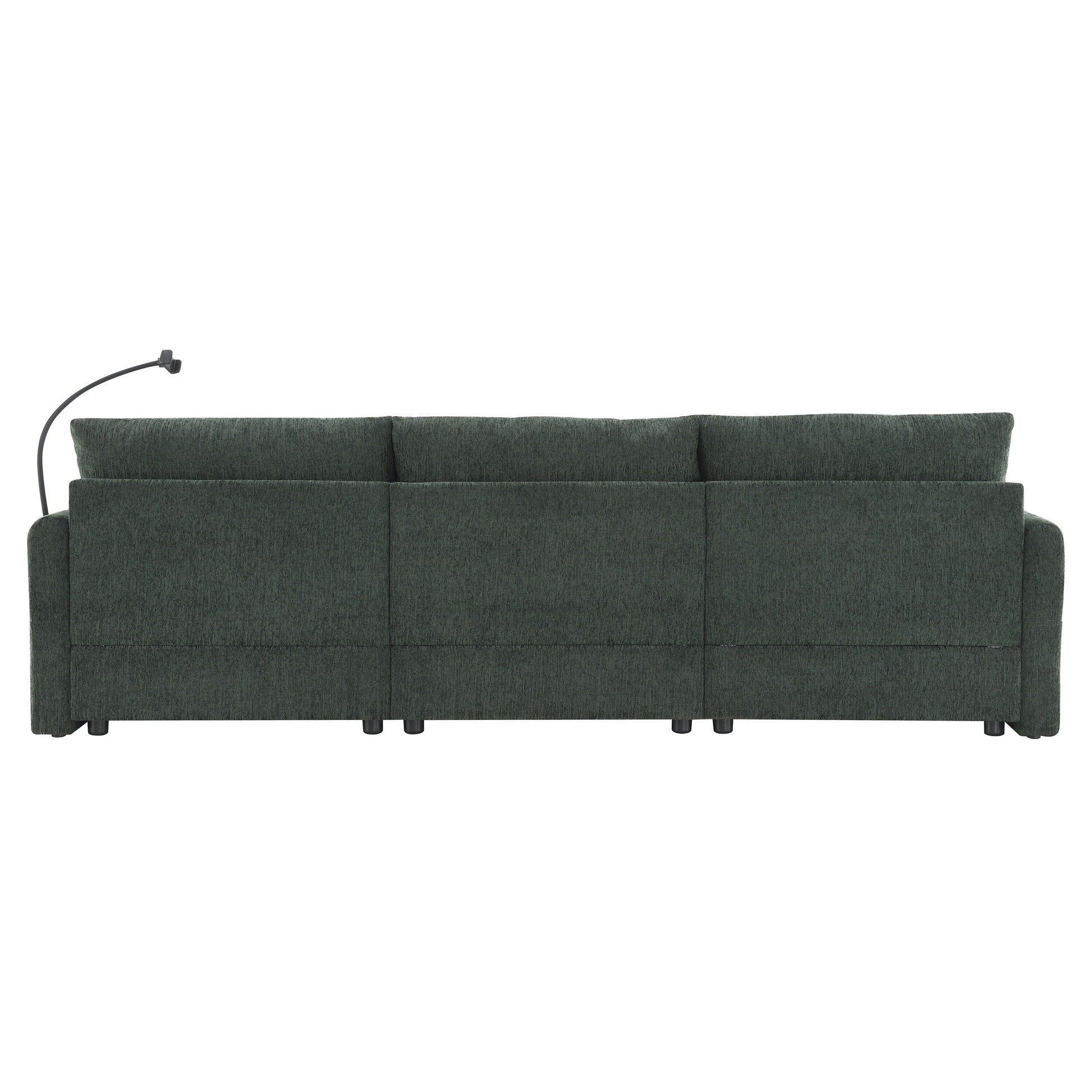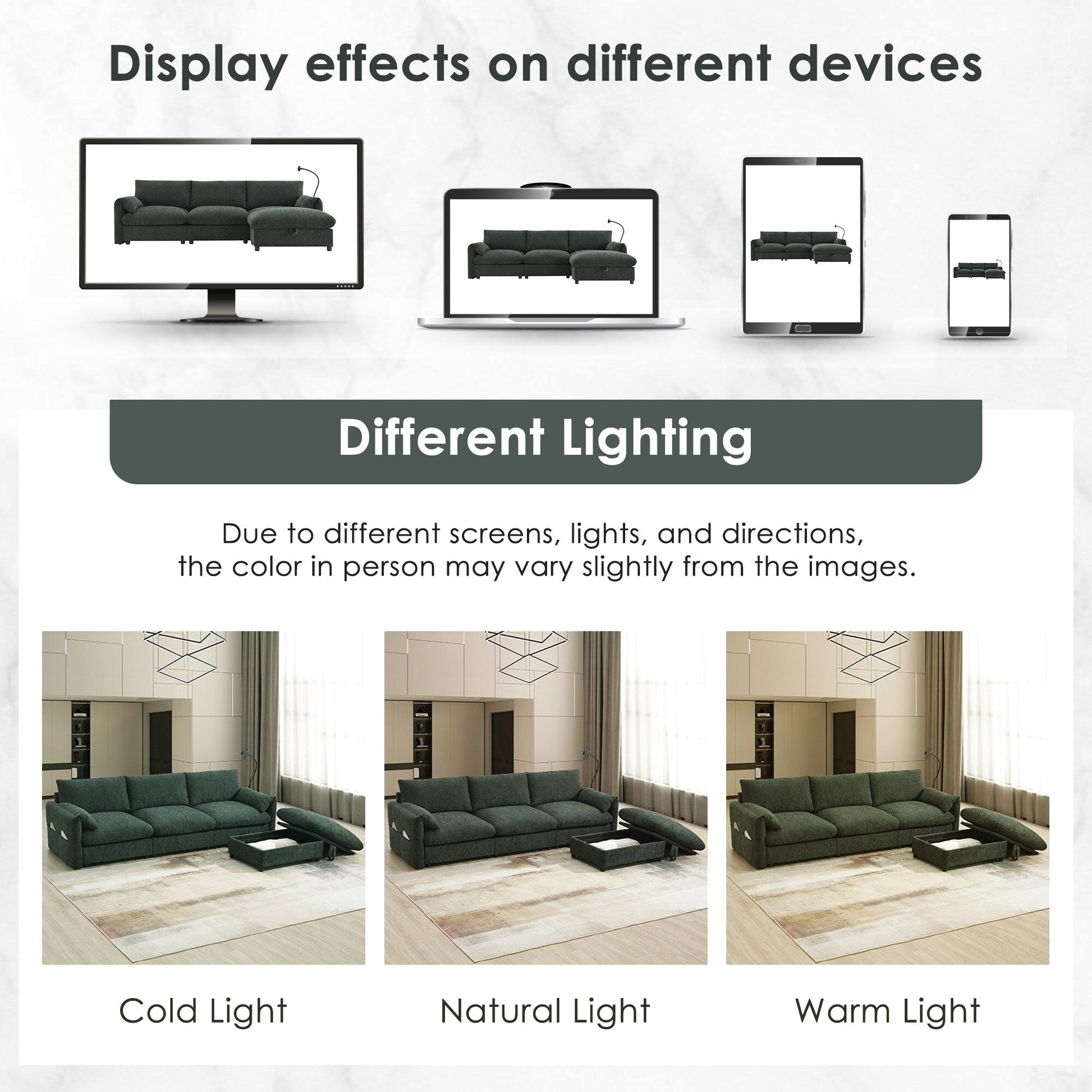 Canapé sectionnel en chenille avec pouf de rangement et poches, support de téléphone réglable, assise large, ensemble de canapé en L avec chargeur USB
