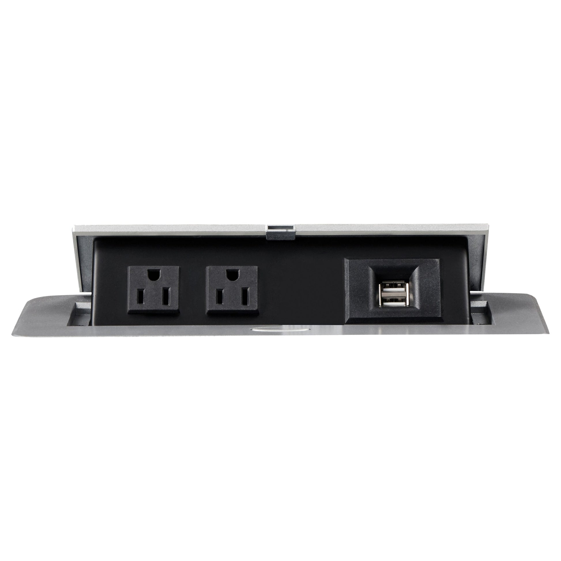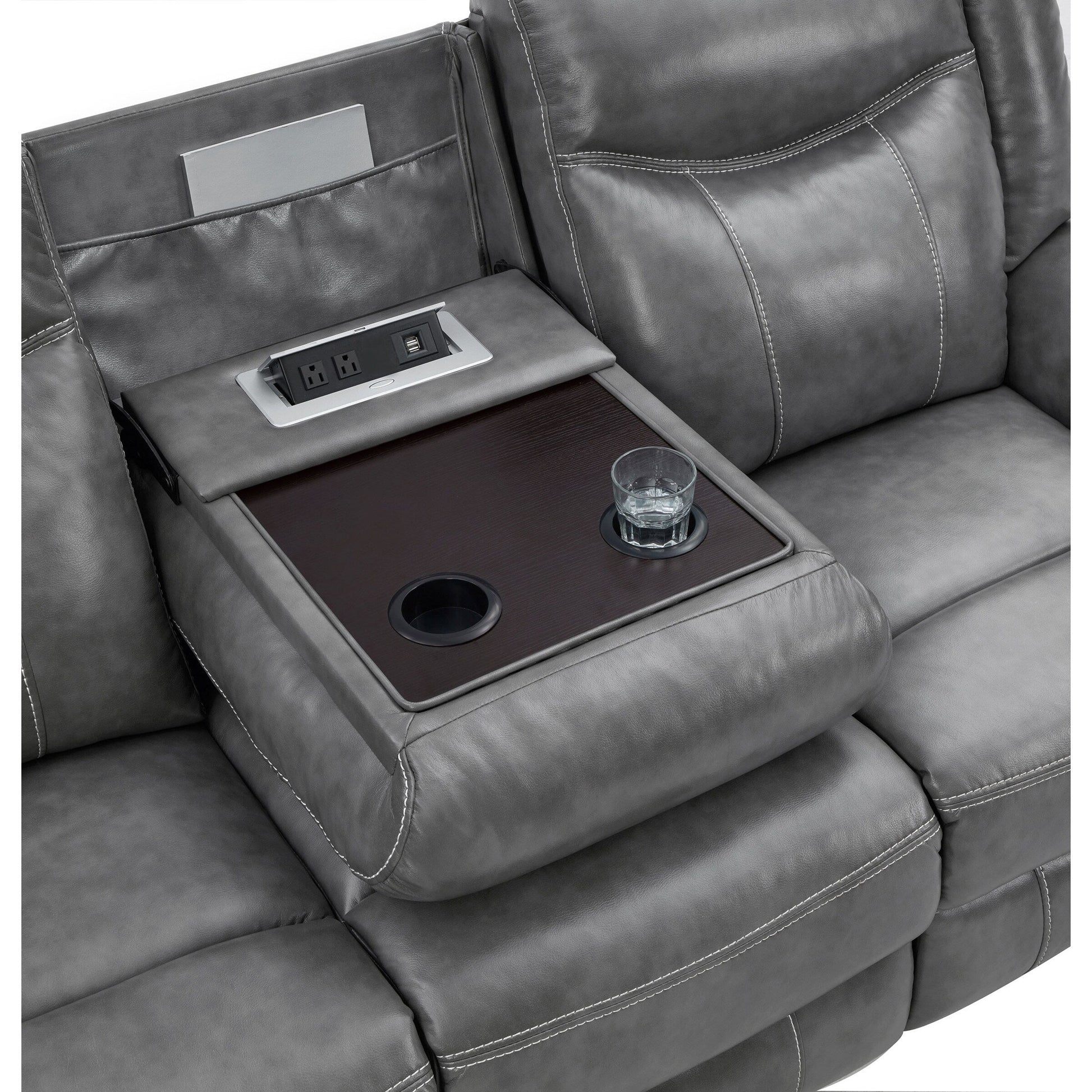 - Le canapé comprend une table rabattable avec une prise de courant escamotable (2AC/2USB), deux (2) porte-gobelets et un tiroir de rangement