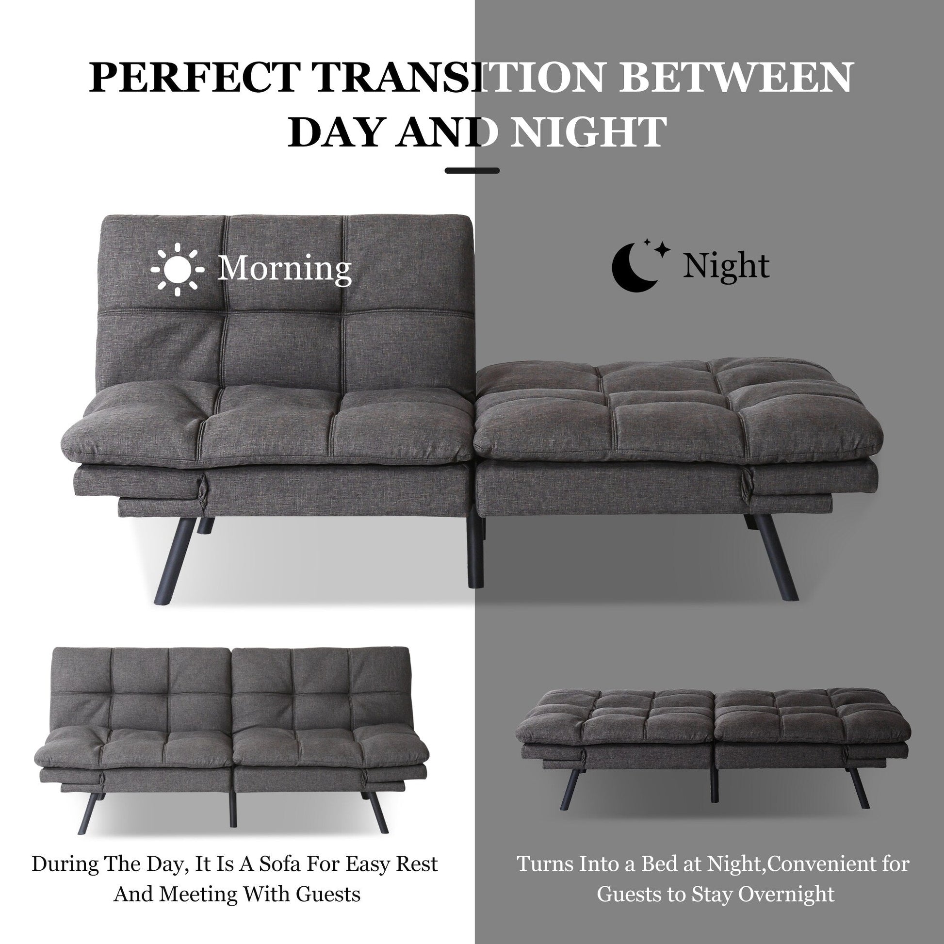 - Ce canapé-lit se transforme facilement d'un futon moderne en un lit douillet. Idéal pour les appartements, les bureaux, les chambres d'amis et les chambres à coucher, il répond à tous vos besoins, que vous ayez besoin d'un endroit pour vous détendre après une longue journée ou d'un lit pour vos invités. Avec son design élégant et sa fonctionnalité, il apporte charme et praticité à tout espace de vie.