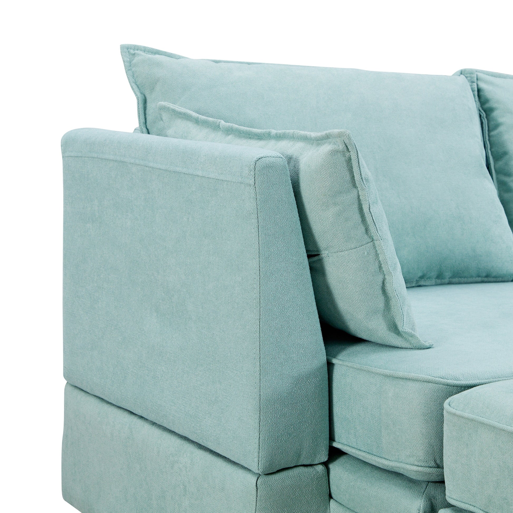 - Ce canapé modulable en U de 6 pièces offre une assise flexible grâce à ses modules amovibles et son pouf repositionnable selon vos besoins. Chaque siège dispose d'un espace de rangement dissimulé pour couvertures ou jouets. Revêtu de lin polyester avec un rembourrage en mousse souple et une structure en bois robuste, ce canapé allie confort et fonctionnalité.